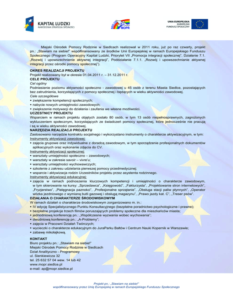 Miejski Ośrodek Pomocy Rodzinie w Siedlcach realizował w 2011 roku, już po raz czwarty, projekt pn.: „Stawiam na siebie!” współfinansowany ze środków Unii Europejskiej w ramach Europejskiego Funduszu Społecznego (Program Operacyjny Kapitał Ludzki, Priorytet VII „Promocja integracji społecznej”, Działanie 7.1. „Rozwój i upowszechnienie aktywnej integracji”, Poddziałanie 7.1.1. „Rozwój i upowszechnianie aktywnej integracji przez ośrodki pomocy społecznej”). OKRES REALIZACJI PROJEKTU Projekt realizowany był w okresie 01.04.2011 r. – 31.12.2011 r. CELE PROJEKTU Cel ogólny Podniesienie poziomu aktywności społeczno - zawodowej u 45 osób z terenu Miasta Siedlce, pozostających bez zatrudnienia, korzystających z pomocy społecznej i będących w wieku aktywności zawodowej. Cele szczegółowe zwiększenie kompetencji społecznych; nabycie nowych umiejętności zawodowych; zwiększenie motywacji do działania i zaufania we własne możliwości. UCZESTNICY PROJEKTU Wsparciem w ramach projektu objętych zostało 80 osób, w tym 13 osób niepełnosprawnych, zagrożonych wykluczeniem społecznym, korzystających ze świadczeń pomocy społecznej, które jednocześnie nie pracują i są w wieku aktywności zawodowej. NARZĘDZIA REALIZACJI PROJEKTU Zastosowano narzędzie kontraktu socjalnego i wykorzystano instrumenty o charakterze aktywizacyjnym, w tym: Instrumenty aktywizacji zawodowej: zajęcia grupowe oraz indywidualne z doradcą zawodowym, w tym sporządzenie profesjonalnych dokumentów aplikacyjnych oraz wykonanie zdjęcia do CV. Instrumenty aktywizacji społecznej: warsztaty umiejętności społeczno – zawodowych; warsztaty w zakresie savoir – vivre’u; warsztaty umiejętności wychowawczych; szkolenie z zakresu udzielania pierwszej pomocy przedmedycznej; wsparcie i aktywizacja rodzin Uczestników projektu przez asystenta rodzinnego. Instrumenty aktywizacji edukacyjnej: zajęcia w ramach podnoszenia kluczowych kompetencji i umiejętności o charakterze zawodowym, w tym skierowanie na kursy: „Sprzedawca”, „Księgowość”, „Fakturzysta”, „Projektowanie stron internetowych”, „Fryzjerstwo”, „Pielęgnacja paznokci”, „Profesjonalne sprzątanie”, „Obsługa stacji paliw płynnych”, „Operator wózka jezdniowego z wymianą butli gazowej i obsługą magazynu”, „Prawo jazdy kat. C”, „Treser psów”. DZIAŁANIA O CHARAKTERZE ŚRODOWISKOWYM W ramach działań o charakterze środowiskowym zorganizowano m. in.: IV edycję Specjalistycznego Punktu Konsultacyjnego (bezpłatne poradnictwo psychologiczne i prawne); bezpłatne projekcje trzech filmów poruszających problemy społeczne dla mieszkańców miasta; jednodniową konferencję pn.: „Współczesne wyzwania wobec wychowania”; dwudniową konferencję pn.: „A-Problemy”; zajęcia w Pracowni Działań Twórczych; wycieczki o charakterze edukacyjnym do JuraParku Bałtów i Centrum Nauki Kopernik w Warszawie; zabawę mikołajkową. KONTAKT Biuro projektu pn.: „Stawiam na siebie!” Miejski Ośrodek Pomocy Rodzinie w Siedlcach Dział Analityczno - Programowy ul. Sienkiewicza 32 tel. 25 632 57 04 wew. 14 lub 42 www.mopr.siedlce.pl e-mail: [email protected] Projekt pn.: „Stawiam na siebie!” współfinansowany przez Unię Europejską w ramach Europejskiego Funduszu Społecznego