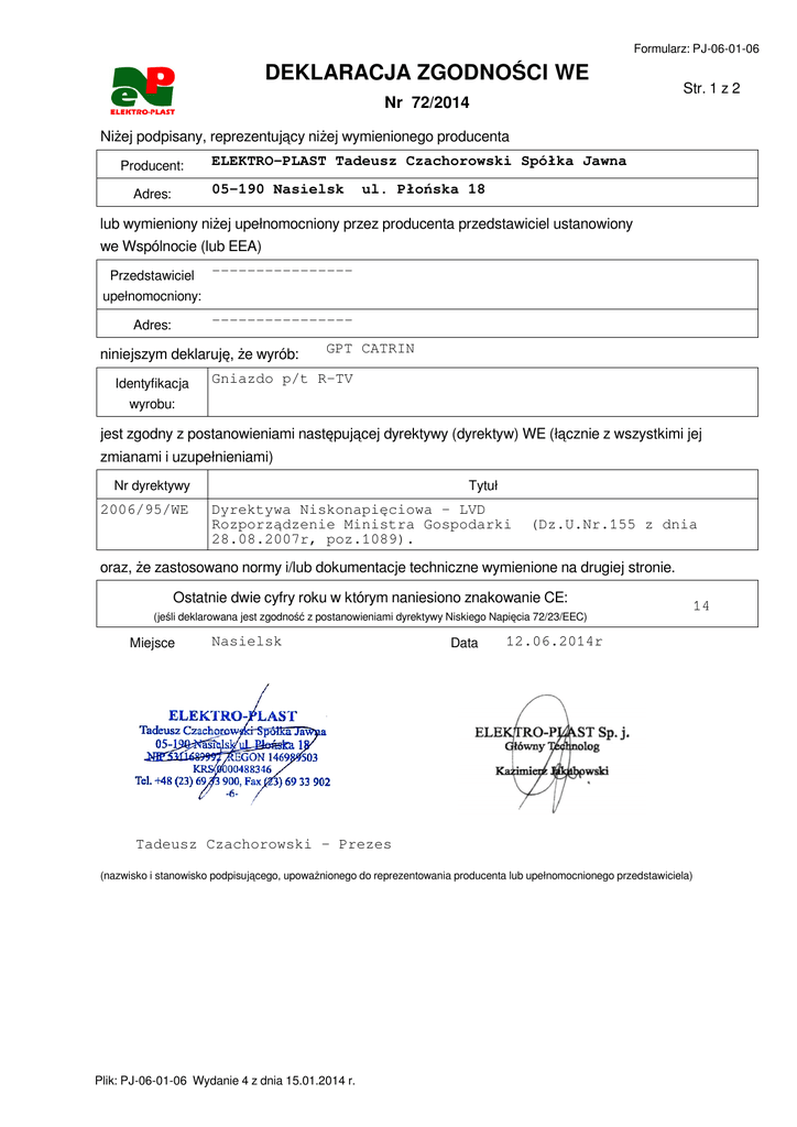 Formularz: PJ-06-01-06 DEKLARACJA ZGODNOŚCI WE Nr 72/2014 Str. 1 z 2 Niżej podpisany, reprezentujący niżej wymienionego producenta Producent: ELEKTRO-PLAST Tadeusz Czachorowski Spółka Jawna 05-190 Nasielsk Adres: ul. Płońska 18 lub wymieniony niżej upełnomocniony przez producenta przedstawiciel ustanowiony we Wspólnocie (lub EEA) Przedstawiciel ---------------- upełnomocniony: ---------------- Adres: niniejszym deklaruję, że wyrób: Identyfikacja GPT CATRIN Gniazdo p/t R-TV wyrobu: jest zgodny z postanowieniami następującej dyrektywy (dyrektyw) WE (łącznie z wszystkimi jej zmianami i uzupełnieniami) Nr dyrektywy 2006/95/WE Tytuł Dyrektywa Niskonapięciowa – LVD Rozporządzenie Ministra Gospodarki 28.08.2007r, poz.1089). (Dz.U.Nr.155 z dnia oraz, że zastosowano normy i/lub dokumentacje techniczne wymienione na drugiej stronie. Ostatnie dwie cyfry roku w którym naniesiono znakowanie CE: (jeśli deklarowana jest zgodność z postanowieniami dyrektywy Niskiego Napięcia 72/23/EEC) Miejsce Nasielsk Data 12.06.2014r Tadeusz Czachorowski – Prezes (nazwisko i stanowisko podpisującego, upoważnionego do reprezentowania producenta lub upełnomocnionego przedstawiciela) Plik: PJ-06-01-06 Wydanie 4 z dnia 15.01.2014 r. 14 Formularz: PJ-06-01-06 DEKLARACJA ZGODNOŚCI WE Nr 72/2014 Str. 2 z 2 Normy i/lub dokumentacje techniczne lub ich części zastosowane do wyrobu, którego dotyczy niniejsza deklaracja zgodności: - normy zharmonizowane: Nr Wydanie PN-EN 50173:1 2011 PN-EN 50083 2012 Tytuł ) Część* Technika informatyczna. Systemy okablowania strukturalnego. Gniazda abonenckie końcowe przeznaczone do stosowania w sieciach telekomunikacyjnych, w tym telewizji kablowej - inne normy i/lub dokumentacje techniczne: Nr Wydanie Tytuł Inne dokumenty nie występują - inne rozwiązania techniczne, szczegóły, które zostały włączone do dokumentacji technicznej lub konstrukcyjnej: GPT GPT GPT GPT GPT GPT GPT GPT GPT GPT GPT GPT GPT GPT CATRIN CATRIN CATRIN CATRIN CATRIN CATRIN CATRIN CATRIN CATRIN CATRIN CATRIN CATRIN CATRIN CATRIN R-TV końcowe białe z/R Nr. Kat. 2152-00 R-TV końcowe białe b/R Nr. Kat. 2152-10 R-TV 10dB białe z/R Nr. Kat. 2154-00 R-TV 10dB białe b/R Nr. Kat. 2154-10 R-TV 14dB białe z/R Nr. Kat. 2155-00 R-TV 14dB białe b/R Nr. Kat. 2155-10 R-TV 16dB białe z/R Nr. Kat. 2156-00 R-TV 16dB białe b/R Nr. Kat. 2156-10 R-TV zakończeniowe białe z/R Nr. Kat. 2162-00 R-TV zakończeniowe białe b/R Nr. Kat. 2162-10 TV typ F-F białe z/R Nr. Kat. 2186-00 TV typ F-F białe b/R Nr. Kat. 2186-10 2xTV typ F-F białe z/R Nr. Kat. 2187-00 2xTV typ F-F białe b/R Nr. Kat. 2187-10 - inne dokumenty lub informacje wymagane właściwą dyrektywą (dyrektywami) WE: Inne dokumenty nie występują *) Należy wypełnić w przypadku powoływania się na części lub rozdziały normy lub dokumentacji technicznej Plik: PJ-06-01-06 Wydanie 4 z dnia 15.01.2014 r. ) Część*