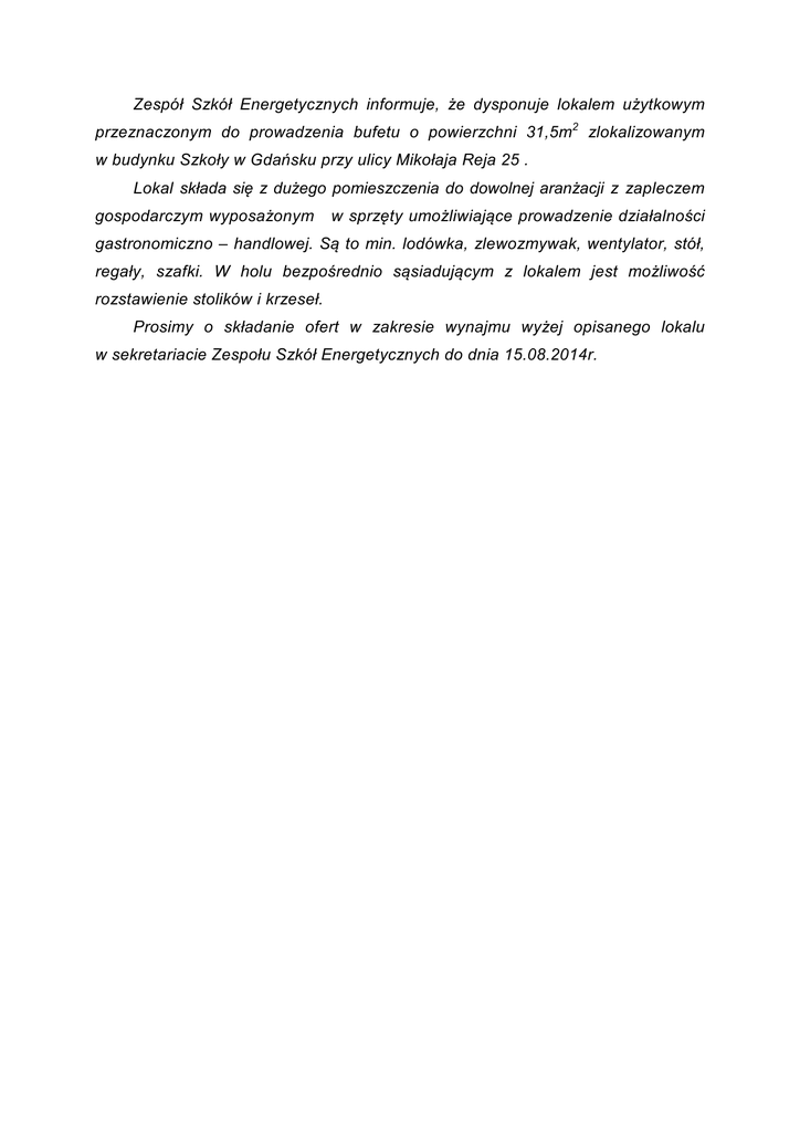 Zespół Szkół Energetycznych informuje, że dysponuje lokalem użytkowym przeznaczonym do prowadzenia bufetu o powierzchni 31,5m2 zlokalizowanym w budynku Szkoły w Gdańsku przy ulicy Mikołaja Reja 25 . Lokal składa się z dużego pomieszczenia do dowolnej aranżacji z zapleczem gospodarczym wyposażonym w sprzęty umożliwiające prowadzenie działalności gastronomiczno – handlowej. Są to min. lodówka, zlewozmywak, wentylator, stół, regały, szafki. W holu bezpośrednio sąsiadującym z lokalem jest możliwość rozstawienie stolików i krzeseł. Prosimy o składanie ofert w zakresie wynajmu wyżej opisanego lokalu w sekretariacie Zespołu Szkół Energetycznych do dnia 15.08.2014r.