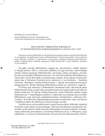 MONIKA OLCZAK-KARDAS Instytut Bibliotekoznawstwa i Dziennikarstwa, Uniwersytet Humanistyczno-Przyrodniczy, Kielce PRACOWNICY BIBLIOTEK WIEJSKICH W WOJEWÓDZTWIE WARSZAWSKIM W LATACH 1918–1939 Sytuacja zawodowa bibliotekarzy w dwudziestoleciu międzywojennym i poziom ich kształcenia ze szczególnym uwzględnieniem kursów bibliotekarskich. Sytuacja pracowników poszczególnych typów bibliotek wiejskich w województwie warszawskim: gminnych bibliotek samorządowych, punktów bibliotecznych, bibliotek organizacji. Wkład nauczycieli w pracę bibliotek wiejskich, w tym szkolnych. Początki zawodu bibliotekarza sięgają już starożytności, jednak dopiero w drugiej połowie XIX w. stworzono podstawy do jego rozwoju, wprowadzając między innymi egzaminy bibliotekarskie, otwierając szkoły zawodowe, powołując pierwszą katedrę bibliotekoznawstwa. Na ziemiach polskich bibliotekarstwo, zanim jako zawód doczekało się społecznego uznania, było jedynie teoretycznie opisywane w literaturze fachowej przez autorytety w tej dziedzinie – Joachima Lelewela, Stanisława Dunina-Borkowskiego i innych dziewiętnastowiecznych księgoznawców. Model idealnego bibliotekarza różnił się i zmieniał w ciągu lat. W Polsce pod zaborami w bibliotekach zatrudniano ludzi, dla których prace bibliotekarskie były na ogół tylko przygotowaniem do badań naukowych bądź też służbą społeczną. W okresie międzywojennym, kiedy biblioteki polskie mogły funkcjonować w niepodległym państwie, rozpoczęła się dyskusja nad zawodem bibliotekarza, jego prawnym usankcjonowaniem, kształceniem i zakresem obowiązków. W środowisku bibliotekarskim powstała świadomość więzi zawodowej i wspólnych dążeń do stabilizacji wykonywanego zawodu. Artykuł ma na celu przedstawienie sytuacji pracowników bibliotek wiejskich na terenie województwa warszawskiego. Tekst powstał głównie na podstawie materiałów archiwalnych i drukowanych źródeł popartych opracowaniami. Poszukiwania archiwalne prowadzono w Archiwum Państwowym m. st. Warszawy i jego oddziałach w: Łowiczu, Górze Kalwarii, Nowym Dworze Mazowieckim, Otwoc- ROCZNIKI BIBLIOTECZNE, R. LII: 2008 Roczniki Biblioteczne 52, 2008 © for this edition by CNS rb_52_II-kor.indd 95 2008-12-05 15:12:01 96 MONIKA OLCZAK-KARDAS ku, Pułtusku, Rawie Mazowieckiej; w Archiwum Państwowym w Płocku i jego oddziale w Kutnie; w oddziale Archiwum Państwowego w Toruniu we Włocławku; w oddziale Archiwum Państwowego w Piotrkowie Trybunalskim w Tomaszowie Mazowieckim. Kwerendą objęto również Archiwum Akt Nowych w Warszawie, Centralne Archiwum Wojskowe w Rembertowie, Archiwum Związku Nauczycielstwa Polskiego w Warszawie, Archiwum Archidiecezji Warszawskiej i Archiwum Zakładu Historii Ruchu Ludowego. Korzystano głównie z akt gmin wiejskich, akt inspektorów szkolnych, akt Ministerstwa Wyznań i Oświecenia Publicznego (MWRiOP) oraz akt organizacji społecznych. Archiwalia dotyczące okresu międzywojennego, a zwłaszcza te wytworzone na terenach wiejskich, zachowały się w stanie szczątkowym. W dodatku sprawy pracowników bibliotek wiejskich pojawiały się bardzo rzadko w dokumentach archiwalnych, stąd też wystąpił problem z ciągłością danych i uzyskaniem informacji o całym badanym terytorium. Wykorzystano głównie akta inspektorów szkolnych, akta gmin i dokumenty wytworzone przez Ministerstwo Wyznań Religijnych i Oświecenia Publicznego. Nieocenione stały się źródła drukowane w postaci artykułów z czasopism bibliotekarskich i organizacyjnych oraz sprawozdania. Opracowania posłużyły jedynie do nakreślenia ogólnej sytuacji zawodowej bibliotekarzy tego okresu i stanowią tło opisu sytuacji pracowników bibliotek na wsiach województwa warszawskiego1. Ogólna sytuacja zawodowa bibliotekarzy okresu międzywojennego jest dość dobrze zbadana2. W artykule skoncentrowano się na problemach bibliotekarzy oświatowych, gdyż to właśnie oni stanowili najliczniejszą grupę w bibliotekach wiejskich. Pracownicy tych bibliotek rekrutowali się głównie z grona nauczycieli, działaczy społecznych czy też pracowników wiejskich urzędów gminnych. Na temat pracy bibliotekarza oświatowego powstały w okresie międzywojennym liczne prace i artykuły, a także referaty prezentowane na zjazdach bibliotekarskich. Na II Zjeździe Bibliotekarzy Polskich Józef Stemler wygłosił 1 Sytuacja bibliotek wiejskich województwa warszawskiego została opisana przez autorkę w kilku publikacjach: Popularyzacja książki i biblioteki w społeczności wiejskiej w latach 1918– 1939 (na przykładzie województwa warszawskiego), Studia Kieleckie. Seria Bibliologiczno-Prasoznawcza 2002 nr 2, s. 7–22; Warunki korzystania z księgozbiorów wiejskich bibliotek oświatowych w latach 1918–1939 (na przykładzie województwa warszawskiego), Rocznik Historyczny Muzeum Historii Polskiego Ruchu Ludowego 2003 nr 19, s. 47–63; Sytuacja lokalowa bibliotek wiejskich w okresie dwudziestolecia międzywojennego na przykładzie województwa warszawskiego, Studia Bibliologiczne Akademii Świętokrzyskiej (10) 2006, s. 27–41; Księgozbiory bibliotek wiejskich w województwie warszawskim w latach 1918–1939, Kielce: Wydawnictwo Antykwaryczne 2007, 245 s. 2 Jerzy WŁODARCZYK, Bibliotekarze w Polsce okresu międzywojennego, Łódź: Wydaw. Uniwersytetu Łódzkiego 1988, 147 s.; Zofia GACA-DĄBROWSKA, Bibliotekarstwo II Rzeczypospolitej. Zarys problemów organizacyjnych i badawczych, Wrocław: Wydaw. Uniwersytetu Wrocławskiego 1983, 263 s.; tejże, Zawód bibliotekarza w II Rzeczypospolitej, Roczniki Biblioteczne (26) 1982 z. 1/2, s. 109–126. Roczniki Biblioteczne 52, 2008 © for this edition by CNS rb_52_II-kor.indd 96 2008-12-05 15:12:01 PRACOWNICY BIBLIOTEK WIEJSKICH W WOJ. WARSZAWSKIM 1918–1939 97 kontrowersyjny referat O stosunku bibliotekarza do czytelników w bibliotekach oświatowych. Bibliotekarz w wizji Stemlera był ideałem. Miał być miły dla 