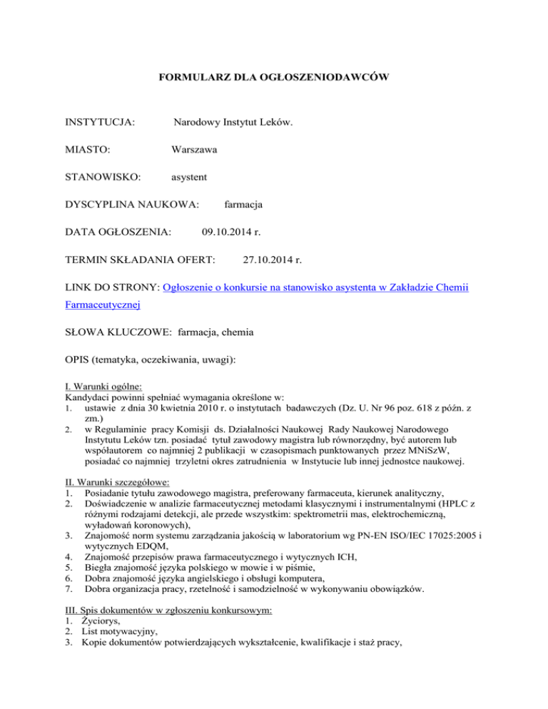 FORMULARZ DLA OGŁOSZENIODAWCÓW INSTYTUCJA: Narodowy Instytut Leków. MIASTO: Warszawa STANOWISKO: asystent DYSCYPLINA NAUKOWA: DATA OGŁOSZENIA: farmacja 09.10.2014 r. TERMIN SKŁADANIA OFERT: 27.10.2014 r. LINK DO STRONY: Ogłoszenie o konkursie na stanowisko asystenta w Zakładzie Chemii Farmaceutycznej SŁOWA KLUCZOWE: farmacja, chemia OPIS (tematyka, oczekiwania, uwagi): I. Warunki ogólne: Kandydaci powinni spełniać wymagania określone w: 1. ustawie z dnia 30 kwietnia 2010 r. o instytutach badawczych (Dz. U. Nr 96 poz. 618 z późn. z zm.) 2. w Regulaminie pracy Komisji ds. Działalności Naukowej Rady Naukowej Narodowego Instytutu Leków tzn. posiadać tytuł zawodowy magistra lub równorzędny, być autorem lub współautorem co najmniej 2 publikacji w czasopismach punktowanych przez MNiSzW, posiadać co najmniej trzyletni okres zatrudnienia w Instytucie lub innej jednostce naukowej. II. Warunki szczegółowe: 1. Posiadanie tytułu zawodowego magistra, preferowany farmaceuta, kierunek analityczny, 2. Doświadczenie w analizie farmaceutycznej metodami klasycznymi i instrumentalnymi (HPLC z różnymi rodzajami detekcji, ale przede wszystkim: spektrometrii mas, elektrochemiczną, wyładowań koronowych), 3. Znajomość norm systemu zarządzania jakością w laboratorium wg PN-EN ISO/IEC 17025:2005 i wytycznych EDQM, 4. Znajomość przepisów prawa farmaceutycznego i wytycznych ICH, 5. Biegła znajomość języka polskiego w mowie i w piśmie, 6. Dobra znajomość języka angielskiego i obsługi komputera, 7. Dobra organizacja pracy, rzetelność i samodzielność w wykonywaniu obowiązków. III. Spis dokumentów w zgłoszeniu konkursowym: 1. Życiorys, 2. List motywacyjny, 3. Kopie dokumentów potwierdzających wykształcenie, kwalifikacje i staż pracy, 4. Autoreferat z opisem dorobku naukowego, w tym zainteresowań i zamierzeń naukowych ze spisem publikacji i ich kopiami, 5. Opinia jednego samodzielnego pracownika naukowego o działalności naukowej kandydata, 6. Oświadczenie dotyczące podstawowego miejsca pracy, 7. Oświadczenie o korzystaniu z pełni praw publicznych i o niekaralności za przestępstwa popełnione umyślnie lub umyślne przestępstwo skarbowe, 8. Oświadczenie o wyrażeniu zgody na przetwarzanie danych osobowych zawartych w ofercie pracy dla potrzeb niezbędnych do realizacji procesu rekrutacji zgodnie z ustawą z dnia 29.08.1997 r. o ochronie danych osobowych (Dz.U. z 2002 r., Nr 101, poz. 926) IV. Warunki zatrudnienia: 1. umowa o pracę w pełnym wymiarze czasu pracy na okres 3 miesięcy z możliwością przedłużenia na czas określony (dot. pracowników nowo zatrudnionych) 2. wynagrodzenie ustalone na podstawie Zakładowego Układu Zbiorowego Pracy NIL 3. opieka medyczna 4. możliwość rozwoju naukowego. V. Miejsce i sposób składania dokumentów: Oferty z dopiskiem na zaklejonej kopercie „Konkurs na stanowisko asystenta w Zakładzie Chemii Farmaceutycznej” należy składać do dnia 27 października 2014 r. do godz. 14,00 w siedzibie NIL ul. Chełmska 30/34, 00-725 Warszawa, w Dziale Kadr i Organizacji, III piętro, pokój 346. O zakwalifikowaniu się do drugiego etapu – rozmowy kwalifikacyjnej - kandydaci są informowani za pośrednictwem poczty elektronicznej. Termin rozmowy kwalifikacyjnej przewidziany jest na dzień 4 listopada 2014 r. w siedzibie NIL. Przewidywane rozstrzygnięcie konkursu nastąpi do dnia 7 listopada 2014 r. Zastrzega się możliwość zmiany terminów oraz unieważnienia konkursu bez podania przyczyny Zwycięzca konkursu zostaje wyłoniony na podstawie oceny złożonych dokumentów, rozmowy kwalifikacyjnej oraz opinii Rady Naukowej. O zatrudnieniu zwycięzcy konkursu, warunkach pracy i płacy decyduje dyrektor NIL.