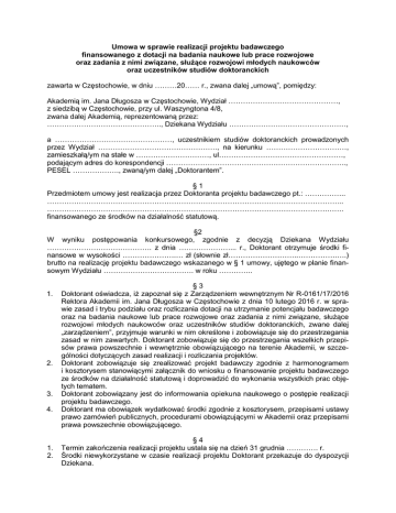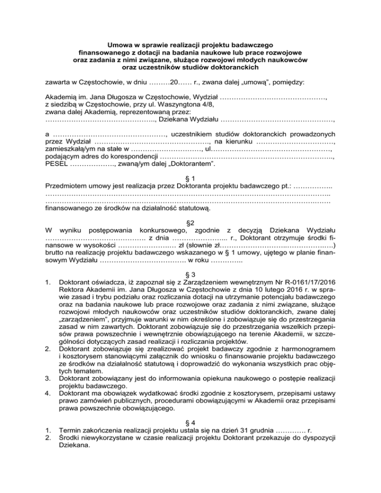 Umowa w sprawie realizacji projektu badawczego finansowanego z dotacji na badania naukowe lub prace rozwojowe oraz zadania z nimi związane, służące rozwojowi młodych naukowców oraz uczestników studiów doktoranckich zawarta w Częstochowie, w dniu ………20…… r., zwana dalej „umową”, pomiędzy: Akademią im. Jana Długosza w Częstochowie, Wydział ………………………………………, z siedzibą w Częstochowie, przy ul. Waszyngtona 4/8, zwana dalej Akademią, reprezentowaną przez: ……………………………………….., Dziekana Wydziału …………………………………………, a …………………………………………, uczestnikiem studiów doktoranckich prowadzonych przez Wydział …………………………………………., na kierunku ……………………………, zamieszkałą/ym na stałe w …………………………, ul……………………………………………, podającym adres do korespondencji ……………………………………………………………….., PESEL ………………., zwaną/ym dalej „Doktorantem”. §1 Przedmiotem umowy jest realizacja przez Doktoranta projektu badawczego pt.: …………….. ………………………………………………………………………………………………………….. …………………………………………………………………………………………………….……. finansowanego ze środków na działalność statutową. §2 W wyniku postępowania konkursowego, zgodnie z decyzją Dziekana Wydziału ……………………………………. z dnia …………………... r., Doktorant otrzymuje środki finansowe w wysokości ………………….… zł (słownie zł………………………..…………….….) brutto na realizację projektu badawczego wskazanego w § 1 umowy, ujętego w planie finansowym Wydziału ………………………………. w roku ………….. 1. 2. 3. 4. 1. 2. §3 Doktorant oświadcza, iż zapoznał się z Zarządzeniem wewnętrznym Nr R-0161/17/2016 Rektora Akademii im. Jana Długosza w Częstochowie z dnia 10 lutego 2016 r. w sprawie zasad i trybu podziału oraz rozliczania dotacji na utrzymanie potencjału badawczego oraz na badania naukowe lub prace rozwojowe oraz zadania z nimi związane, służące rozwojowi młodych naukowców oraz uczestników studiów doktoranckich, zwane dalej „zarządzeniem”, przyjmuje warunki w nim określone i zobowiązuje się do przestrzegania zasad w nim zawartych. Doktorant zobowiązuje się do przestrzegania wszelkich przepisów prawa powszechnie i wewnętrznie obowiązującego na terenie Akademii, w szczególności dotyczących zasad realizacji i rozliczania projektów. Doktorant zobowiązuje się zrealizować projekt badawczy zgodnie z harmonogramem i kosztorysem stanowiącymi załącznik do wniosku o finansowanie projektu badawczego ze środków na działalność statutową i doprowadzić do wykonania wszystkich prac objętych tematem. Doktorant zobowiązany jest do informowania opiekuna naukowego o postępie realizacji projektu badawczego. Doktorant ma obowiązek wydatkować środki zgodnie z kosztorysem, przepisami ustawy prawo zamówień publicznych, procedurami obowiązującymi w Akademii oraz przepisami prawa powszechnie obowiązującego. §4 Termin zakończenia realizacji projektu ustala się na dzień 31 grudnia …………. r. Środki niewykorzystane w czasie realizacji projektu Doktorant przekazuje do dyspozycji Dziekana. §5 1. Doktorant traci prawo do realizacji projektu naukowego w przypadku: 1) rezygnacji ze studiów doktoranckich, 2) ostatecznej decyzji w sprawie skreślenia z listy uczestników studiów doktoranckich, 3) ukończenia przez Doktoranta studiów w terminie krótszym niż określony w programie studiów doktoranckich. 2. Doktorant traci prawo do realizacji projektu naukowego również w przypadku: 1) niewypełnienia podjętych zobowiązań, w tym obowiązków sprawozdawczych, 2) wydatkowania środków niezgodnie z kosztorysem, przepisami Prawa o zamówieniach publicznych lub procedurami obowiązującymi w Akademii, 3) naruszenia zasady rzetelności naukowej, przez którą rozumie się w szczególności naruszenie praw autorskich i praw pokrewnych, a także praw własności przemysłowej. 3. W przypadkach określonych w ust. 1 i 2 niniejszego paragrafu Doktorant ma obowiązek zwrócić w całości otrzymane środki. 4. Środki wydatkowane niezgodnie z kosztorysem, przepisami Prawa o zamówieniach publicznych lub procedurami obowiązującymi w Akademii podlegają zwrotowi na rachunek bankowy Akademii. §6 Kierownik Zakładu/Katedry, w którym/ej jest realizowany projekt udostępnia w miarę potrzeby składniki mienia Zakładu/Katedry niezbędne do realizacji projektu i pełni dla potrzeb projektu badawczego funkcję akceptacyjną w procedurach związanych z wydatkowaniem środków, w tym w zintegrowanym systemie informatycznym. 1. 2. 3. §7 Prawo do wszystkich powstałych w wyniku realizacji projektu badawczego wskazanego w § 1 niniejszej umowy dóbr niematerialnych, podlegających ustawie o Prawie autorskim i prawach pokrewnych oraz ustawie Prawo własności przemysłowej, nabywa z chwilą ich powstania Akademia. Niezależnie od postanowień ust. 1 niniejszego paragrafu, na mocy niniejszej umowy Doktorant przenosi nieodpłatnie na Akademię całość autorskich praw majątkowych i praw pokrewnych do wszelkich dzieł powstałych w związku z realizacją projektu badawczego wskazanego w § 1 niniejszej umowy, łącznie z wyłącznym prawem do udzielenia zezwoleń na wykonywanie zależnego prawa autorskiego, do nieograniczonego w czasie korzystania i rozporządzania przedmiotem umowy w kraju i zagranicą. Akademia nabywa prawo do korzystania z dzieła będącego rezultatem realizacji projektu badawczego wskazanego w § 1 niniejszej umowy na następujących polach eksploatacji wskazanych pon