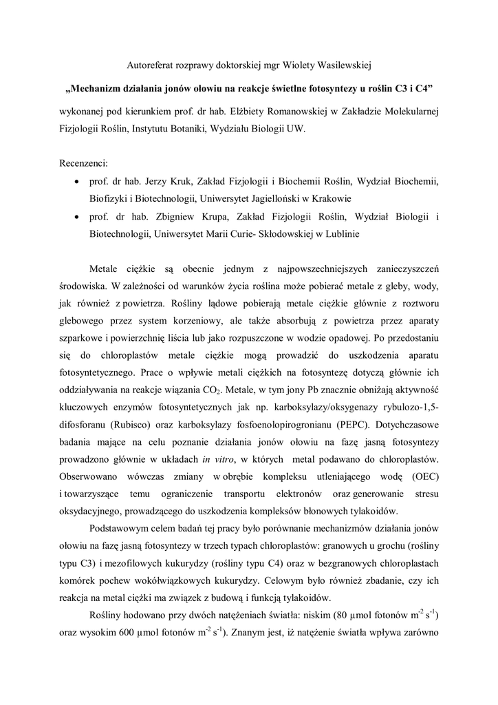 Autoreferat rozprawy doktorskiej mgr Wiolety Wasilewskiej „Mechanizm działania jonów ołowiu na reakcje świetlne fotosyntezy u roślin C3 i C4” wykonanej pod kierunkiem prof. dr hab. Elżbiety Romanowskiej w Zakładzie Molekularnej Fizjologii Roślin, Instytutu Botaniki, Wydziału Biologii UW. Recenzenci: prof. dr hab. Jerzy Kruk, Zakład Fizjologii i Biochemii Roślin, Wydział Biochemii, Biofizyki i Biotechnologii, Uniwersytet Jagielloński w Krakowie prof. dr hab. Zbigniew Krupa, Zakład Fizjologii Roślin, Wydział Biologii i Biotechnologii, Uniwersytet Marii Curie- Skłodowskiej w Lublinie Metale ciężkie są obecnie jednym z najpowszechniejszych zanieczyszczeń środowiska. W zależności od warunków życia roślina może pobierać metale z gleby, wody, jak również z powietrza. Rośliny lądowe pobierają metale ciężkie głównie z roztworu glebowego przez system korzeniowy, ale także absorbują z powietrza przez aparaty szparkowe i powierzchnię liścia lub jako rozpuszczone w wodzie opadowej. Po przedostaniu się do chloroplastów metale ciężkie mogą prowadzić do uszkodzenia aparatu fotosyntetycznego. Prace o wpływie metali ciężkich na fotosyntezę dotyczą głównie ich oddziaływania na reakcje wiązania CO2. Metale, w tym jony Pb znacznie obniżają aktywność kluczowych enzymów fotosyntetycznych jak np. karboksylazy/oksygenazy rybulozo-1,5difosforanu (Rubisco) oraz karboksylazy fosfoenolopirogronianu (PEPC). Dotychczasowe badania mające na celu poznanie działania jonów ołowiu na fazę jasną fotosyntezy prowadzono głównie w układach in vitro, w których metal podawano do chloroplastów. Obserwowano wówczas zmiany w obrębie i towarzyszące temu ograniczenie kompleksu utleniającego wodę (OEC) transportu elektronów oraz generowanie stresu oksydacyjnego, prowadzącego do uszkodzenia kompleksów błonowych tylakoidów. Podstawowym celem badań tej pracy było porównanie mechanizmów działania jonów ołowiu na fazę jasną fotosyntezy w trzech typach chloroplastów: granowych u grochu (rośliny typu C3) i mezofilowych kukurydzy (rośliny typu C4) oraz w bezgranowych chloroplastach komórek pochew wokółwiązkowych kukurydzy. Celowym było również zbadanie, czy ich reakcja na metal ciężki ma związek z budową i funkcją tylakoidów. Rośliny hodowano przy dwóch natężeniach światła: niskim (80 µmol fotonów m-2 s-1) oraz wysokim 600 µmol fotonów m-2 s-1). Znanym jest, iż natężenie światła wpływa zarówno na ilość gran w chloroplastach, jak i zawartość kompleksów tylakoidowych. Błony tylakoidów są heterogenne i wszystkie czynniki wpływające na strukturę chloroplastów będą decydowały o zmianie relacji pomiędzy cyklicznym i niecyklicznym transportem elektronów, a w związku z tym o zmianie stosunku ATP/NADPH. Metal podawano przez 24 godziny do odciętych liści badanych roślin poprzez wprowadzanie roztworu Pb(NO3)2 w stężeniu 5 mM wraz z prądem transpiracyjnym. W badaniach stosowano szereg metod: gazometryczne, luminometryczne, fluorescencyjne, elektroforetyczne, immunologiczne, spektrofotometryczne, spektrometrię masową, mikroskopię elektronową i inne. Cele pracy realizowano przez: oznaczenie natężenia wymiany CO2 oraz pomiary fluorescencji chlorofilu a in vivo w liściach, oznaczenie aktywności fotochemicznej fotoukładu I i II (PSI i PSII) izolowanych chloroplastów grochu i kukurydzy oraz określenie zmian w organizacji i aktywności kompleksów białkowo-barwnikowych błon tylakoidowych, pomiary fosforylacji białek tylakoidowych. W doświadczeniach in vivo takich jak: pomiary natężenia fotosyntezy netto, natężenia oddychania, zawartości adenylatów oraz fluorescencji chlorofilu a stwierdzono, że jony ołowiu: w podobnym stopniu hamowały fotosyntetyczne wiązanie CO2 u obu gatunków roślin zarówno z niskiego, jak i wysokiego natężenia światła. Towarzyszyło temu wzmożenie natężenia procesów oddechowych, stymulowały produkcję ATP, nieznacznie obniżały wydajność fotochemiczną PSII (Fv/Fm), obniżały wydajność transportu elektronów przy jednoczesnym wzroście wygaszania niefotochemicznego energii (wzrost emisji ciepła). W doświadczeniach in vitro stwierdzono, że: głównym miejscem działania jonów ołowiu były chloroplasty komórek pochew wokółwiązkowych kukurydzy, gdyż tylko w nich notowano spadek aktywności zarówno PSII, jak i PSI. Natomiast w mezofilowych chloroplastach kukurydzy oraz grochu aktywność fotoukładów nie zmieniała się. jony ołowiu spowodowały zmianę w organizacji tylakoidowych kompleksów białkowo-barwnikowych tylko w chloroplastach komórek pochew okołowiązkowych. Zwiększyła się ilość form monomerycznych PSII kosztem dimerów oraz superkompleksów. W chloroplastach mezofilowych grochu i kukurydzy takie zmiany nie wystąpiły. jony ołowiu znacznie stymulowały fosforylację rdzeniowego białka PSII, tj. białka D1 zarówno w monomerach, dimerach, jak i superkompleksach. Białko D1 nie było defosforylowane w warunkach sprzyjających temu procesowi takich jak daleka czerwień czy ciemność. Silnej fosforylacji białka D1 nie towarzyszyła fotoinhibicja (brak degradacji białka D1) w warunkach działania wysokich natężeń światła W przedstawionej pracy wykazano po raz pierwszy, że jony ołowiu stymulowały fosforylację białka D1 oraz niskocząsteczkowego białka PsbH, które stabilizuje dimeryczną strukturę fotoukładu II. Wzmożona fosforylacja białek PSII w warunkach działania metalu ciężkiego może pełnić więc funkcję ochronną przed degradacją białek przez enzymy proteolityczne. Wzmożona fosforylacja i ograniczona defosforylacja białek tylakoidowych może stanowić uniwersalny mechanizm ochronny przed działaniem czynników stresowych. Jest zatem bardzo prawdopodobne, że dzięki takiemu mechanizmowi działania jonów Pb może być utrzymany transport elektronów i zapewniona produkcja siły asymilacyjne