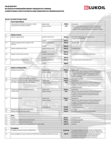 ZAŁĄCZNIK NR 1 DO OGÓLNYCH WARUNKÓW UMOWY ZWIĄZANYCH Z UMOWĄ O KORZYSTANIU Z KART FLOTOWYCH AMIC (DEBETOWYCH I PRZEDPŁACONYCH) OPŁATY ZA KORZYSTANIE Z KART 1. Konto Opłat Klienta Utrzymanie konta Klienta włącznie ze stałym dostarczaniem raportów transakcji 2. Opłaty za Karty 2.1 Żądanie wydania Karty 2.2 Żądanie wygenerowania nowego nr PIN do Karty 2.3 Żądanie zablokowania Karty 2.4 Żądanie zmiany limitu na Kartę 2.5 Żądanie zmiany ustawień Karty 3. Opłaty za Usługi Online 3.1 Dostęp do Usług Online opłata stała opłata zmienna miesięcznie Zbiorcza cena zakupu dostaw (z VAT) zrealizowanych w ciągu miesiąca na podstawie transakcji za pomocą wszystkich Kart wydanych Klientowi w danym miesiącu. PLN 0,- inaczej PLN 0,- poprzez stronę www PLN 0,- inaczej PLN 0,- poprzez stronę www PLN 0,- inaczej PLN 0,- poprzez stronę www PLN 0,- inaczej PLN 0,- poprzez stronę www PLN 0,- inaczej PLN 0,- opłata stała PLN 0,0% miesięcznie Zbiorcza cena zakupu dostaw (z VAT) zrealizowanych w ciągu 1 miesiąca za pomocą transakcji na Karty za pomocą wszystkich Kart wydanych Klientowi w danym miesiącu. PLN 0,- dla każdej transakcji PLN 0,0% miesięcznie PLN 0,0% miesięcznie PLN 0,0% miesięcznie opłata zmienna za ostrzeżenie 3.2 Transakcje za pomocą Usług Online / wejście 3.3 Dostęp do raportów transakcji i faktur w formatach XLS i PDF za pośrednictwem Usług Online opłata stała Dostęp do raportów zarządczych poprzez Usługi Online opłata stała Ostrzeżenia e-mail opłata stała 3.5 0% poprzez stronę www opłata zmienna 3.4 PLN 0 opłata zmienna opłata zmienna Za każdą Kartę łącznie z produkcją Karty i wygenerowaniem PINu Za każdy PIN Za każdą Kartę za 1 rodzaj limitu na Kartę dla każdej Karty za 1 rodzaj ustawień dla każdej Karty Zbiorcza cena zakupu dostaw (z VAT) zrealizowanych w ciągu 1 miesiąca za pomocą transakcji na Karty za pomocą wszystkich Kart wydanych Klientowi w danym miesiącu. Zbiorcza cena zakupu dostaw (z VAT) zrealizowanych w ciągu 1 miesiąca za pomocą transakcji na Karty za pomocą wszystkich Kart wydanych Klientowi w danym miesiącu. Zbiorcza cena zakupu dostaw (z VAT) zrealizowanych w ciągu 1 miesiąca za pomocą transakcji na Karty za pomocą wszystkich Kart wydanych Klientowi w danym miesiącu. PLN 0,- za każde ostrzeżenie 3.6 Wygenerowanie hasła dla Użytkownika PLN 0,- za 1 hasło 3.7 Blokada dostępu do Usług Online PLN 0,- za zablokowanie dostępu dla Użytkownika 4. Kary 4.1 Monity PLN 0,- za każdy monit 4.2 Windykacja należności przez osoby trzecie PLN 0,- za każdy przypadek 4.3 Zgubienie, kradzież, brak zwrotu Karty PLN 0,- za każdą Kartę 4.4 Odsetki za opóźnienie, w razie opóźnienia w płatności opłat 0,02 % dziennie 5. Przedpłaty 5.1 Przedpłata w kwocie niższej niż 300,00 PLN 5.2 Zwrot przedpłaty w kwocie niższej niż 100,00 PLN w przypadku zakończenia umowy 8,00 PLN 100 % za każdą przedpłatę w kwocie niższej niż 300,00 PLN (jeżeli klient jednorazowo wpłaci mniej niż 300,00 PLN) za niewykorzystaną część przedpłaty (w przypadku rozwiązania umowy kwota poniżej 100,00 PLN pozostająca na koncie nie zostanie zwrócona).