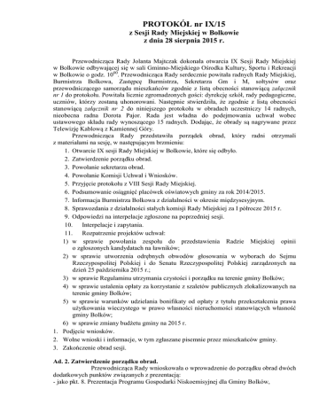 PROTOKÓŁ nr IX/15 z Sesji Rady Miejskiej w Bolkowie z dnia 28 sierpnia 2015 r. Przewodnicząca Rady Jolanta Majtczak dokonała otwarcia IX Sesji Rady Miejskiej w Bolkowie odbywającej się w sali Gminno-Miejskiego Ośrodka Kultury, Sportu i Rekreacji w Bolkowie o godz. 1000. Przewodnicząca Rady serdecznie powitała radnych Rady Miejskiej, Burmistrza Bolkowa, Zastępcę Burmistrza, Sekretarza Gm i M, sołtysów oraz przewodniczącego samorządu mieszkańców zgodnie z listą obecności stanowiącą załącznik nr 1 do protokołu. Powitała licznie zgromadzonych gości: dyrekcję szkół, rady pedagogiczne, uczniów, którzy zostaną uhonorowani. Następnie stwierdziła, że zgodnie z listą obecności stanowiącą załącznik nr 2 do niniejszego protokołu w obradach uczestniczy 14 radnych, nieobecna radna Dorota Pajor. Rada jest władna do podejmowania uchwał wobec ustawowego składu rady wynoszącego 15 radnych. Dodając, że obrady są nagrywane przez Telewizję Kablową z Kamiennej Góry. Przewodnicząca Rady przedstawiła porządek obrad, który radni otrzymali z materiałami na sesję, w następującym brzmieniu: 1. Otwarcie IX sesji Rady Miejskiej w Bolkowie, które się odbyło. 2. Zatwierdzenie porządku obrad. 3. Powołanie sekretarza obrad. 4. Powołanie Komisji Uchwał i Wniosków. 5. Przyjęcie protokołu z VIII Sesji Rady Miejskiej. 6. Podsumowanie osiągnięć placówek oświatowych gminy za rok 2014/2015. 7. Informacja Burmistrza Bolkowa z działalności w okresie międzysesyjnym. 8. Sprawozdania z działalności stałych komisji Rady Miejskiej za I półrocze 2015 r. 9. Odpowiedzi na interpelacje zgłoszone na poprzedniej sesji. 10. Interpelacje i zapytania. 11. Rozpatrzenie projektów uchwał: 1) w sprawie powołania zespołu do przedstawienia Radzie Miejskiej opinii o zgłoszonych kandydatach na ławników; 2) w sprawie utworzenia odrębnych obwodów głosowania w wyborach do Sejmu Rzeczypospolitej Polskiej i do Senatu Rzeczypospolitej Polskiej zarządzonych na dzień 25 października 2015 r.; 3) w sprawie Regulaminu utrzymania czystości i porządku na terenie gminy Bolków; 4) w sprawie ustalenia opłaty za korzystanie z szaletów publicznych zlokalizowanych na terenie gminy Bolków; 5) w sprawie warunków udzielania bonifikaty od opłaty z tytułu przekształcenia prawa użytkowania wieczystego w prawo własności nieruchomości stanowiących własność gminy Bolków; 6) w sprawie zmiany budżetu gminy na 2015 r. 1. Podjęcie wniosków. 2. Wolne wnioski i informacje, w tym zgłaszane pisemnie przez mieszkańców gminy. 3. Zakończenie obrad sesji. Ad. 2. Zatwierdzenie porządku obrad. Przewodnicząca Rady wnioskowała o wprowadzenie do porządku obrad dwóch dodatkowych punktów związanych z prezentacją: - jako pkt. 8. Prezentacja Programu Gospodarki Niskoemisyjnej dla Gminy Bolków, 2 - jako pkt. 9. Prezentacja zagospodarowania podziemi Góry Ryszard w Bolkowie. Pozostałe pkt. zmienią numerację o 2 liczby większą. Ponadto wnioskowała o wprowadzenie do pkt. Rozpatrzenie projektów uchwał dwóch projektów uchwał: - ppkt. 7. w sprawie skargi na działalność Burmistrza Bolkowa (dot. zagrodzenia drogi gminnej w Wierzchosławicach); - ppkt. 8. w sprawie rozpatrzenia skarg na działalność Burmistrza Bolkowa dot. wydania zezwolenia na wycięcie drzew w Wierzchosławicach. Zapytała: czy są inne wnioski w sprawie przedstawionego porządku obrad? O godz. 1005 przybyła radna Dorota Pajor. Innych wniosków nie było. Przewodnicząca Rady J. Majtczak poddała pod głosowanie wniosek o wprowadzenie do porządku obrad jako: - pkt. 8. Prezentacja Programu Gospodarki Niskoemisyjnej dla Gminy Bolków; - pkt. 9. Prezentacja zagospodarowania podziemi Góry Ryszard w Bolkowie; Pozostałe punkty porządku obrad zmienią kolejność o plus 2. - w pkt. 13. ppkt. 7 w sprawie skargi na działalność Burmistrza Bolkowa (dot. zagrodzenia drogi gminnej w Wierzchosławicach); - w pkt. 13. ppkt. 8. w sprawie skargi na działalność Burmistrza Bolkowa (dot. wydania zezwolenia na wycięcie drzewa w Wierzchosławicach Uwag nie było. Wniosek został przyjęty jednogłośnie przy 15 głosach za. Przewodnicząca Rady poddała pod głosowanie porządek obrad z w/w zmianami, który został zatwierdzony jednogłośnie przy 15 głosach za. Ad. 3. Powołanie sekretarza obrad. Na Sekretarza obrad zgłoszono kandydaturę radnego Wiesława Tomaszka – wyrażającego zgodę. Innych kandydatur nie zgłoszono. Sekretarzem Obrad został wybrany jednogłośnie przy 15 głosach za Wiesław Tomaszek i zajął miejsce przy stole prezydialnym. Ad. 4. Powołanie Komisji Uchwał i Wniosków. Do pracy Komisji Uchwał i Wniosków zgłoszono poniżej wymienione kandydatury: 1. Bogusława Kałużna - wyraziła zgodę 2. Iwona Małek - wyraziła zgodę 3. Kazimierz Małecki– wyraził zgodę. Innych kandydatur nie zgłoszono. Rada Miejska jednogłośnie przy 15 głosach za powołała Komisję Uchwał i Wniosków w składzie: 1) Bogusława Kałużna 2) Iwona Małek 3) Kazimierz Małecki. Ad. 5. Przyjęcie protokołu z VIII Sesji Rady Miejskiej. Na prośbę Przewodniczącej Rady Sekretarz obrad Wiesław Tomaszek odczytał: 3 1) pismo Burmistrza Bolkowa SA.0008.6.2015 z dnia 21 lipca 2015 r. informujące o realizacji uchwał podjętych na VIII Sesji Rady Miejskiej w Bolkowie w dniu 29 czerwca 2015 r.; 2) odpowiedź Burmistrza Bolkowa udzieloną pismem FB.3251.2014 z dnia 7 sierpnia 2015 r. w sprawie zabezpieczenia środków na dofinansowanie remontu wnętrza kościoła w Starych Rochowicach; 3) odpowiedź Zarządu Dróg Powiatowych w Jaworze udzieloną pismem DSL.7126.39.2015 z dnia 16 lipca 2015 r. w sprawie ograniczenia prędkości na drodze powiatowej w Sadach Górnych; 4) odpowiedź na wniosek o zabezpieczenie odpadających części architektonicznych budynku nr 8 przy ul. Niepodległości udzielona przez Powiatowy Inspektorat Nadzoru Budowlanego w Jaworze udzieloną pismem PINB 05-403/11/2015 z dn