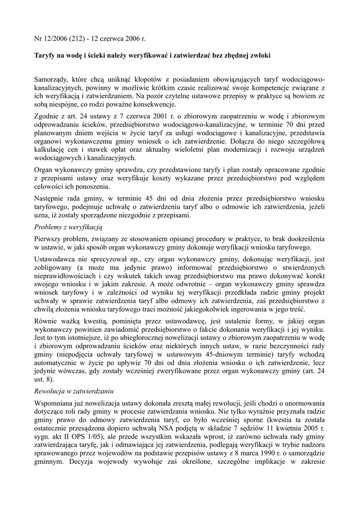 Nr 12/2006 (212) - 12 czerwca 2006 r. Taryfy na wodę i ścieki należy weryfikować i zatwierdzać bez zbędnej zwłoki Samorządy, które chcą uniknąć kłopotów z posiadaniem obowiązujących taryf wodociągowokanalizacyjnych, powinny w możliwie krótkim czasie realizować swoje kompetencje związane z ich weryfikacją i zatwierdzaniem. Na pozór czytelne ustawowe przepisy w praktyce są bowiem ze sobą niespójne, co rodzi poważne konsekwencje. Zgodnie z art. 24 ustawy z 7 czerwca 2001 r. o zbiorowym zaopatrzeniu w wodę i zbiorowym odprowadzaniu ścieków, przedsiębiorstwo wodociągowo-kanalizacyjne, w terminie 70 dni przed planowanym dniem wejścia w życie taryf za usługi wodociągowe i kanalizacyjne, przedstawia organowi wykonawczemu gminy wniosek o ich zatwierdzenie. Dołącza do niego szczegółową kalkulację cen i stawek opłat oraz aktualny wieloletni plan modernizacji i rozwoju urządzeń wodociągowych i kanalizacyjnych. Organ wykonawczy gminy sprawdza, czy przedstawione taryfy i plan zostały opracowane zgodnie z przepisami ustawy oraz weryfikuje koszty wykazane przez przedsiębiorstwo pod względem celowości ich ponoszenia. Następnie rada gminy, w terminie 45 dni od dnia złożenia przez przedsiębiorstwo wniosku taryfowego, podejmuje uchwałę o zatwierdzeniu taryf albo o odmowie ich zatwierdzenia, jeżeli uzna, iż zostały sporządzone niezgodnie z przepisami. Problemy z weryfikacją Pierwszy problem, związany ze stosowaniem opisanej procedury w praktyce, to brak dookreślenia w ustawie, w jaki sposób organ wykonawczy gminy dokonuje weryfikacji wniosku taryfowego. Ustawodawca nie sprecyzował np., czy organ wykonawczy gminy, dokonując weryfikacji, jest zobligowany (a może ma jedynie prawo) informować przedsiębiorstwo o stwierdzonych nieprawidłowościach i czy wskutek takich uwag przedsiębiorstwo ma prawo dokonywać korekt swojego wniosku i w jakim zakresie. A może odwrotnie – organ wykonawczy gminy sprawdza wniosek taryfowy i w zależności od wyniku tej weryfikacji przedkłada radzie gminy projekt uchwały w sprawie zatwierdzenia taryf albo odmowy ich zatwierdzenia, zaś przedsiębiorstwo z chwilą złożenia wniosku taryfowego traci możność jakiegokolwiek ingerowania w jego treść. Równie ważką kwestią, pominięta przez ustawodawcę, jest ustalenie formy, w jakiej organ wykonawczy powinien zawiadomić przedsiębiorstwo o fakcie dokonania weryfikacji i jej wyniku. Jest to tym istotniejsze, iż po ubiegłorocznej nowelizacji ustawy o zbiorowym zaopatrzeniu w wodę i zbiorowym odprowadzaniu ścieków oraz niektórych innych ustaw, w razie bezczynności rady gminy (niepodjęcia uchwały taryfowej w ustawowym 45-dniowym terminie) taryfy wchodzą automatycznie w życie po upływie 70 dni od dnia złożenia wniosku o ich zatwierdzenie, lecz jedynie wówczas, gdy zostały wcześniej zweryfikowane przez organ wykonawczy gminy (art. 24 ust. 8). Rewolucja w zatwierdzaniu Wspomniana już nowelizacja ustawy dokonała zresztą małej rewolucji, jeśli chodzi o unormowania dotyczące roli rady gminy w procesie zatwierdzania wniosku. Nie tylko wyraźnie przyznała radzie gminy prawo do odmowy zatwierdzenia taryf, co było wcześniej sporne (kwestia ta została ostatecznie przesądzona dopiero uchwałą NSA podjętą w składzie 7 sędziów 11 kwietnia 2005 r. sygn. akt II OPS 1/05), ale przede wszystkim wskazała wprost, iż zarówno uchwała rady gminy zatwierdzająca taryfę, jak i odmawiająca jej zatwierdzenia, podlegają weryfikacji w trybie nadzoru sprawowanego przez wojewodów na podstawie przepisów ustawy z 8 marca 1990 r. o samorządzie gminnym. Decyzja wojewody wywołuje zaś określone, szczególne implikacje w zakresie obowiązywania taryf. Dodane do ustawy art. 24 ust. 5a i 5b stanowią, iż w razie stwierdzenia przez organ nadzoru nieważności uchwały o zatwierdzeniu taryf albo niestwierdzenia nieważności uchwały o odmowie zatwierdzenia taryf, czas obowiązywania dotychczasowych taryf przedłuża się o 90 dni od dnia doręczenia przedsiębiorstwu wodociągowo-kanalizacyjnemu rozstrzygnięcia nadzorczego (w takiej sytuacji procedura taryfowa rozpoczyna się od początku). W razie natomiast stwierdzenia przez wojewodę nieważności uchwały o odmowie zatwierdzenia taryf, taryfy zweryfikowane przez organ wykonawczy gminy wchodzą w życie po upływie 14 dni od dnia doręczenia przedsiębiorstwu wodociągowo-kanalizacyjnemu rozstrzygnięcia nadzorczego. Niestety, odwołując się w znowelizowanej ustawie o zbiorowym zaopatrzeniu w wodę i zbiorowym odprowadzaniu ścieków do procedur ustawy o samorządzie gminnym, ustawodawca nie dostrzegł wielu pułapek związanych z takim zabiegiem. GSiA OSTRZEGA Skoro rada gminy ma prawo podjąć uchwałę w sprawie zatwierdzenia taryf lub odmowy ich zatwierdzenia najpóźniej w 45 dniu od przedłożenia wniosku taryfowego, a zatem na 25 dni przed utratą mocy taryf dotychczasowych (art. 24 ustawy o zbiorowym zaopatrzeniu w wodę i zbiorowym odprowadzaniu ścieków), zaś organ wykonawczy gminy uchwałę taką jest zobowiązany przesłać wojewodzie w terminie 7 dni, po których organ nadzoru ma jeszcze 30 dni na ewentualne podjęcie rozstrzygnięcia (art. 90 i 91 ustawy o samorządzie gminnym), to, sumując terminy, nietrudno stwierdzić, iż rozstrzygnięcie nadzorcze może dotrzeć do rady gminy nawet kilkanaście dni od dnia wygaśnięcia starych taryf. Jeżeli rozstrzygnięcie takie dodatkowo kwestionuje poprawność „nowych” taryf (np. stwierdza nieważność uchwały o ich zatwierdzeniu), pojawia się sytuacja, w której brak jest, przynajmniej z punktu widzenia stricte formalnego, podstaw do stosowania przez przedsiębiorstwo jakichkolwiek cen i stawek opłat. Brak korelacji terminów Przede wszystkim nie zauważył, iż terminy wskazane w obu ustawach nie są ze sobą skorelowane. Równie absurdalną sytuację kreuje regulacja stanowiąca, iż w razie niestwierdzenia przez organ nadzor