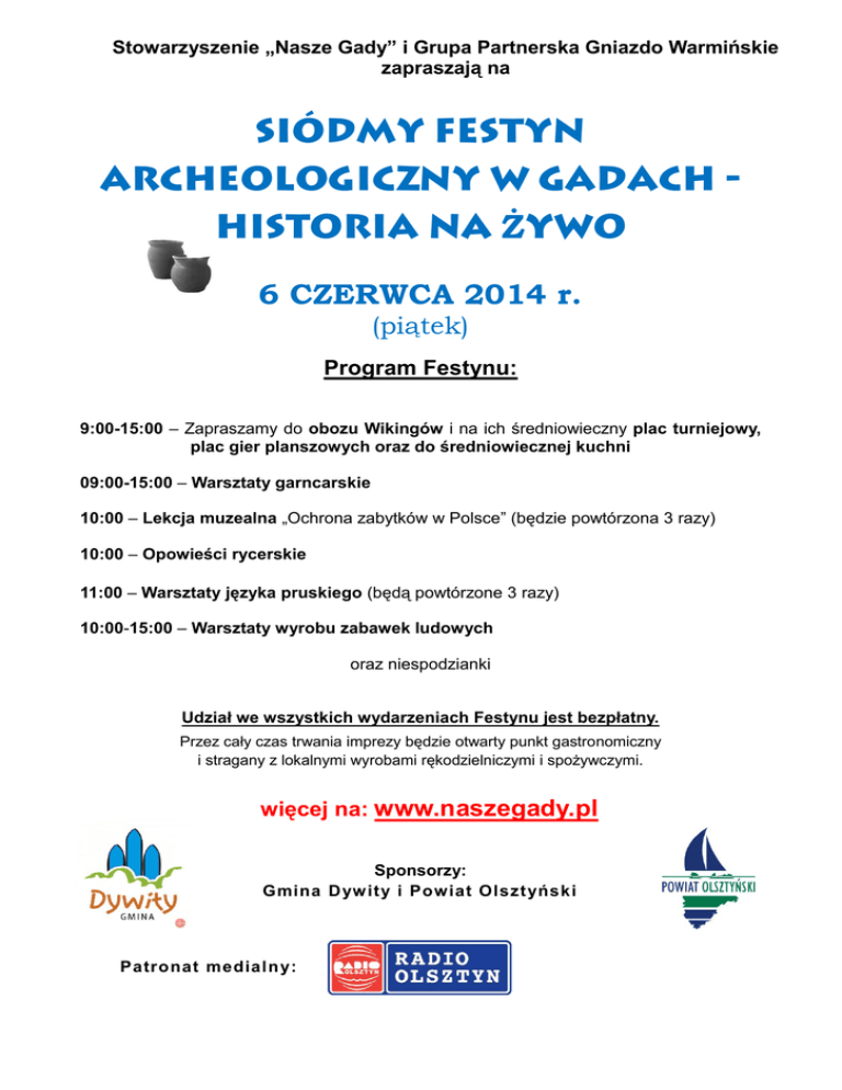 Stowarzyszenie „Nasze Gady” i Grupa Partnerska Gniazdo Warmińskie zapraszają na SIÓDMY FESTYN ARCHEOLOGICZNY W GADACH HISTORIA NA ŻYWO 6 CZERWCA 2014 r. (piątek) Program Festynu: 9:00-15:00 – Zapraszamy do obozu Wikingów i na ich średniowieczny plac turniejowy, plac gier planszowych oraz do średniowiecznej kuchni 09:00-15:00 – Warsztaty garncarskie 10:00 – Lekcja muzealna „Ochrona zabytków w Polsce” (będzie powtórzona 3 razy) 10:00 – Opowieści rycerskie 11:00 – Warsztaty języka pruskiego (będą powtórzone 3 razy) 10:00-15:00 – Warsztaty wyrobu zabawek ludowych oraz niespodzianki Udział we wszystkich wydarzeniach Festynu jest bezpłatny. Przez cały czas trwania imprezy będzie otwarty punkt gastronomiczny i stragany z lokalnymi wyrobami rękodzielniczymi i spożywczymi. więcej na: www.naszegady.pl Sponsorzy: Gmina Dyw ity i Powiat Olsztyński Patronat medialny: