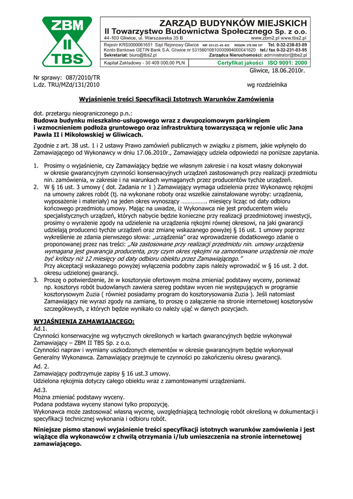 Gliwice, 18.06.2010r. Nr sprawy: 087/2010/TR L.dz. TRU/MZd/131/2010 wg rozdzielnika Wyjaśnienie treści Specyfikacji Istotnych Warunków Zamówienia dot. przetargu nieograniczonego p.n.: Budowa budynku mieszkalno-usługowego wraz z dwupoziomowym parkingiem i wzmocnieniem podłoża gruntowego oraz infrastrukturą towarzyszącą w rejonie ulic Jana Pawła II i Mikołowskiej w Gliwicach. Zgodnie z art. 38 ust. 1 i 2 ustawy Prawo zamówień publicznych w związku z pismem, jakie wpłynęło do Zamawiającego od Wykonawcy w dniu 17.06.2010r., Zamawiający udziela odpowiedzi na poniższe zapytania. 1. Prosimy o wyjaśnienie, czy Zamawiający będzie we własnym zakresie i na koszt własny dokonywał w okresie gwarancyjnym czynności konserwacyjnych urządzeń zastosowanych przy realizacji przedmiotu nin. zamówienia, w zakresie i na warunkach wymaganych przez producentów tychże urządzeń. 2. W § 16 ust. 3 umowy ( dot. Zadania nr 1 ) Zamawiający wymaga udzielenia przez Wykonawcę rękojmi na umowny zakres robót (tj. na wykonane roboty oraz wszelkie zainstalowane wyroby: urządzenia, wyposażenie i materiały) na jeden okres wynoszący ……………. miesięcy licząc od daty odbioru końcowego przedmiotu umowy. Mając na uwadze, iż Wykonawca nie jest producentem wielu specjalistycznych urządzeń, których nabycie będzie konieczne przy realizacji przedmiotowej inwestycji, prosimy o wyrażenie zgody na udzielenie na urządzenia rękojmi równej okresowi, na jaki gwarancji udzielają producenci tychże urządzeń oraz zmianę wskazanego powyżej § 16 ust. 1 umowy poprzez wykreślenie ze zdania pierwszego słowa: „urządzenia” oraz wprowadzenie dodatkowego zdanie o proponowanej przez nas treści: „Na zastosowane przy realizacji przedmiotu nin. umowy urządzenia wymagana jest gwarancja producenta, przy czym okres rękojmi na zamontowane urządzenia nie może być krótszy niż 12 miesięcy od daty odbioru obiektu przez Zamawiającego.” Przy akceptacji wskazanego powyżej wyłączenia podobny zapis należy wprowadzić w § 16 ust. 2 dot. okresu udzielonej gwarancji. 3. Proszę o potwierdzenie, że w kosztorysie ofertowym można zmieniać podstawy wyceny, ponieważ np. kosztorys robót budowlanych zawiera szereg podstaw wycen nie występujących w programie kosztorysowym Zuzia ( również posiadamy program do kosztorysowania Zuzia ). Jeśli natomiast Zamawiający nie wyrazi zgody na zamianę, to proszę o załączenie na stronie internetowej kosztorysów szczegółowych, z których będzie wynikało co należy ująć w danych pozycjach. WYJAŚNIENIA ZAMAWIAJĄCEGO: Ad.1. Czynności konserwacyjne wg wytycznych określonych w kartach gwarancyjnych będzie wykonywał Zamawiający – ZBM II TBS Sp. z o.o. Czynności napraw i wymiany uszkodzonych elementów w okresie gwarancyjnym będzie wykonywał Generalny Wykonawca. Zamawiający przejmuje te czynności po zakończeniu okresu gwarancji. Ad. 2. Zamawiający podtrzymuje zapisy § 16 ust.3 umowy. Udzielona rękojmia dotyczy całego obiektu wraz z zamontowanymi urządzeniami. Ad.3. Można zmieniać podstawy wyceny. Podana podstawa wyceny stanowi tylko propozycję. Wykonawca może zastosować własną wycenę, uwzględniającą technologię robót określoną w dokumentacji i specyfikacji technicznej wykonania i odbioru robót. Niniejsze pismo stanowi wyjaśnienie treści specyfikacji istotnych warunków zamówienia i jest wiążące dla wykonawców z chwilą otrzymania i/lub umieszczenia na stronie internetowej zamawiającego.