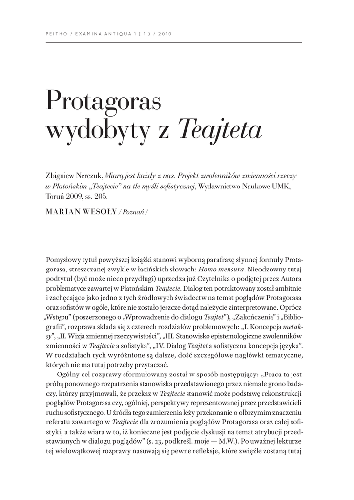 PEITHO / EXAMINA ANTIQUA 1 ( 1 ) / 2010 Protagoras wydobyty z Teajteta Zbigniew Nerczuk, Miarą jest każdy z nas. Projekt zwolenników zmienności rzeczy w Platońskim „Teajtecie” na tle myśli sofistycznej, Wydawnictwo Naukowe UMK, Toruń 2009, ss. 205. MARIAN WESOŁY / Poznań / Pomysłowy tytuł powyższej książki stanowi wyborną parafrazę słynnej formuły Prota‑ gorasa, streszczanej zwykle w łacińskich słowach: Homo mensura. Nieodzowny tutaj podtytuł (być może nieco przydługi) uprzedza już Czytelnika o podjętej przez Autora problematyce zawartej w Platońskim Teajtecie. Dialog ten potraktowany został ambitnie i zachęcająco jako jedno z tych źródłowych świadectw na temat poglądów Protagorasa oraz sofistów w ogóle, które nie zostało jeszcze dotąd należycie zinterpretowane. Oprócz „Wstępu” (poszerzonego o „Wprowadzenie do dialogu Teajtet”), „Zakończenia” i „Biblio‑ grafii”, rozprawa składa się z czterech rozdziałów problemowych: „I. Koncepcja metak‑ sy”, „II. Wizja zmiennej rzeczywistości”, „III. Stanowisko epistemologiczne zwolenników zmienności w Teajtecie a sofistyka”, „IV. Dialog Teajtet a sofistyczna koncepcja języka”. W rozdziałach tych wyróżnione są dalsze, dość szczegółowe nagłówki tematyczne, których nie ma tutaj potrzeby przytaczać. Ogólny cel rozprawy sformułowany został w sposób następujący: „Praca ta jest próbą ponownego rozpatrzenia stanowiska przedstawionego przez niemałe grono bada‑ czy, którzy przyjmowali, że przekaz w Teajtecie stanowić może podstawę rekonstrukcji poglądów Protagorasa czy, ogólniej, perspektywy reprezentowanej przez przedstawicieli ruchu sofistycznego. U źródła tego zamierzenia leży przekonanie o olbrzymim znaczeniu referatu zawartego w Teajtecie dla zrozumienia poglądów Protagorasa oraz całej sofi‑ styki, a także wiara w to, iż konieczne jest podjęcie dyskusji na temat atrybucji przed‑ stawionych w dialogu poglądów” (s. 23, podkreśl. moje — M.W.). Po uważnej lekturze tej wielowątkowej rozprawy nasuwają się pewne refleksje, które zwięźle zostaną tutaj 170 Marian Wesoły / Poznań / podane w celu nie tylko ustosunkowania się do treści wywodów, ale także wskazania możliwości podejścia nieco odmiennego. W rozprawie tej odnajdujemy trochę powtórzeń związanych z pewnymi niejasno‑ ściami czy trudnościami interpretacyjnymi. Autor może niepotrzebnie przywołuje przy tym aż tak obszerną literaturę przedmiotu z różnych lat (także tę dawniejszą), skoro z pewnością wystarczyłoby ograniczenie się do najbardziej miarodajnych, nowszych opracowań na temat sofistów, Protagorasa i Platona. W twórczej pracy naukowej przy‑ taczanie wielu różnych stanowisk badawczych szkodzi zwykle spójności wywodów (chociaż świadczy to zarazem o tym, iż Autor jest szeroko zorientowany w rozważanym przedmiocie i włożył weń wiele trudu badawczego). Z pewnością natomiast z nowszych i twórczych ujęć interpretacyjnych, koncentrujących się na tym, kim byli sofiści, nale‑ żałoby uwzględnić oryginalny artykuł Giseli Stryker pt. Methods of Sophistry z 1996 r., który Autor co prawda podaje w swej Bibliografii, nie wykorzystuje go jednak. Dotyczy on samej interpretacji historyczno‑problemowej sofistyki, we właściwym dla niej kontek‑ ście, terminologii i rekonstrukcji źródłowej. Jest to zapomniana, lecz wciąż niesłychanie ważna próba odpowiedzi historycznej na pytanie o to, kim właściwie byli sofiści: filozo‑ fami, retorami czy dialektykami. Oprócz nadmiernego dokumentowania wywodów dawniejszymi pracami, druga — znacznie poważniejsza — trudność w rozpoznaniu głównych tez recenzowanej rozpra‑ wy dotyczy samej metody wykorzystania Teajteta Platona. Otóż wpierw należałoby uchwycić strukturalnie całokształt tego tekstu. Mamy tutaj wszak do czynienia z niesa‑ mowitym w swej formie i treści „kąskiem”, liczącym ponad 30 stron, we wzorcowym wydaniu dialogu Teajtet (152 a — 183 c). Następnie w świetle nowszych opracowań (zob. G. Casertano (ed.), Il Teeteto di Platone: struttura e problematiche, Napoli 2002) należa‑ łoby rozpoznać w całej tej partii dialogu wymyślny scenariusz Platona, podług którego odpiera on stopniowo Protagorasa, wychodząc od jego własnych tudzież odpowiednio spreparowanych założeń. Przy bliższej lekturze tekstu wyróżnić w nim można pięć kolej‑ nych interpretacji Protagorasa zakończonych pewnymi wnioskami. Tymi interpretacja‑ mi są najpierw trzy sekwencje: (1) 152 a — 155 d; (2) 155 e — 157 d; (3) 157 d — 161 a (które to w iście dramaturgiczny sposób przerywane są konwersacjami Sokratesa z Teodorem i Teajtetem oraz niesamowitą „Apologią Protagorasa”), po czym następują dwie finalne sekwencje: (4) 170 a — 172 c; (5) 177 c — 179 d (a dalej tematyczne przejście do poglądów heraklitejczyków). Pomijając pewne drobniejsze szczegóły, stwierdzić możemy, że dopiero takie rozpo‑ znanie kontekstu, całej złożoności i sekwencji dialogu pozwala nam ustosunkować się do przedmiotu, metody i problematyki recenzowanej książki. W kontekście samego jej tytu‑ łu oraz tego, iż najważniejszą tezą Protagorasa było słynne stwierdzenie, że „człowiek jest miarą wszystkiego”, dziwić może potraktowanie tego problemu jedynie w podrozdziale „1.2. Homo‑mensura” (na niespełna sześciu stronach), nie zaś jako zasadniczego rozdziału. Przecież w Platońskim Teajtecie ten logos Protagorasa był de facto wyjściowy i stanowił on wyzwanie dla dalszych zawrotnych wywodów, adaptacyjnych skojarzeń i wymyśl‑ nych refutacji. Wbrew temu Autor wychodzi jednak od kwestii (moim zdaniem) wtór‑ Protagoras wydobyty z Teajteta 171 nych, stawiając w rozdziale pierwszym tzw. „koncepcję metaksy” i „atrybucję „tajemnej nauki”, przenosząc zarazem akcent na inne (równie