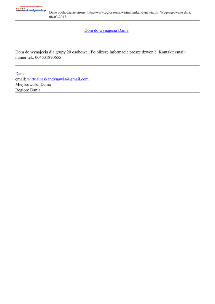 Dane pochodzą ze strony: http://www.ogloszenia.wirtualnaskandynawia.pl/. Wygenerowano dnia: 08-03-2017. Dom do wynajecia Dania Dom do wynajecia dla grupy 20 osobowej. Po bliższe informacje proszę dzwonić Kontakt: email: numer tel.: 004531870655 Dane: email: [email protected] Miejscowość: Dania Region: Dania