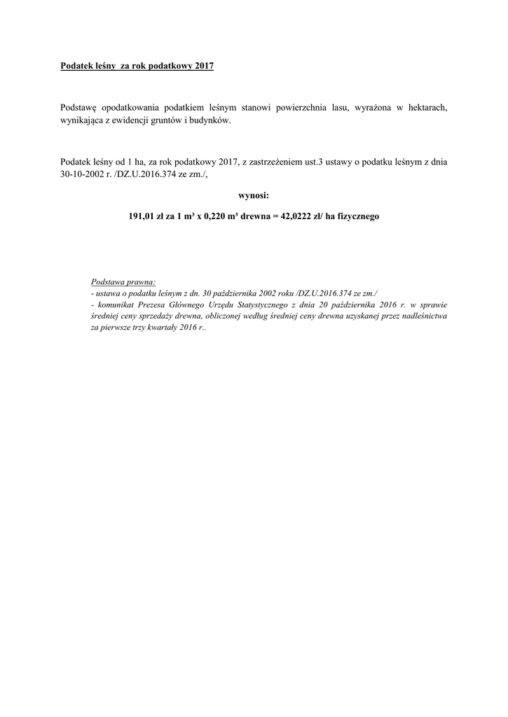 Podatek leśny za rok podatkowy 2017 Podstawę opodatkowania podatkiem leśnym stanowi powierzchnia lasu, wyrażona w hektarach, wynikająca z ewidencji gruntów i budynków. Podatek leśny od 1 ha, za rok podatkowy 2017, z zastrzeżeniem ust.3 ustawy o podatku leśnym z dnia 30-10-2002 r. /DZ.U.2016.374 ze zm./, wynosi: 191,01 zł za 1 m³ x 0,220 m³ drewna = 42,0222 zł/ ha fizycznego Podstawa prawna: - ustawa o podatku leśnym z dn. 30 października 2002 roku /DZ.U.2016.374 ze zm./ - komunikat Prezesa Głównego Urzędu Statystycznego z dnia 20 października 2016 r. w sprawie średniej ceny sprzedaży drewna, obliczonej według średniej ceny drewna uzyskanej przez nadleśnictwa za pierwsze trzy kwartały 2016 r..