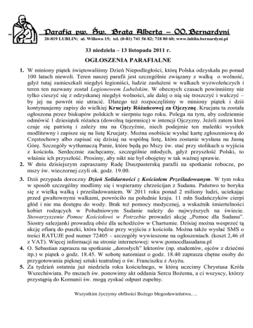 Parafia pw. Św. Brata Alberta – OO.Bernardyni 20-819 LUBLIN; ul. Willowa 15; tel. (0-81) 741 56 82; 718 80 60; www.lublin.bernardyni.pl 33 niedziela – 13 listopada 2011 r. OGŁOSZENIA PARAFIALNE 1. W miniony piątek świętowaliśmy Dzień Niepodległości, którą Polska odzyskała po ponad 100 latach niewoli. Teren naszej parafii jest szczególnie związany z walką o wolność, gdyż tutaj zamieszkali niegdyś legioniści, ludzie zasłużeni w walkach wyzwoleńczych i teren ten nazwany został Legionowem Lubelskim. W obecnych czasach powinniśmy nie tylko cieszyć się z odzyskanej niegdyś wolności, ale dalej o nią się troszczyć i walczyć – by jej na powrót nie utracić. Dlatego też rozpoczęliśmy w miniony piątek i dziś kontynuujemy zapisy do wielkiej Krucjaty Różańcowej za Ojczyznę. Krucjata ta została ogłoszona przez biskupów polskich w sierpniu tego roku. Polega na tym, aby codziennie odmówić 1 dziesiątek różańca (dowolną tajemnicę) w intencji Ojczyzny. Jeżeli zatem ktoś czuje się patriotą i zależy mu na Ojczyźnie, niech podejmie ten maleńki wysiłek modlitewny i zapisze się na listę Krucjaty. Można osobiście wysłać kartę zgłoszeniową do Częstochowy albo zapisać się dzisiaj na wspólną listę, która zostanie wysłana na Jasną Górę. Szczegóły wytłumaczą Panie, które będą po Mszy św. stać przy stolikach u wyjścia z kościoła. Serdecznie zachęcamy, szczególnie młodych, gdyż przyszłość Polski, to właśnie ich przyszłość. Prosimy, aby nikt nie był obojętny w tak ważnej sprawie. 2. W dniu dzisiejszym zapraszamy Radę Duszpasterską parafii na spotkanie robocze, po mszy św. wieczornej czyli ok. godz. 19.00. 3. Dziś przypada doroczny Dzień Solidarności z Kościołem Prześladowanym. W tym roku w sposób szczególny modlimy się i wspieramy chrześcijan z Sudanu. Państwo to boryka się z wielką walką i prześladowaniem. W 2011 roku ponad 2 miliony ludzi, uciekając przed gwałtownymi walkami, powróciło na południe kraju. 11 mln Sudańczyków cierpi głód i nie ma dostępu do wody. Brak też pomocy medycznej, a wskaźnik śmiertelności kobiet rodzących w Południowym Sudanie należy do najwyższych na świecie. Stowarzyszenie Pomoc Kościołowi w Potrzebie prowadzi akcję „Pomoc dla Sudanu”. Siostry salezjanki prowadzą obóz dla uchodźców w Chartumie. Dzisiaj można wesprzeć tą akcję ofiarą do puszki, która będzie przy wyjściu z kościoła. Można także wysłać SMS o treści RATUJE pod numer 72405 – szczegóły wywieszone na ogłoszeniach. (koszt 2,46 zł z VAT). Więcej informacji na stronie internetowej: www.pomocdlasudanu.pl 4. O. Sebastian zaprasza na spotkanie „dorosłych” lektorów (np. studentów, ojców z dziećmi itp.) w piątek o godz. 18.45. W sobotę natomiast o godz. 18.40 zaprasza chętne osoby do przygotowania pięknej sztuki teatralnej o św. Franciszku z Asyżu. 5. Za tydzień ostatnia już niedziela roku kościelnego, w którą uczcimy Chrystusa Króla Wszechświata. Po mszach św. ponowimy akt oddania Sercu Bożemu, a ci wszyscy, którzy przystąpią do Komunii św. mogą zyskać odpust zupełny. Wszystkim życzymy obfitości Bożego błogosławieństwa….