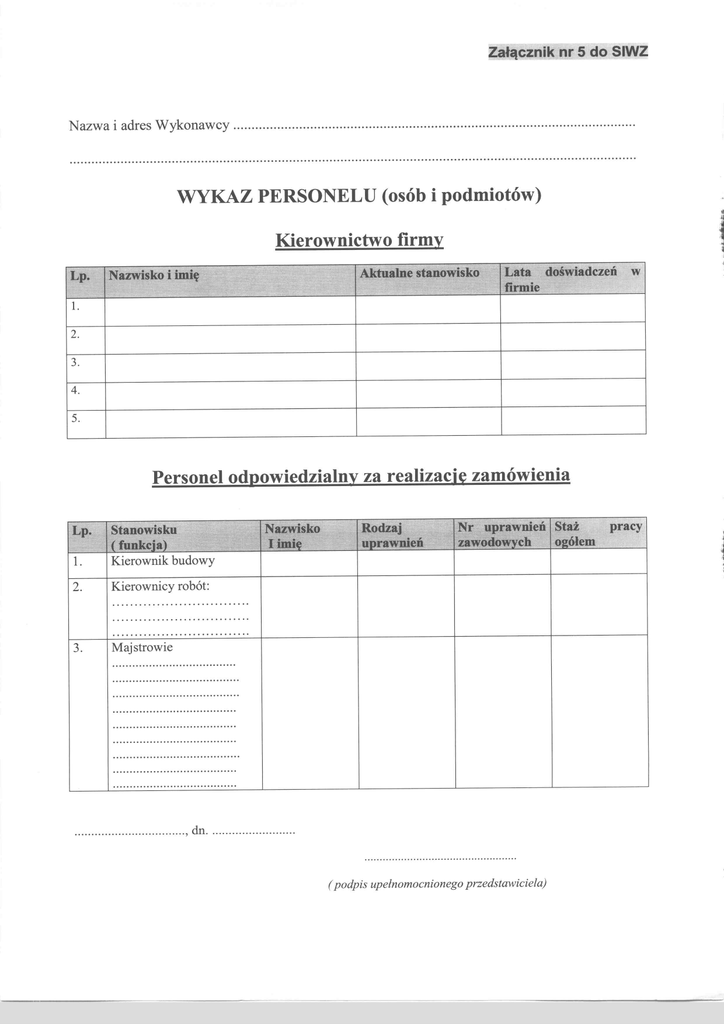 Załącznik nr 5 do SIWZ Nazwa i adres Wykonawcy ............................................................................................................. . WYKAZ PERSON ELU (osób i podmiotó w) Kierownic two firmy Lp. Nazwisko i Aktualne stanowisko imię Lata firmie doświadczeń w 1. 2. 3. 4. 5. Personel odpowiedzialny za realizacje zamówien ia 1. Stanowisku (funkcja) Kierownik budowy 2. Kierownicy robót: 3. Majstrowie Lp. Nazwisko limie Rodzaj uorawnień Nr uprawnień zawodowvch .......... .......... .......... ... , dn ........ .... ............. . (podpis upełnomocnionego przedstawiciela) Staż 02ółem pracy