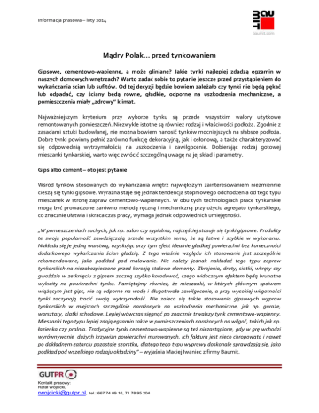 Informacja prasowa – luty 2014 Mądry Polak… przed tynkowaniem Gipsowe, cementowo-wapienne, a może gliniane? Jakie tynki najlepiej zdadzą egzamin w naszych domowych wnętrzach? Warto zadać sobie to pytanie jeszcze przed przystąpieniem do wykańczania ścian lub sufitów. Od tej decyzji będzie bowiem zależało czy tynki nie będą pękać lub odpadać, czy ściany będą równe, gładkie, odporne na uszkodzenia mechaniczne, a pomieszczenia miały „zdrowy” klimat. Najważniejszym kryterium przy wyborze tynku są przede wszystkim walory użytkowe remontowanych pomieszczeń. Niezwykle istotne są również rodzaj i właściwości podłoża. Zgodnie z zasadami sztuki budowlanej, nie można bowiem nanosić tynków mocniejszych na słabsze podłoża. Dobre tynki powinny pełnić zarówno funkcję dekoracyjną, jak i osłonową, a także charakteryzować się odpowiednią wytrzymałością na uszkodzenia i zawilgocenie. Dobierając rodzaj gotowej mieszanki tynkarskiej, warto więc zwrócić szczególną uwagę na jej skład i parametry. Gips albo cement – oto jest pytanie Wśród tynków stosowanych do wykańczania wnętrz największym zainteresowaniem niezmiennie cieszą się tynki gipsowe. Wyraźna staje się jednak tendencja stopniowego odchodzenia od tego typu mieszanek w stronę zapraw cementowo-wapiennych. W obu tych technologiach prace tynkarskie mogą być prowadzone zarówno metodą ręczną i mechaniczną przy użyciu agregatu tynkarskiego, co znacznie ułatwia i skraca czas pracy, wymaga jednak odpowiednich umiejętności. „W pomieszczeniach suchych, jak np. salon czy sypialnia, najczęściej stosuje się tynki gipsowe. Produkty te swoją popularność zawdzięczają przede wszystkim temu, że są łatwe i szybkie w wykonaniu. Nakłada się je jedną warstwą, uzyskując przy tym efekt idealnie gładkiej powierzchni bez konieczności dodatkowego wykańczania ścian gładzią. Z tego właśnie względu ich stosowanie jest szczególnie rekomendowane, jako podkład pod malowanie. Nie należy jednak nakładać tego typu zapraw tynkarskich na niezabezpieczone przed korozją stalowe elementy. Zbrojenia, druty, siatki, wkręty czy gwoździe w zetknięciu z gipsem zaczną szybko korodować, czego widocznym efektem będą brunatne wykwity na powierzchni tynku. Pamiętajmy również, że mieszanki, w których głównym spoiwem wiążącym jest gips, nie są odporne na wodę i długotrwałe zawilgocenie, a przy wysokiej wilgotności tynki zaczynają tracić swoją wytrzymałość. Nie zaleca się także stosowania gipsowych wypraw tynkarskich w miejscach szczególnie narażonych na uszkodzenia mechaniczne, jak np. garaże, warsztaty, klatki schodowe. Lepiej wówczas sięgnąć po znacznie trwalszy tynk cementowo-wapienny. Mieszanki tego typu lepiej zdają egzamin także w pomieszczeniach narażonych na wilgoć, takich jak np. łazienka czy pralnia. Tradycyjne tynki cementowo-wapienne są też niezastąpione, gdy w grę wchodzi wyrównywanie dużych krzywizn powierzchni murowanych. Ich faktura jest nieco chropowata i nawet po dokładnym zatarciu pozostaje szorstka, dlatego tego typu wyprawy doskonale sprawdzają się, jako podkład pod wszelkiego rodzaju okładziny” – wyjaśnia Maciej Iwaniec z firmy Baumit. Kontakt prasowy: Rafał Wójcicki, [email protected], tel.: 667 74 09 10, 71 78 95 204 Informacja prasowa – luty 2014 … a może zdrowa i naturalna glina? Wraz ze wzrostem świadomości społecznej w zakresie ochrony środowiska coraz większym zainteresowaniem cieszą się tynki gliniane. Architekci inspirowani ekologicznym nurtem coraz chętniej wykorzystują glinę w swoich projektach. Na czym polega jej fenomen? „Glina to naturalny surowiec o wyjątkowych właściwościach, w dodatku niezwykle plastyczny. Dopiero po wypaleniu (ceramika budowlana) staje się twarda i proces ten jest nieodwracalny. Tynki gliniane stwarzają wręcz nieograniczone możliwości kreowania wnętrz. Pozwalają uzyskać dowolny wygląd ścian, od idealnej gładzi po chropowatości i nierówności. Co ciekawe, fakturę tynków można w każdej chwili zmienić – wystarczy je zmoczyć i nadać im nowe oblicze” – mówi ekspert z firmy Baumit. Zaprawy gliniane na tle innych mieszanek tynkarskich szczególnie wyróżnia odwracalny proces wiązania. Tego typu tynki można w każdej chwili zdjąć ze ściany i po powtórnym rozrobieniu z wodą ułożyć na nowo w innym miejscu! Dzięki zastosowaniu gliny, jako spoiwa, tynk reguluje klimat (wilgotność) wewnątrz pomieszczenia, przeciwdziała zagrzybieniu i pochłania szkodliwe substancje. Producenci materiałów budowlanych oferują całą gamę tynków wewnętrznych, od tradycyjnych, cementowo-wapiennych przez gipsowe, na glinianych kończąc. Analizując bogatą ofertę rynkową w poszukiwaniu profesjonalnych materiałów, warto zwrócić szczególną uwagę na wewnętrzny tynk cementowo-wapienny Baumit MPI 25 Fine – dzięki bardzo drobnemu uziarnieniu, dający efekt wyjątkowo gładkich ścian. Strzałem w „dziesiątkę” może okazać się również naturalnie biały tynk Baumit KlimaWhite, który dzięki specjalnej budowie mikroporów „oddycha”, regulując ilość wilgoci w pomieszczeniu i w efekcie tworząc w nim zdrowy mikroklimat. Każdy tynk charakteryzuje się innymi parametrami i właściwościami, które wskazują zasadność jego zastosowania w określonych warunkach. Podczas doboru odpowiedniej mieszanki warto mieć zatem na uwadze wskazówki eksperta z firmy Baumit. Producent: Baumit www.baumit.com Baumit jest wspólną marką dwóch austriackich, rodzinnych koncernów z branży budowlanej – Schmid Industrieholding oraz Wietersdorfer Gruppe. Łączy je ponad 110-letnia tradycja i bogate doświadczenia w dziedzinie produkcji materiałów budowlanych. Już teraz przedstawicielstwa handlowe, filie lub zakłady produkcyjne Baumit znajdują się w 30 krajach Europy oraz w Chinach. Firma obecna jest w Polsce od 20 lat,