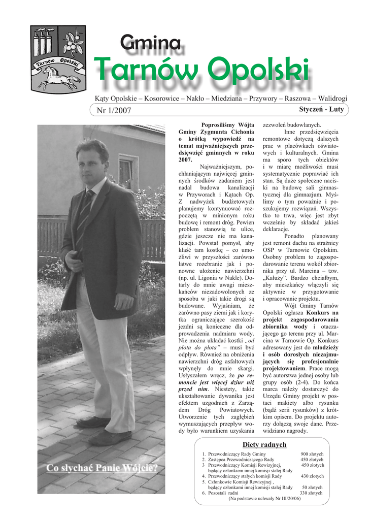 Gmina Tarnów Opolski K¹ty Opolskie – Kosorowice – Nak³o – Miedziana – Przywory – Raszowa – Walidrogi Styczeñ - Luty Nr 1/2007 Wójt zaprzysiê¿ony Poprosiliœmy Wójta Gminy Zygmunta Cichonia o krótk¹ wypowiedŸ na temat najwa¿niejszych przedsiêwziêæ gminnych w roku 2007. Najwa¿niejszym, poch³aniaj¹cym najwiêcej gminnych œrodków zadaniem jest nadal budowa kanalizacji w Przyworach i K¹tach Op. Z nadwy¿ek bud¿etowych planujemy kontynuowaæ rozpoczêt¹ w minionym roku budowê i remont dróg. Pewien problem stanowi¹ te ulice, gdzie jeszcze nie ma kanalizacji. Powsta³ pomys³, aby k³aœæ tam kostkê – co umo¿liwi w przysz³oœci zarówno ³atwe rozebranie jak i ponowne u³o¿enie nawierzchni (np. ul. Ligonia w Nakle). Dotar³y do mnie uwagi mieszkañców niezadowolonych ze sposobu w jaki takie drogi s¹ budowane. Wyjaœniam, ¿e zarówno pasy ziemi jak i korytka ograniczaj¹ce szerokoœæ jezdni s¹ konieczne dla odprowadzenia nadmiaru wody. Nie mo¿na uk³adaæ kostki „od p³ota do p³ota” – musi byæ odp³yw. Równie¿ na obni¿enia nawierzchni dróg asfaltowych wp³ynê³y do mnie skargi. Us³ysza³em wrêcz, ¿e po remoncie jest wiêcej dziur ni¿ przed nim. Niestety, takie ukszta³towanie dywanika jest efektem uzgodnieñ z Zarz¹dem Dróg Powiatowych. Utworzenie tych zag³êbieñ wymuszaj¹cych przep³yw wody by³o warunkiem uzyskania zezwoleñ budowlanych. Inne przedsiêwziêcia remontowe dotycz¹ dalszych prac w placówkach oœwiatowych i kulturalnych. Gmina ma sporo tych obiektów i w miarê mo¿liwoœci musi systematycznie poprawiaæ ich stan. S¹ du¿e spo³eczne naciski na budowê sali gimnastycznej dla gimnazjum. Myœlimy o tym powa¿nie i poszukujemy rozwi¹zañ. Wszystko to trwa, wiêc jest zbyt wczeœnie by sk³adaæ jakieœ deklaracje. Ponadto planowany jest remont dachu na stra¿nicy OSP w Tarnowie Opolskim. Osobny problem to zagospodarowanie terenu wokó³ zbiornika przy ul. Marcina – tzw. „Ka³u¿y”. Bardzo chcia³bym, aby mieszkañcy w³¹czyli siê aktywnie w przygotowanie i opracowanie projektu. Wójt Gminy Tarnów Opolski og³asza Konkurs na projekt zagospodarowania zbiornika wody i otaczaj¹cego go terenu przy ul. Marcina w Tarnowie Op. Konkurs adresowany jest do m³odzie¿y i osób doros³ych niezajmuj¹cych siê profesjonalnie projektowaniem. Prace mog¹ byæ autorstwa jednej osoby lub grupy osób (2-4). Do koñca marca nale¿y dostarczyæ do Urzêdu Gminy projekt w postaci makiety albo rysunku (b¹dŸ serii rysunków) z krótkim opisem. Do projektu autorzy do³¹cz¹ swoje dane. Przewidziano nagrody. Diety radnych 1. Przewodnicz¹cy Rady Gminy 900 z³otych 2. Zastêpca Przewodnicz¹cego Rady 450 z³otych 3 Przewodnicz¹cy Komisji Rewizyjnej, 450 z³otych bêd¹cy cz³onkiem innej komisji sta³ej Rady 4. Przewodnicz¹cy sta³ych komisji Rady 430 z³otych 5. Cz³onkowie Komisji Rewizyjnej , bêd¹cy cz³onkami innej komisji sta³ej Rady 50 z³otych 6. Pozostali radni 330 z³otych (Na podstawie uchwa³y Nr III/20/06)