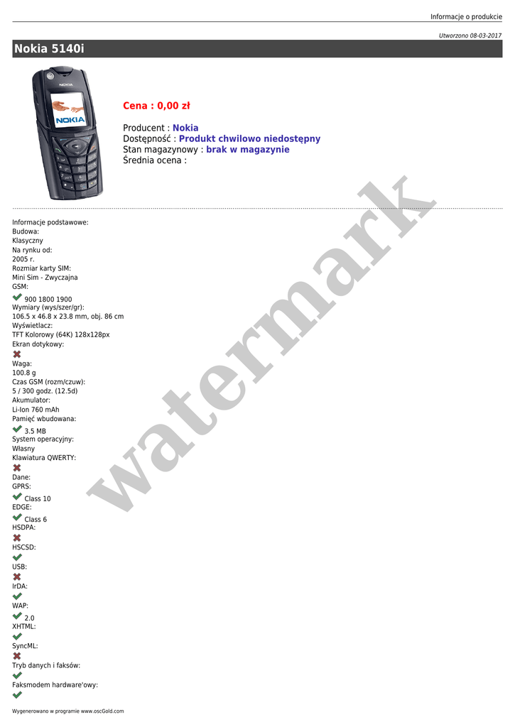 Informacje o produkcie Utworzono 08-03-2017 Nokia 5140i Cena : 0,00 zł Informacje podstawowe: Budowa: Klasyczny Na rynku od: 2005 r. Rozmiar karty SIM: Mini Sim - Zwyczajna GSM: 900 1800 1900 Wymiary (wys/szer/gr): 106.5 x 46.8 x 23.8 mm, obj. 86 cm Wyświetlacz: TFT Kolorowy (64K) 128x128px Ekran dotykowy: Dane: GPRS: w 3.5 MB System operacyjny: Własny Klawiatura QWERTY: at Waga: 100.8 g Czas GSM (rozm/czuw): 5 / 300 godz. (12.5d) Akumulator: Li-Ion 760 mAh Pamięć wbudowana: er m ar k Producent : Nokia Dostępność : Produkt chwilowo niedostępny Stan magazynowy : brak w magazynie Średnia ocena : Class 10 EDGE: Class 6 HSDPA: HSCSD: USB: IrDA: WAP: 2.0 XHTML: SyncML: Tryb danych i faksów: Faksmodem hardware'owy: Wygenerowano w programie www.oscGold.com Multimedia: Aparat fot.: 0.3 MPx Rozdzielczość: 640x480px Zoom cyfrowy: 2x Zoom optyczny: Lampa błyskowa: Autofocus: Drugi aparat: Zapis video: er m ar k H.263 Video telefon: Radio: RDS: Nadajnik FM: Odtwarzacz MP3: Wyjście audio: Formaty dźwięku: AMR, MIDI, MP3 Polifonia: 24 Video dzwonki: Dzwonki MP3: Gry: MIDP 2.0 TV-out: Odbiornik TV: w Odtwarzacz Video: H.263 Wiadomości: SMS: EMS: MMS: Klient e-mail: Słownik: T9 Smart Messaging: Chat: Instant Messaging: Komunikacja: Push to talk: VoIP: at Java: Informacje o produkcie Zawieszanie połączeń: Poł. konferencyjne: Funkcje głosowe: Dyktafon: Głośnomówiący: Wybieranie głosowe: Organizer: Kalendarz: Zegarek: Budzik: er m ar k Stoper: Kalkulator: Przelicznik walut: Przelicznik jednostek: Tryb w samolocie: Profile: Inne funkcje: GPS: Vibra: RSS: DualSIM: Wymienna obudowa: at Telefon odporny: Inne informacje: Uwagi: ● ● ● ● ● Dostępna obudowa z wbudowanym GPS Latarka Miernik natężenie dźwięku Poziomica z obudowie Cyfrowy kompas Thermometer w ● Wygenerowano w programie www.oscGold.com