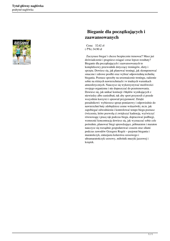 Tytuł główny nagłówka podtytuł nagłówka Bieganie dla początkujących i zaawansowanych Cena: 32.62 zł (-7%) 34.90 zł Zaczynasz biegać i chcesz bezpiecznie trenować? Masz już doświadczenie i pragniesz osiągać coraz lepsze rezultaty? Bieganie dla początkujących i zaawansowanych to kompleksowy przewodnik dotyczący treningów, diety i sprzętu. Dowiesz się, jak planować treningi, jak skomponować smaczne i zdrowe posiłki oraz wybrać odpowiednią technikę biegania. Poznasz sposoby na urozmaicenie treningu, radzenie sobie na różnych nawierzchniach i w trudnych warunkach atmosferycznych. Nauczysz się wykorzystywać możliwości swojego organizmu i nie dopuszczać do przetrenowania. Dowiesz się, jak unikać kontuzji i błędów wynikających z niewiedzy albo zaniedbań, tak aby sport przynosił ci przede wszystkim korzyści i sprawiał przyjemność. Dzięki poradnikowi: wybierzesz sprzęt pomiarowy i odpowiednie do nawierzchni buty zdobędziesz cenne wskazówki, m.in. jak zapobiegać odwodnieniu i kontrolować tempo biegu poznasz ćwiczenia, które pozwolą ci zwiększyć kadencję, wyćwiczyć równowagę i pracę rąk podczas biegu, dopracować podbiegi, wzmocnić koncentrację dowiesz się, jak wyznaczać sobie cele pośrednie, planować biegi sprawdzające, półmaraton i maraton nauczysz się rozsądnie gospodarować czasem oraz siłami podczas zawodów Grzegorz Rogóż – pasjonat biegania i maratończyk, entuzjasta kolarstwa szosowego i ultramaratończyk szosowy, miłośnik muzyki jazzowej i książek. 1/1 Powered by TCPDF (www.tcpdf.org)