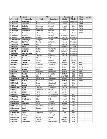LP 1 2 3 4 5 6 7 8 9 10 11 12 13 14 15 16 17 18 19 20 21 22 23 24 25 26 27 28 29 30 31 32 33 34 35 36 37 38 39 40 41 42 43 44 45 Imię Michał Tomasz Maciej Jakub Henryk Jacek Łukasz Marek Mirosław Tomasz Adrian Bartosz Michał UWE Florian Kamil Artur Tomasz Adam Artur Piotr Marek Kamil Paweł Piotr TOMASZ Marek Michał Piotr Krzysztof ŁUKASZ JACEK Miłosz Maciej Tomasz Grzegorz Przemek Sławomir Romuald Tomasz Krzysztof Daniel Mateusz Daniel Daniel Kierowca Nazwisko Radołowicz Mrzygłód Kmiecik Najgrodzki Sosnowski Koselski Kobiela Mrówczyński Maciączyk Zieliński Zawadka Gęca Ferenczak BENDIG Wojcik mirski Hornik Kobiela Powroźnik Owczarz Woźniak Kapusta Kałucki Florczyk Rączka Sikorski MIZERA Karkut Gruca Nowok Pająk KĘPA CHEBA Brodowski Watras Smolarczyk Ira Mendrek Forma Stasik Kobylański Jarosz Wulczyński Zapart Turoń Dembinny Pilot Imię B.D. Dawid Katarzyna Agnieszka Sławomir Sebastian Tobiasz Damian Grzegorz Renata B.D. B.D. Bartosz RAFAŁ B.D. Krzysztof B.D. Tomasz Dawid Miroslaw Agnieszka Jakub Bartłomiej Michał B.D. SŁAWOMIR Dawid Daniel Jacek Krzysztof MAŁGORZATA PIOTR Oskar Kamil B.D. Dawid Jakub Krzysztof Grzegorz Piotr Zbigniew Marcin Maciej Krzysztof Damian Nazwisko B.D. Sołtysek Kmiecik Szybaj Gorący Nadzieja Spratek Osuchowski Tkacz Żabówka B.D. B.D. Chotarski TELEGA B.D. Pietruszka B.D. Moskal Kuboszek Turchan Kapusta Hołysz Długozima Kołotyło B.D. WAJSMAN Glistak Okrutniak Nowok Szlachetka DUDA NAWROCKI Tichanowicz Kluczewski B.D. Tomala Kwiczała Rzecznik Pękala Kobylański Zajas Franczyk Kozak Śliż Włodarczyk Samochód Marka Model RENAULT TWINGO Honda Civic Renault Clio FIAT S.C. FIAT S.C. Honda Civic Mitsubishi Lancer Subaru Impreza Mitsubishi Lancer Subaru Impreza Subaru Impreza Hyundai COUPE Subaru Impreza SUBARU Impreza Subaru Impreza Subaru Impreza Mitsubishi Lancer Audi Coupe Nissan 350z Polonez Caro BMW E36 BMW 323i BMW M3 BMW E36 BMW 320i E30 BMW E36 M3 BMW E30 Renault Clio Renault Clio Subaru Impreza HONDA Civic AUDI 80 Renault Clio Renault Clio Renault Clio Honda Civic Honda Civic Opel Astra Citroen C2 OPEL KADETT Opel Astra Renault Clio Citroen Saxo Peugeot 106 Honda CRX Klasa Klasa GOŚĆ GOŚĆ GOŚĆ GOŚĆ GOŚĆ GOŚĆ 4 4 4 4 4 4 4 4 4 4 4 4 RWD RWD RWD RWD RWD RWD RWD RWD RWD 3 3 3 3 3 3 3 3 3 3 3 3 3 3 3 2 2 2 Uwagi 46 47 48 49 50 51 52 53 54 55 56 57 58 59 60 61 62 63 64 65 66 67 68 69 70 71 72 73 74 75 76 77 78 79 80 1 2 3 4 5 Grzegorz Tomasz Łukasz Marcin Łukasz Dawid Łukasz Krzysztof Dawid Maślanka Jakub Leszek Łukasz Łukasz Krystian Paweł Wojciech Marek Mariusz Piotr Kacper Łukasz Jakub Marcin Krzysztof Adam Dominik Marcin Wojciech Wiktor Wojciech Marek Mateusz Szymon Robert Marek Sylwester Krzysztof Ciombor KUCHARSKI Sternal Zieliński Stoga Tomala Ulman Jastrzębski Trzpiot Józef Tomalik Gluza Brożek Semik Pawlik Oślak Strączyński Mendela Grudka Bugajski Włoch Dusza Pisarek Idzi Wadas Pawłowski Wenglorz Tracz de Weyher Kluczny Pawiński Fila Rusinek Kurasik Dudek Czudek Wojciechowski Grzywacz Dominik Krzysztof Justyna Adam B.D. Grzegorz Piotr Kamil Piotr B.D. B.D. Przemysław B.D. Mateusz Łukasz b.d. B.D. Robert Marcin Bartosz Andrzej Gabriela Krystian Dawid Paweł Magda Piotr Michał Michał Adrian Monika Michał Michał Bartosz Karolina Krzysztof Andrzej Kazimierz Grabowski KUCHARSKI Sternal Zieliński B.D. Ira Czerkaski Nowak Leks B.D. B.D. Kasza B.D. Bartosik Salwirak b.d. B.D. Krzyża Gut Krawiec Poradzisz Stalmach Papkoj Kania Żyła Pawłowska Wieczorek Tracz Fogiński Fajferek Biłek Środa Wróbel LISTA REZERWOWA Janiszewski Piechówka Cieśla Kańczura Gargas Honda Daewoo Citroen Citroen Honda Honda Honda Daewoo Honda RENAULT Daewoo Honda FIAT FIAT FIAT FIAT Nissan FIAT FIAT FIAT FIAT FIAT FIAT FIAT FIAT FIAT FIAT FIAT FIAT FIAT FIAT FIAT FIAT Civic Lanos C2 C2 Civic Crx Civic Lanos Civic Clio Lanos Civic CC S.C. S.C. CC Micra S.C. CC S.C. CC S.C. S.C. CC S.C. CC CC CC S.C. S.C. CC CC CC 2 2 2 2 2 2 2 2 2 2 2 1 1 1 1 1 1 CENTO CENTO CENTO CENTO CENTO CENTO CENTO CENTO CENTO CENTO CENTO CENTO CENTO CENTO CENTO CENTO mitsubishi Peugeot Renault Peugeot FIAT colt gti Clio 3 106 CC 2 3 Gość 2 GOŚĆ b.opłaty b.opłaty b.opłaty b.opłaty REZYG.