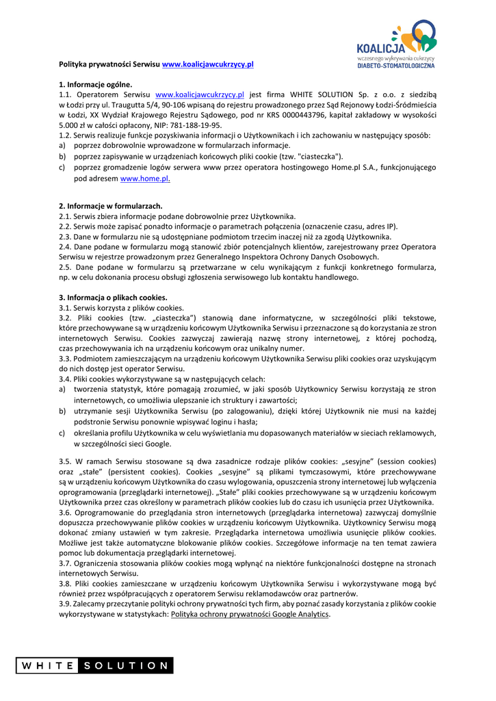 Polityka prywatności Serwisu www.koalicjawcukrzycy.pl 1. Informacje ogólne. 1.1. Operatorem Serwisu www.koalicjawcukrzycy.pl jest firma WHITE SOLUTION Sp. z o.o. z siedzibą w Łodzi przy ul. Traugutta 5/4, 90-106 wpisaną do rejestru prowadzonego przez Sąd Rejonowy Łodzi-Śródmieścia w Łodzi, XX Wydział Krajowego Rejestru Sądowego, pod nr KRS 0000443796, kapitał zakładowy w wysokości 5.000 zł w całości opłacony, NIP: 781-188-19-95. 1.2. Serwis realizuje funkcje pozyskiwania informacji o Użytkownikach i ich zachowaniu w następujący sposób: a) poprzez dobrowolnie wprowadzone w formularzach informacje. b) poprzez zapisywanie w urządzeniach końcowych pliki cookie (tzw. "ciasteczka"). c) poprzez gromadzenie logów serwera www przez operatora hostingowego Home.pl S.A., funkcjonującego pod adresem www.home.pl. 2. Informacje w formularzach. 2.1. Serwis zbiera informacje podane dobrowolnie przez Użytkownika. 2.2. Serwis może zapisać ponadto informacje o parametrach połączenia (oznaczenie czasu, adres IP). 2.3. Dane w formularzu nie są udostępniane podmiotom trzecim inaczej niż za zgodą Użytkownika. 2.4. Dane podane w formularzu mogą stanowić zbiór potencjalnych klientów, zarejestrowany przez Operatora Serwisu w rejestrze prowadzonym przez Generalnego Inspektora Ochrony Danych Osobowych. 2.5. Dane podane w formularzu są przetwarzane w celu wynikającym z funkcji konkretnego formularza, np. w celu dokonania procesu obsługi zgłoszenia serwisowego lub kontaktu handlowego. 3. Informacja o plikach cookies. 3.1. Serwis korzysta z plików cookies. 3.2. Pliki cookies (tzw. „ciasteczka”) stanowią dane informatyczne, w szczególności pliki tekstowe, które przechowywane są w urządzeniu końcowym Użytkownika Serwisu i przeznaczone są do korzystania ze stron internetowych Serwisu. Cookies zazwyczaj zawierają nazwę strony internetowej, z której pochodzą, czas przechowywania ich na urządzeniu końcowym oraz unikalny numer. 3.3. Podmiotem zamieszczającym na urządzeniu końcowym Użytkownika Serwisu pliki cookies oraz uzyskującym do nich dostęp jest operator Serwisu. 3.4. Pliki cookies wykorzystywane są w następujących celach: a) tworzenia statystyk, które pomagają zrozumieć, w jaki sposób Użytkownicy Serwisu korzystają ze stron internetowych, co umożliwia ulepszanie ich struktury i zawartości; b) utrzymanie sesji Użytkownika Serwisu (po zalogowaniu), dzięki której Użytkownik nie musi na każdej podstronie Serwisu ponownie wpisywać loginu i hasła; c) określania profilu Użytkownika w celu wyświetlania mu dopasowanych materiałów w sieciach reklamowych, w szczególności sieci Google. 3.5. W ramach Serwisu stosowane są dwa zasadnicze rodzaje plików cookies: „sesyjne” (session cookies) oraz „stałe” (persistent cookies). Cookies „sesyjne” są plikami tymczasowymi, które przechowywane są w urządzeniu końcowym Użytkownika do czasu wylogowania, opuszczenia strony internetowej lub wyłączenia oprogramowania (przeglądarki internetowej). „Stałe” pliki cookies przechowywane są w urządzeniu końcowym Użytkownika przez czas określony w parametrach plików cookies lub do czasu ich usunięcia przez Użytkownika. 3.6. Oprogramowanie do przeglądania stron internetowych (przeglądarka internetowa) zazwyczaj domyślnie dopuszcza przechowywanie plików cookies w urządzeniu końcowym Użytkownika. Użytkownicy Serwisu mogą dokonać zmiany ustawień w tym zakresie. Przeglądarka internetowa umożliwia usunięcie plików cookies. Możliwe jest także automatyczne blokowanie plików cookies. Szczegółowe informacje na ten temat zawiera pomoc lub dokumentacja przeglądarki internetowej. 3.7. Ograniczenia stosowania plików cookies mogą wpłynąć na niektóre funkcjonalności dostępne na stronach internetowych Serwisu. 3.8. Pliki cookies zamieszczane w urządzeniu końcowym Użytkownika Serwisu i wykorzystywane mogą być również przez współpracujących z operatorem Serwisu reklamodawców oraz partnerów. 3.9. Zalecamy przeczytanie polityki ochrony prywatności tych firm, aby poznać zasady korzystania z plików cookie wykorzystywane w statystykach: Polityka ochrony prywatności Google Analytics. 3.10. Pliki cookie mogą być wykorzystane przez sieci reklamowe, w szczególności sieć Google, do wyświetlenia reklam dopasowanych do sposobu, w jaki Użytkownik korzysta z Serwisu. W tym celu mogą zachować informację o ścieżce nawigacji użytkownika lub czasie pozostawania na danej stronie. 3.11. W zakresie informacji o preferencjach Użytkownika gromadzonych przez sieć reklamową Google użytkownik może przeglądać i edytować informacje wynikające z plików cookies przy pomocy narzędzia: https://www.google.com/ads/preferences/ 4. Logi serwera. 4.1. Informacje o niektórych zachowaniach Użytkowników podlegają logowaniu w warstwie serwerowej. Dane te są wykorzystywane wyłącznie w celu administrowania serwisem oraz w celu zapewnienia jak najbardziej sprawnej obsługi świadczonych usług hostingowych. 4.2. Przeglądane zasoby identyfikowane są poprzez adresy URL. Ponadto zapisowi mogą podlegać: a) czas nadejścia zapytania, b) czas wysłania odpowiedzi, c) nazwę stacji klienta – identyfikacja realizowana przez protokół HTTP, d) informacje o błędach jakie nastąpiły przy realizacji transakcji HTTP, e) adres URL strony poprzednio odwiedzanej przez Użytkownika (referer link) – w przypadku gdy przejście do Serwisu nastąpiło przez odnośnik, f) informacje o przeglądarce Użytkownika, g) informacje o adresie IP. 4.3. Dane powyższe nie są kojarzone z konkretnymi osobami przeglądającymi strony. 4.4. Dane powyższe są wykorzystywane jedynie dla celów administrowania serwerem. 5. Udostępnienie danych. 5.1. Dane podlegają udostępnieniu podmiotom zewnętrznym wyłącznie w granicach prawnie dozwolonych. 5.2. Dane umożliwiające identyfikację osoby fizycznej są udostępniane wyłączenie z