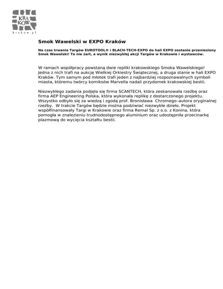 Smok Wawelski w EXPO Kraków Na czas trwania Targów EUROTOOL® i BLACH-TECH-EXPO do hali EXPO zostanie przeniesiony Smok Wawelski! To nie żart, a wynik niezwykłej akcji Targów w Krakowie i wystawców. W ramach współpracy powstaną dwie repliki krakowskiego Smoka Wawelskiego! Jedna z nich trafi na aukcję Wielkiej Orkiestry Świątecznej, a druga stanie w hali EXPO Kraków. Tym samym pod młotek trafi jeden z najbardziej rozpoznawalnych symboli miasta, któremu twórcy komiksów Marvella nadali przydomek krakowskiej bestii. Niezwykłego zadania podjęła się firma SCANTECH, która zeskanowała rzeźbę oraz firma AEP Engineering Polska, która wykonała replikę z dostarczonego projektu. Wszystko odbyło się za wiedzą i zgodą prof. Bronisława Chromego–autora oryginalnej rzeźby. W trakcie Targów będzie można podziwiać niezwykłe dzieło. Projekt współfinansowały Targi w Krakowie oraz firma Remal Sp. z o.o. z Konina, która pomogła w znalezieniu trudnodostępnego aluminium oraz udostępniła przecinarkę plazmową do wycięcia kształtu bestii. Powered by TCPDF (www.tcpdf.org)