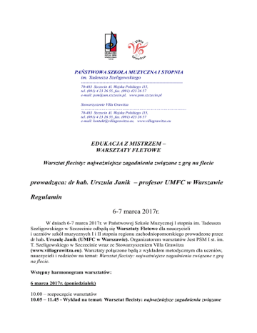 PAŃSTWOWA SZKOŁA MUZYCZNA I STOPNIA im. Tadeusza Szeligowskiego ----------------------------------------------------------------------70-483 Szczecin Al. Wojska Polskiego 115, tel. (091) 4 23 26 55, fax. (091) 423 26 57 e-mail: [email protected], www.psm.szczecin.pl Stowarzyszenie Villa Grawitza ……………………………………………………………………………….. 70-483 Szczecin Al. Wojska Polskiego 115, tel. (091) 4 23 26 55, fax. (091) 423 26 57 e-mail: [email protected], www.villagrawitza.eu EDUKACJA Z MISTRZEM – WARSZTATY FLETOWE Warsztat flecisty: najważniejsze zagadnienia związane z grą na flecie prowadząca: dr hab. Urszula Janik – profesor UMFC w Warszawie Regulamin 6-7 marca 2017r. W dniach 6-7 marca 2017r. w Państwowej Szkole Muzycznej l stopnia im. Tadeusza Szeligowskiego w Szczecinie odbędą się Warsztaty Fletowe dla nauczycieli i uczniów szkół muzycznych I i II stopnia regionu zachodniopomorskiego prowadzone przez dr hab. Urszulę Janik (UMFC w Warszawie). Organizatorem warsztatów Jest PSM I st. im. T. Szeligowskiego w Szczecinie wraz ze Stowarzyszeniem Villa Grawitza (www.villagrawitza.eu). Warsztaty połączone będą z wykładem metodycznym dla uczniów, nauczycieli i rodziców na temat: Warsztat flecisty: najważniejsze zagadnienia związane z grą na flecie. Wstępny harmonogram warsztatów: 6 marca 2017r. (poniedziałek) 10.00 – rozpoczęcie warsztatów 10.05 – 11.45 - Wykład na temat: Warsztat flecisty: najważniejsze zagadnienia związane z grą na flecie 11.45 – 12.45 – lekcje otwarte 12.45-13.00 – przerwa kawowa 13.00 -14.30 – lekcje otwarte 14.30 – 15.30 - przerwa obiadowa 17.00 – Recital fletowy w wykonaniu pani prof. Urszuli Janik w auli PSM 7 marca 2017r. (wtorek) 9.00 –11.15– rozpoczęcie drugiego dnia warsztatów 9.00-11.15 - lekcje otwarte 11.15-11.30 – przerwa kawowa 11.30 -13.00 – lekcje otwarte 13.15-14.30 – przerwa obiadowa 14.45 – 15.45 prezentacja fletów firmy Yamaha Udział w warsztatach jest odpłatny: - 30 zł – dla każdego ucznia Uczestniczący w warsztatach uczniowie przygotowują dowolny repertuar fletowy - istnieje możliwość wykupienia dwudaniowego obiadu z napojem w restauracji w pobliżu szkoły w cenie 15,50 zł Wpłaty prosimy dokonać na konto: 93 1020 4795 0000 9002 0278 6119 (z nazwiskiem ucznia i dopiskiem warsztaty fletowe) Zgłoszenia prosimy nadsyłać do dnia 28 lutego 2017r. wraz z dowodem wpłaty faxem pod numer tel. 91 423 26 57 lub pocztą elektroniczną: e-mail [email protected] Szczegółowy harmonogram warsztatów zostanie zamieszczony do dnia 3 marca 2017r. na stronie internetowej szkoły www.psm.szczecin.pl Ze względu na ograniczenia czasowe warsztatów organizator zastrzega sobie prawo wyboru uczniów do udziału w indywidualnych lekcjach otwartych (posiadamy około 10 miejsc dla czynnych uczestników). Informacji udziela koordynatorka warsztatów tel. 884 874 524 oraz sekretariat szkoły tel. 91 423 26 55 Iwona Radin-Rutkowska