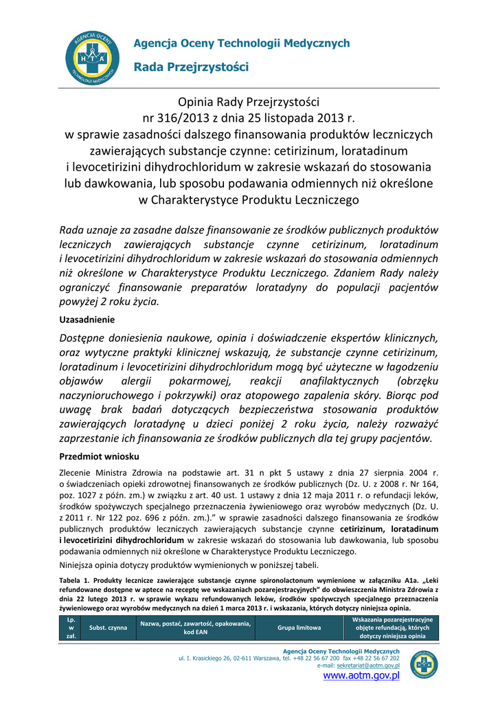 Agencja Oceny Technologii Medycznych Rada Przejrzystości Opinia Rady Przejrzystości nr 316/2013 z dnia 25 listopada 2013 r. w sprawie zasadności dalszego finansowania produktów leczniczych zawierających substancje czynne: cetirizinum, loratadinum i levocetirizini dihydrochloridum w zakresie wskazań do stosowania lub dawkowania, lub sposobu podawania odmiennych niż określone w Charakterystyce Produktu Leczniczego Rada uznaje za zasadne dalsze finansowanie ze środków publicznych produktów leczniczych zawierających substancje czynne cetirizinum, loratadinum i levocetirizini dihydrochloridum w zakresie wskazań do stosowania odmiennych niż określone w Charakterystyce Produktu Leczniczego. Zdaniem Rady należy ograniczyć finansowanie preparatów loratadyny do populacji pacjentów powyżej 2 roku życia. Uzasadnienie Dostępne doniesienia naukowe, opinia i doświadczenie ekspertów klinicznych, oraz wytyczne praktyki klinicznej wskazują, że substancje czynne cetirizinum, loratadinum i levocetirizini dihydrochloridum mogą być użyteczne w łagodzeniu objawów alergii pokarmowej, reakcji anafilaktycznych (obrzęku naczynioruchowego i pokrzywki) oraz atopowego zapalenia skóry. Biorąc pod uwagę brak badań dotyczących bezpieczeństwa stosowania produktów zawierających loratadynę u dzieci poniżej 2 roku życia, należy rozważyć zaprzestanie ich finansowania ze środków publicznych dla tej grupy pacjentów. Przedmiot wniosku Zlecenie Ministra Zdrowia na podstawie art. 31 n pkt 5 ustawy z dnia 27 sierpnia 2004 r. o świadczeniach opieki zdrowotnej finansowanych ze środków publicznych (Dz. U. z 2008 r. Nr 164, poz. 1027 z późn. zm.) w związku z art. 40 ust. 1 ustawy z dnia 12 maja 2011 r. o refundacji leków, środków spożywczych specjalnego przeznaczenia żywieniowego oraz wyrobów medycznych (Dz. U. z 2011 r. Nr 122 poz. 696 z późn. zm.).” w sprawie zasadności dalszego finansowania ze środków publicznych produktów leczniczych zawierających substancje czynne cetirizinum, loratadinum i levocetirizini dihydrochloridum w zakresie wskazań do stosowania lub dawkowania, lub sposobu podawania odmiennych niż określone w Charakterystyce Produktu Leczniczego. Niniejsza opinia dotyczy produktów wymienionych w poniższej tabeli. Tabela 1. Produkty lecznicze zawierające substancje czynne spironolactonum wymienione w załączniku A1a. „Leki refundowane dostępne w aptece na receptę we wskazaniach pozarejestracyjnych” do obwieszczenia Ministra Zdrowia z dnia 22 lutego 2013 r. w sprawie wykazu refundowanych leków, środków spożywczych specjalnego przeznaczenia żywieniowego oraz wyrobów medycznych na dzień 1 marca 2013 r. i wskazania, których dotyczy niniejsza opinia. Lp. w zał. Subst. czynna Nazwa, postać, zawartość, opakowania, kod EAN Grupa limitowa Wskazania pozarejestracyjne objęte refundacją, których dotyczy niniejsza opinia Agencja Oceny Technologii Medycznych ul. I. Krasickiego 26, 02-611 Warszawa, tel. +48 22 56 67 200 fax +48 22 56 67 202 e-mail: [email protected] www.aotm.gov.pl Opinia Rady Przejrzystości AOTM nr 316/2013 z dnia 25 listopada 2013 r. A1a 258 Alermed, tabl. powl., 10 mg 259 Alermed, tabl. powl., 10 mg 260 Allertec, tabl. powl., 10 mg, 30 tabl. (2 blist.po 15 szt.) Allertec, syrop, 5 mg/5ml, 1 but.a 100 ml 261 265 Allertec, krople doustne, roztwór, 10 mg/ml, 10 ml w but. z kroplomierzem Allertec, krople doustne, roztwór, 10 mg/ml, 20 ml w but. z kroplomierzem Amertil, roztwor doustny, 1 mg/ml, 200 ml (but.) Amertil, tabl. powl., 10 mg, 20 tabl. 266 Amertil, tabl. powl., 10 mg, 30 tabl. 267 CetAlergin, syrop, 1 mg/ml, 75 ml 268 Cetirizinum CetAlergin, syrop, 1 mg/ml, 150 ml 269 CetAlergin, krople, 10 mg/ml, 10 ml 262 263 264 CetAlergin, tabl. powl., 10 mg, 20 tabl. (2 blist.po 10 szt.) Cetigran, tabl. powl., 10 mg, 28 tabl. (4 blist.po 7 szt.) Letizen, tabl. powl., 10 mg, 20 tabl. 270 271 272 275 Zyrtec, tabl. powl., 10 mg, 20 tabl. (2 blist.po 10 szt.) Zyrtec, tabl. powl., 10 mg, 30 tabl. (3 blist.po 10 szt.) Zyrtec, krople doustne, 10 mg/ml, 10 ml 276 Zyrtec, krople doustne, 10 mg/ml, 20 ml 277 Zyrtec, roztwór do stosowania doustnego, 1 mg/ml, 75 ml 273 274 Aleric, tabl., 10 mg; 30 tabl. (1 blist.po 30 szt.) Claritine, tabl., 10 mg; 30 tabl. (3 blist.po 10 szt.) Claritine, syrop, 1 mg/ml, 120 ml 661 662 663 Flonidan, tabl., 10 mg, 60 tabl. (6 blist.po 10 szt.) Flonidan, tabl., 10 mg, 90 tabl. (9 blist.po 10 szt.) Flonidan, tabl., 10 mg, 30 tabl. (3 blist.po 10 szt.) Flonidan, zawiesina doustna, 1 mg/ml, 120 ml 664 665 666 Loratadinum 667 Loratadyna Galena, tabl., 10 mg, 60 tabl. (6 blist.po 10 szt.) Loratadyna Galena, tabl., 10 mg, 90 tabl. (9 blist.po 10 szt.) Loratadyna Galena, tabl., 10 mg, 30 tabl. (3 blist.po 10 szt.) Loratan, syrop, 5 mg/5ml, 125 ml (but.) 668 669 670 671 Loratan, kaps. miękkie, 10 mg, 30 kaps. (2 blist.po 15 szt.) 672 642 207.1, Leki przeciwhistaminowe do stosowania doustnego - stałe postacie farmaceutyczne Cezera, tabl. powl., 5 mg, 20 tabl. Levocetirizini dihydrochloridum Cezera, tabl. powl., 5 mg, 30 tabl. 643 2/8 Atopowe zapalenie skóry; Alergie pokarmowe, reakcje anafilaktyczne (pokrzywka, obrzęk naczynioruchowy Quinckego) - od 6 miesiąca życia 207.2, Leki przeciwhistaminowe do stosowania doustnego płynne postacie farmaceutyczne 207.1, Leki przeciwhistaminowe do stosowania doustnego - stałe postacie farmaceutyczne 207.2, Leki przeciwhistaminowe do stosowania doustnego płynne postacie farmaceutyczne 207.1, Leki przeciwhistaminowe do stosowania doustnego - stałe postacie farmaceutyczne 207.2, Leki przeciwhistaminowe do stosowania doustnego płynne postacie farmaceutyczne 207.1, Leki przeciwhistaminowe do stosowania doustnego - stałe postacie farmaceutyczne 207.2, Leki przeciwhistaminowe do stosowania doustnego płynne postacie farmaceutyczne 207.1, Leki przeciwhistaminowe do stosowania doustnego - stałe postacie farmaceutyczne 207.1, Leki przeciwhistaminowe do stosowania doustnego