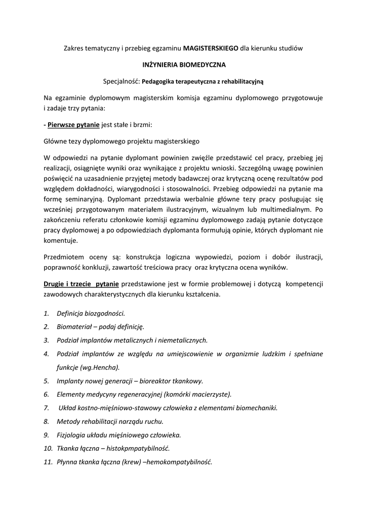 Zakres tematyczny i przebieg egzaminu MAGISTERSKIEGO dla kierunku studiów INŻYNIERIA BIOMEDYCZNA Specjalność: Pedagogika terapeutyczna z rehabilitacyjną Na egzaminie dyplomowym magisterskim komisja egzaminu dyplomowego przygotowuje i zadaje trzy pytania: - Pierwsze pytanie jest stałe i brzmi: Główne tezy dyplomowego projektu magisterskiego W odpowiedzi na pytanie dyplomant powinien zwięźle przedstawić cel pracy, przebieg jej realizacji, osiągnięte wyniki oraz wynikające z projektu wnioski. Szczególną uwagę powinien poświęcić na uzasadnienie przyjętej metody badawczej oraz krytyczną ocenę rezultatów pod względem dokładności, wiarygodności i stosowalności. Przebieg odpowiedzi na pytanie ma formę seminaryjną. Dyplomant przedstawia werbalnie główne tezy pracy posługując się wcześniej przygotowanym materiałem ilustracyjnym, wizualnym lub multimedialnym. Po zakończeniu referatu członkowie komisji egzaminu dyplomowego zadają pytanie dotyczące pracy dyplomowej a po odpowiedziach dyplomanta formułują opinie, których dyplomant nie komentuje. Przedmiotem oceny są: konstrukcja logiczna wypowiedzi, poziom i dobór ilustracji, poprawność konkluzji, zawartość treściowa pracy oraz krytyczna ocena wyników. Drugie i trzecie pytanie przedstawione jest w formie problemowej i dotyczą kompetencji zawodowych charakterystycznych dla kierunku kształcenia. 1. Definicja biozgodności. 2. Biomateriał – podaj definicję. 3. Podział implantów metalicznych i niemetalicznych. 4. Podział implantów ze względu na umiejscowienie w organizmie ludzkim i spełniane funkcje (wg.Hencha). 5. Implanty nowej generacji – bioreaktor tkankowy. 6. Elementy medycyny regeneracyjnej (komórki macierzyste). 7. Układ kostno-mięśniowo-stawowy człowieka z elementami biomechaniki. 8. Metody rehabilitacji narządu ruchu. 9. Fizjologia układu mięśniowego człowieka. 10. Tkanka łączna – histokpmpatybilność. 11. Płynna tkanka łączna (krew) –hemokompatybilność. 12. Anatomia i fizjologia układu nerwowego człowieka oraz narządy zmysłów. 13. Układ krążenia człowieka i mięsień sercowy – anatomia i fizjologia, pompa sodowopotasowa, mechanizm skurczu molekularnego, układ bodźco-przewodzący i krzywa EKG. 14. Metody pomiaru tętna i ciśnienia tętniczego krwi (metoda Korotkowa). 15. Układ moczowo-płciowy człowieka. 16. Deklaracja Helsińska. 17. Badania przedkliniczne i kliniczne –podziały ,ogólne zasady przeprowadzania badań- in vitro, in vivo, in ovo. 18. Przysięga Hipokratesa – podaj odniesienia do współczesnej medycyny. 19. Organizacja służby zdrowia w Polsce – podaj główne zasady- referencyjność. 20. Modele rehabilitacji. 21. Przeszczepy a implanty – różnice i podobieństwa- rodzaje przeszczepów, historia, immunologia przeszczepów. 22. Balneologia – specjalizacja lekarska- na czym polega jej wyjątkowość w Polsce w odróżnieniu od innych krajów Unii Europejskiej? 23. Sekwencjonowanie DNA. 24. Co to są choroby cywilizacyjne, podaj przykłady i przyczyny ich występowania. 25. Scharakteryzuj alkoholizm jako zespół kliniczny i psychologiczno-społeczny. 26. Przedstaw ogólną charakterystykę enzymów jako biokatalizatorów, podaj graficzny schemat budowy enzymu. 27. Co to jest cholesterol? Omów rolę LDL (lipoprotein o małej gęstości) i HDL (lipoprotein o dużej gęstości) w transporcie i metabolizmie cholesterolu w tkankach ludzkich. 28. Scharakteryzuj system obrony antyoksydacyjnej u człowieka. 29. Omów rolę biologiczną witaminy A. 30. Podaj rolę witaminy C w funkcjonowaniu organizmu człowieka. 31. Zabiegi fizykoterapeutyczne.