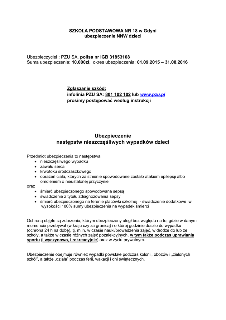 SZKOŁA PODSTAWOWA NR 18 w Gdyni ubezpieczenie NNW dzieci Ubezpieczyciel : PZU SA, polisa nr IGB 31853108 Suma ubezpieczenia: 10.000zł, okres ubezpieczenia: 01.09.2015 – 31.08.2016 Zgłaszanie szkód: infolinia PZU SA: 801 102 102 lub www.pzu.pl prosimy postępować według instrukcji Ubezpieczenie następstw nieszczęśliwych wypadków dzieci Przedmiot ubezpieczenia to następstwa: nieszczęśliwego wypadku zawału serca krwotoku śródczaszkowego obrażeń ciała, których zaistnienie spowodowane zostało atakiem epilepsji albo omdleniem o nieustalonej przyczynie oraz śmierć ubezpieczonego spowodowana sepsą świadczenie z tytułu zdiagnozowania sepsy śmierć ubezpieczonego na terenie placówki szkolnej - świadczenie dodatkowe w wysokości 100% sumy ubezpieczenia na wypadek śmierci Ochroną objęte są zdarzenia, którym ubezpieczony uległ bez względu na to, gdzie w danym momencie przebywał (w kraju czy za granicą) i o której godzinie doszło do wypadku (ochrona 24 h na dobę), tj. m.in. w czasie nauki/prowadzenia zajęć, w drodze do lub ze szkoły, a także w czasie różnych zajęć pozalekcyjnych, w tym także podczas uprawiania sportu (i wyczynowo, i rekreacyjnie) oraz w życiu prywatnym. Ubezpieczenie obejmuje również wypadki powstałe podczas kolonii, obozów i „zielonych szkół”, a także „działa” podczas ferii, wakacji i dni świątecznych. Zakres świadczeń w następstwie: nieszczęśliwego wypadku zawału serca Śmierć ubezpieczonego 100% sumy ubezpieczenia krwotoku śródczaszkowego ataku epilepsji sepsy Trwały uszczerbek na zdrowiu jeżeli w wyniku nieszczęśliwego wypadku, zawału serca, krwotoku śródczaszkowego, ataku epilepsji albo omdlenia o nieustalonej przyczynie ubezpieczony dozna 100% trwałego uszczerbku na zdrowiu, to otrzyma świadczenie w pełnej wysokości sumy ubezpieczenia, tj.: 100% trwałego uszczerbku = 100% sumy ubezpieczenia, a w razie niższego uszczerbku – taki procent sumy ubezpieczenia, w jakim ubezpieczony doznał trwałego uszczerbku, tj.: 1% uszczerbku = 1% sumy ubezpieczenia 10% uszczerbku = 10% sumy ubezpieczenia 50% uszczerbku = 50% sumy ubezpieczenia itd. Do 100% sumy ubezpieczenia Brak trwałego uszczerbku na zdrowiu jeżeli uraz ciała wymagał interwencji lekarskiej w placówce medycznej połączonej z dalszym leczeniem i wymagał co najmniej 1 wizyty kontrolnej. Jednorazowe świadczenie 1% sumy ubezpieczenia Koszty nabycia przedmiotów ortopedycznych i koszty przeszkolenia zawodowego Sepsa koszty nabycia przedmiotów ortopedycznych i środków pomocniczych oraz koszty odbudowy stomatologicznej zębów stałych (do 200 zł za każdy ząb) (teren: kraj i zagranica) Do 25% sumy ubezpieczenia (na każde z tych świadczeń) koszty przeszkolenia zawodowego osób niepełnosprawnych (teren: kraj) jednorazowe świadczenie przysługujące z tytułu zdiagnozowania sepsy w 1.000,00 zł okresie ubezpieczenia Śmierć ubezpieczonego na terenie placówki oświatowej 100% s.u na wypadek świadczenie wypłacane dodatkowo poza świadczeniem za śmierć śmierci ubezpieczonego w następstwie nieszczęśliwego wypadku Zwrot kosztów leczenia poniesionych w związku z nieszczęśliwym wypadkiem lub zdarzeniem objętym ochroną na terytorium kraju i za granicą w ramach kosztów leczenia odpowiedzialność za koszty rehabilitacji poniesione w okresie 6 miesięcy od dnia nieszczęśliwego wypadku lub zdarzenia objętego ochroną do wysokości 20% (do wyboru) sumy ubezpieczenia w przypadku zgonu ubezpieczonego spowodowanego nowotworem złośliwym Jednorazowe świadczenie w przypadku zgonu dziecka, ucznia lub studenta w wieku do 25 lat z powodu wrodzonej wady serca w przypadku amputacji kończyny lub części kończyny spowodowanej nowotworem złośliwym u dziecka, ucznia lub studenta do 25 roku życia w wysokości 1 000 zł (na każde świadczenie) Śmierć przedstawiciela ustawowego lub osoby która ma na utrzymaniu ucznia lub studenta Dieta szpitalna śmierć w następstwie nieszczęśliwego wypadku w wysokości 1 000 zł pobyt w szpitalu w związku z nieszczęśliwym wypadkiem lub zdarzeniem objętym ochroną, płatna od drugiego dnia pobytu maksymalnie przez okres 90 dni z tytułu jednego nieszczęśliwego wypadku lub zdarzenia objętego ochroną w wysokości 0,2% sumy ubezpieczenia za dzień pobytu w szpitalu Świadczenie typu assistance (na terytorium RP) w ramach składki podstawowej wizyta lekarza w miejscu pobytu ubezpieczonego Pomoc medyczna wizyta ubezpieczonego u lekarza w placówce medycznej Łączna kwota 2 000 zł na każdy nieszczęśliwy wypadek transport medyczny wizyta pielęgniarki w miejscu pobytu ubezpieczonego transport medyczny Pomoc rehabilitacyjna i pielęgnacyjna organizacja procesu rehabilitacji Do 500 zł na każdy wypadek dostawa drobnego sprzętu rehabilitacyjnego lub medycznego Do 300 zł na każdy wypadek dostarczenie do miejsca pobytu leków przepisanych przez lekarza domowa opieka pielęgniarska po hospitalizacji powyżej 2 dni Do 1 000 zł na każdy wypadek Pomoc psychologa pomoc psychologa Do 1 500 zł na każdy wypadek dla każdej osoby uprawnionej do skorzystania z tej pomocy Lekcje prywatne dla uczniów szkół podst., gimnazjum oraz szkół ponadgimnazjalnych (z wyłączeniem uczniów szkół policealnych) – jeżeli na skutek zaistnienia nieszczęśliwego wypadku uczeń nie może uczęszczać do szkoły dłużej niż 10 dni od dnia wypadku PZU SA organizuje i pokrywa koszty indywidualnych korepetycji z wybranych przedmiotów (maksymalnie 2) wchodzących w zakres programu nauczania szkoły Do 400 zł na każdy nieszczęśliwy wypadek Podstawa: ogólne warunki ubezpieczenia następstw nieszczęśliwych wypadków dzieci, młodzieży i personelu w szkołach i innych zakładach ustalone uchwałą UZ/102/2013 z dnia 29 marca 2013 r.