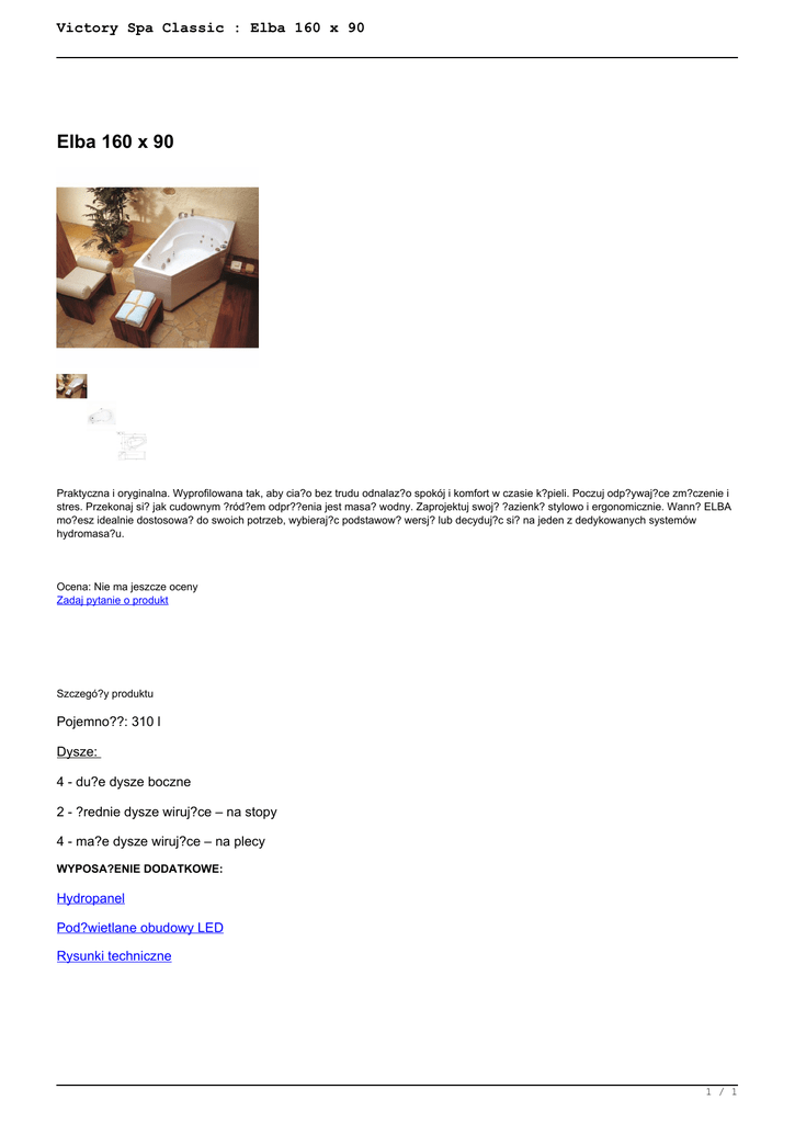 Victory Spa Classic : Elba 160 x 90 Elba 160 x 90 Praktyczna i oryginalna. Wyprofilowana tak, aby cia?o bez trudu odnalaz?o spokój i komfort w czasie k?pieli. Poczuj odp?ywaj?ce zm?czenie i stres. Przekonaj si? jak cudownym ?ród?em odpr??enia jest masa? wodny. Zaprojektuj swoj? ?azienk? stylowo i ergonomicznie. Wann? ELBA mo?esz idealnie dostosowa? do swoich potrzeb, wybieraj?c podstawow? wersj? lub decyduj?c si? na jeden z dedykowanych systemów hydromasa?u. Ocena: Nie ma jeszcze oceny Zadaj pytanie o produkt Szczegó?y produktu Pojemno??: 310 l Dysze: 4 - du?e dysze boczne 2 - ?rednie dysze wiruj?ce – na stopy 4 - ma?e dysze wiruj?ce – na plecy WYPOSA?ENIE DODATKOWE: Hydropanel Pod?wietlane obudowy LED Rysunki techniczne 1 / 1 Powered by TCPDF (www.tcpdf.org)