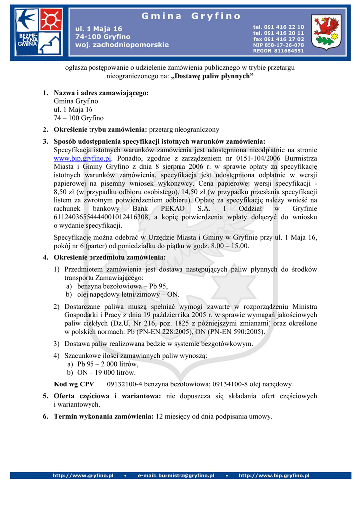 ogłasza postępowanie o udzielenie zamówienia publicznego w trybie przetargu nieograniczonego na: „Dostawę paliw płynnych” 1. Nazwa i adres zamawiającego: Gmina Gryfino ul. 1 Maja 16 74 – 100 Gryfino 2. Określenie trybu zamówienia: przetarg nieograniczony 3. Sposób udostępnienia specyfikacji istotnych warunków zamówienia: Specyfikacja istotnych warunków zamówienia jest udostępniona nieodpłatnie na stronie www.bip.gryfino.pl. Ponadto, zgodnie z zarządzeniem nr 0151-104/2006 Burmistrza Miasta i Gminy Gryfino z dnia 8 sierpnia 2006 r. w sprawie opłaty za specyfikację istotnych warunków zamówienia, specyfikacja jest udostępniona odpłatnie w wersji papierowej na pisemny wniosek wykonawcy. Cena papierowej wersji specyfikacji 8,50 zł (w przypadku odbioru osobistego), 14,50 zł (w przypadku przesłania specyfikacji listem za zwrotnym potwierdzeniem odbioru). Opłatę za specyfikację należy wnieść na rachunek bankowy Bank PEKAO S.A. I Oddział w Gryfinie 61124036554444001012416308, a kopię potwierdzenia wpłaty dołączyć do wniosku o wydanie specyfikacji. Specyfikację można odebrać w Urzędzie Miasta i Gminy w Gryfinie przy ul. 1 Maja 16, pokój nr 6 (parter) od poniedziałku do piątku w godz. 8.00 – 15.00. 4. Określenie przedmiotu zamówienia: 1) Przedmiotem zamówienia jest dostawa następujących paliw płynnych do środków transportu Zamawiającego: a) benzyna bezołowiowa – Pb 95, b) olej napędowy letni/zimowy – ON. 2) Dostarczane paliwa muszą spełniać wymogi zawarte w rozporządzeniu Ministra Gospodarki i Pracy z dnia 19 października 2005 r. w sprawie wymagań jakościowych paliw ciekłych (Dz.U. Nr 216, poz. 1825 z późniejszymi zmianami) oraz określone w polskich normach: Pb (PN-EN 228:2005), ON (PN-EN 590:2005). 3) Dostawa paliw realizowana będzie w systemie bezgotówkowym. 4) Szacunkowe ilości zamawianych paliw wynoszą: a) Pb 95 – 2 000 litrów, b) ON – 19 000 litrów. Kod wg CPV 09132100-4 benzyna bezołowiowa; 09134100-8 olej napędowy 5. Oferta częściowa i wariantowa: nie dopuszcza się składania ofert częściowych i wariantowych. 6. Termin wykonania zamówienia: 12 miesięcy od dnia podpisania umowy. 7. Opis warunków udziału w postępowaniu oraz opis dokonywania oceny spełnienia tych warunków: W postępowaniu o udzielenie zamówienia publicznego mogą uczestniczyć wykonawcy, którzy: 1) nie podlegają wykluczeniu na podstawie art. 24 ustawy, 2) spełniają wymagania określone w art. 22 ust. 1 ustawy, 3) posiadają stację paliw w odległości nie większej niż 5 km od siedziby Zamawiającego. Zamawiający oceni spełnienie powyższych wymagań poprzez szczegółową analizę dokumentów złożonych przez wykonawców. Każdy z wykonawców składających ofertę wspólną musi spełniać powyższe warunki. Każdy wykonawca przystępujący do postępowania o udzielenie zamówienia publicznego zobowiązany jest do złożenia: 1) oświadczenia zgodnie z art. 22 ust. 1 ustawy, 2) oświadczenia, że posiada co najmniej jedną ze stacji w odległości nie większej niż 5 km od siedziby Zamawiającego. Od wykonawcy przystępującego do postępowania o udzielenie zamówienia publicznego wymagane jest, w celu potwierdzenia spełnienia warunków, o których mowa w art. 22 ust. 1 ustawy, przedstawienie wymienionych niżej dokumentów: 1) aktualną koncesję na prowadzenie działalności gospodarczej w zakresie obrotu paliwami wydaną zgodnie z przepisami ustawy z dnia 10 kwietnia 1997 r. – Prawo energetyczne (Dz.U. z 2006 r. Nr 89, poz. 625 z późniejszymi zmianami), 2) aktualnego odpisu z właściwego rejestru albo aktualne zaświadczenie o wpisie do ewidencji działalności gospodarczej, wystawione nie wcześniej niż 6 miesięcy przed upływem terminu składania ofert, 3) aktualnych zaświadczeń właściwego naczelnika urzędu skarbowego oraz właściwego oddziału Zakładu Ubezpieczeń Społecznych potwierdzających odpowiednio, że wykonawca nie zalega z opłacaniem podatków, opłat oraz składek na ubezpieczenia zdrowotne, społeczne, lub zaświadczeń, że uzyskał przewidziane prawem zwolnienie, odroczenie lub rozłożenie na raty zaległych płatności lub wstrzymanie w całości wykonania decyzji właściwego organu – wystawionych nie wcześniej niż 3 miesiące przed upływem terminu składania ofert. Jeżeli wykonawca ma siedzibę lub miejsce zamieszkania poza terytorium Rzeczpospolitej Polskiej zamiast dokumentów, o których mowa w pkt: 2), 3) – składa dokument lub dokumenty, wystawione w kraju, w którym ma siedzibę lub miejsce zamieszkania potwierdzające odpowiednio, że: a) nie otwarto jego likwidacji ani nie ogłoszono upadłości – dokument powinien być wystawiony nie wcześniej niż 6 miesięcy przed upływem terminu składania ofert, b) nie zalega z uiszczeniem podatków, opłat, składek na ubezpieczenie społeczne i zdrowotne albo, że uzyskał przewidziane prawem zwolnienie, odroczenie lub rozłożenie na raty zaległych płatności lub wstrzymanie w całości wykonania decyzji właściwego organu – dokument powinien być wystawiony nie wcześniej niż 3 miesiące przed upływem terminu składania ofert, c) nie orzeczono wobec niego zakazu ubiegania się o zamówienie – dokument powinien być wystawiony nie wcześniej niż 6 miesięcy przed upływem terminu składania ofert. Jeżeli w kraju pochodzenia osoby lub w kraju, w którym wykonawca ma siedzibę lub miejsce zamieszkania nie wydaje się ww. dokumentów, zastępuje się je dokumentem zawierającym oświadczenie złożone przed notariuszem, właściwym organem sądowym, administracyjnym albo organem samorządu zawodowego lub gospodarczego odpowiednio 2 kraju pochodzenia osoby lub kraju, w którym wykonawca ma siedzibę lub miejsce zamieszkania. 8. Informacja na temat wadium: zamawiający nie przewiduje wadium. 9. Kryteria oceny ofert i ich znaczenie: Kryteria, którymi Zamawiający będzie się kierował przy wyborze oferty i