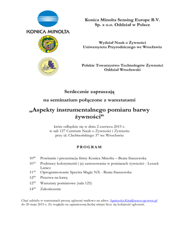 Konica Minolta Sensing Europe B.V. Sp. z o.o. Oddział w Polsce Wydział Nauk o Żywności Uniwersytetu Przyrodniczego we Wrocławiu Polskie Towarzystwo Technologów Żywności Oddział Wrocławski Serdecznie zapraszają na seminarium połączone z warsztatami „Aspekty instrumentalnego pomiaru barwy żywności” które odbędzie się w dniu 2 czerwca 2015 r. w sali 127 Centrum Nauk o Żywności i Żywieniu przy ul. Chełmońskiego 37 we Wrocławiu PROGRAM 1000 1015 1145 1200 1220 Powitanie i prezentacja firmy Konica Minolta – Beata Staszewska Podstawy kolorymetrii i jej zastosowania w pomiarach żywności - Leszek Latacz Oprogramowanie Spectra Magic NX - Beata Staszewska Przerwa na kawę Warsztaty pomiarowe (sala 125) 1400 Zakończenie Chęć udziału w warsztatach proszę zgłaszać mailowo na adres: [email protected] do 20 maja 2015 r. Ze względu na ograniczoną liczbę miejsc liczy się kolejność zgłoszeń.