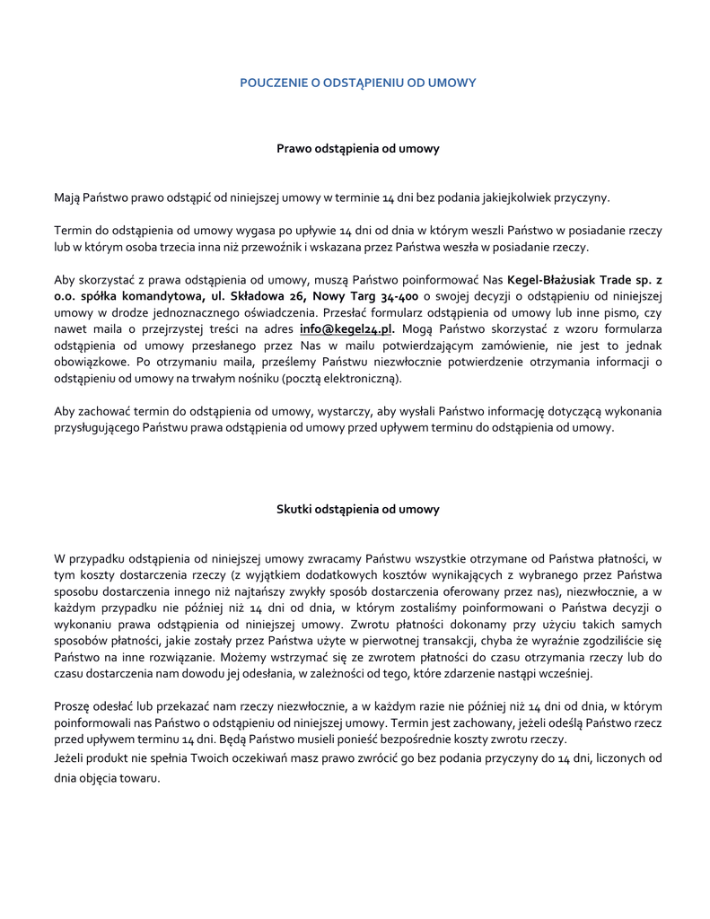 POUCZENIE O ODSTĄPIENIU OD UMOWY Prawo odstąpienia od umowy Mają Państwo prawo odstąpić od niniejszej umowy w terminie 14 dni bez podania jakiejkolwiek przyczyny. Termin do odstąpienia od umowy wygasa po upływie 14 dni od dnia w którym weszli Państwo w posiadanie rzeczy lub w którym osoba trzecia inna niż przewoźnik i wskazana przez Państwa weszła w posiadanie rzeczy. Aby skorzystać z prawa odstąpienia od umowy, muszą Państwo poinformować Nas Kegel-Błażusiak Trade sp. z o.o. spółka komandytowa, ul. Składowa 26, Nowy Targ 34-400 o swojej decyzji o odstąpieniu od niniejszej umowy w drodze jednoznacznego oświadczenia. Przesłać formularz odstąpienia od umowy lub inne pismo, czy nawet maila o przejrzystej treści na adres [email protected]. Mogą Państwo skorzystać z wzoru formularza odstąpienia od umowy przesłanego przez Nas w mailu potwierdzającym zamówienie, nie jest to jednak obowiązkowe. Po otrzymaniu maila, prześlemy Państwu niezwłocznie potwierdzenie otrzymania informacji o odstąpieniu od umowy na trwałym nośniku (pocztą elektroniczną). Aby zachować termin do odstąpienia od umowy, wystarczy, aby wysłali Państwo informację dotyczącą wykonania przysługującego Państwu prawa odstąpienia od umowy przed upływem terminu do odstąpienia od umowy. Skutki odstąpienia od umowy W przypadku odstąpienia od niniejszej umowy zwracamy Państwu wszystkie otrzymane od Państwa płatności, w tym koszty dostarczenia rzeczy (z wyjątkiem dodatkowych kosztów wynikających z wybranego przez Państwa sposobu dostarczenia innego niż najtańszy zwykły sposób dostarczenia oferowany przez nas), niezwłocznie, a w każdym przypadku nie później niż 14 dni od dnia, w którym zostaliśmy poinformowani o Państwa decyzji o wykonaniu prawa odstąpienia od niniejszej umowy. Zwrotu płatności dokonamy przy użyciu takich samych sposobów płatności, jakie zostały przez Państwa użyte w pierwotnej transakcji, chyba że wyraźnie zgodziliście się Państwo na inne rozwiązanie. Możemy wstrzymać się ze zwrotem płatności do czasu otrzymania rzeczy lub do czasu dostarczenia nam dowodu jej odesłania, w zależności od tego, które zdarzenie nastąpi wcześniej. Proszę odesłać lub przekazać nam rzeczy niezwłocznie, a w każdym razie nie później niż 14 dni od dnia, w którym poinformowali nas Państwo o odstąpieniu od niniejszej umowy. Termin jest zachowany, jeżeli odeślą Państwo rzecz przed upływem terminu 14 dni. Będą Państwo musieli ponieść bezpośrednie koszty zwrotu rzeczy. Jeżeli produkt nie spełnia Twoich oczekiwań masz prawo zwrócić go bez podania przyczyny do 14 dni, liczonych od dnia objęcia towaru. W PRZYPADKU CHĘCI DOKONANIA ZWROTU, POSTĘPUJ WEDŁUG NASTĘPUJĄCYCH WSKAZÓWEK W przypadku sprzedaży wysyłkowej *Wypełnij formularz odstąpienia od umowy, który znajdziesz na stronie Kegel24 w zakładce Zwroty lub w mailu potwierdzającym zamówienie (strona 1) i wyślij go do Nas pocztą elektroniczną na adres [email protected]. ( Nie jest konieczne wysyłanie formularza, możesz poinformować nas o chęci dokonania zwrotu, wysyłając maila z taką informacją na podany adres e-mail) *Czekaj na mail zwrotny - po otrzymaniu informacji o chęci dokonania zwrotu, prześlemy w odpowiedzi potwierdzenie otrzymania wiadomości i przyzwolenie do dalszych działań. *Spakuj produkt/-y do zwrotu – możesz wykorzystać opakowanie, w którym otrzymałeś zamówienie. Do paczki dołącz wypełniony oświadczenie odstąpienia od umowy oraz dokument sprzedaży. *Odeślij produkt/-y na poniższy adres: (Produkty z kategorii "Pokrowce samochodowe") Kegel-Błażusiak Ul. Grota Roweckiego 10 30-348 Kraków (Produkty z kategorii "Odzież i obuwie do pracy") Kegel-Błażusiak Sp z. o. o Ul. Składowa 26 34-400 Nowy Targ Z dopiskiem : zwrot / www.kegel24.pl / zamówienie: .... W ciągu kilku dni po otrzymaniu przez nas paczki/ produktów (wraz z dokumentem sprzedaży oraz wypełnionym formularzem) otrzymasz zwrot należności za produkt/-y w sposób, w jaki za nie zapłacono lub inny wybrany przez ciebie. W przypadku zamówień obsługiwanych przez konkretne sklepy fabryczne (Odbiór osobisty w sklepie fabrycznym Kegel-Błażusiak) Zwrócić towar można tylko i wyłącznie w tym samym punkcie w którym dokonano zakupu/ odebrano towar. Możliwe jest zarówno osobiste dostarczenie towaru do sklepu jak i wysyłka na adres dokładnie tego sklepu, który obsługiwał Twoje zamówienie. Zanim dokonają Państwo zwrotu prosimy poinformować nas o chęci zwrotu drogą mailową/ telefoniczną. Zwracany towar musi być w stanie niezmienionym- musi posiadać oryginalne opakowanie oraz nie może nosić żadnych znamion użytkowania. Towar powinien być zwrócony nie później niż w terminie 14 dni od dnia przesłania odstąpienia od umowy. Zwrócimy niezwłocznie, nie później niż w terminie 14 dni od dnia otrzymania oświadczenia, wszystkie dokonane przez Ciebie płatności.