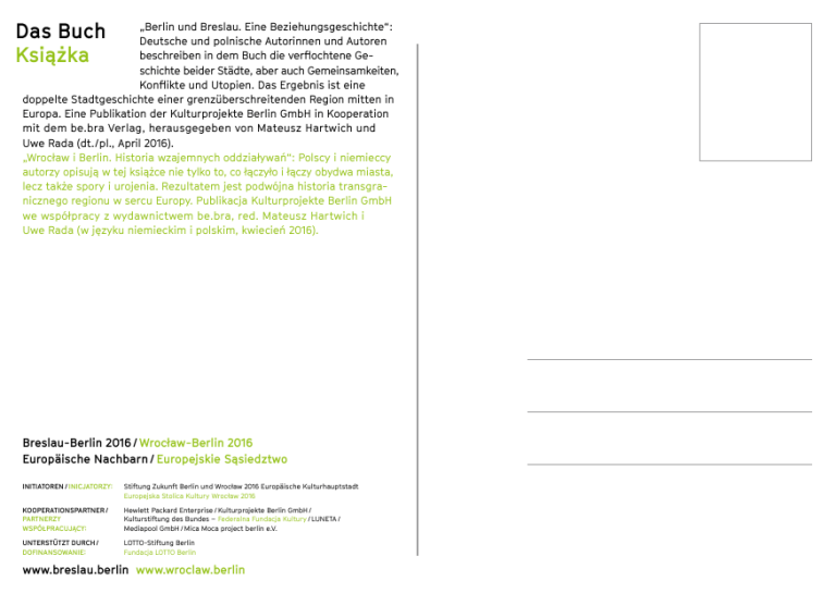 Das Buch Książka „Berlin und Breslau. Eine Beziehungsgeschichte“: Deutsche und polnische Autorinnen und Autoren beschreiben in dem Buch die verflochtene Geschichte beider Städte, aber auch Gemeinsamkeiten, Konflikte und Utopien. Das Ergebnis ist eine doppelte Stadtgeschichte einer grenzüberschreitenden Region mitten in Europa. Eine Publikation der Kulturprojekte Berlin GmbH in Kooperation mit dem be.bra Verlag, herausgegeben von Mateusz Hartwich und Uwe Rada (dt./pl., April 2016). „Wrocław i Berlin. Historia wzajemnych oddziaływań“: Polscy i niemieccy autorzy opisują w tej książce nie tylko to, co łączyło i łączy obydwa miasta, lecz także spory i urojenia. Rezultatem jest podwójna historia transgranicznego regionu w sercu Europy. Publikacja Kulturprojekte Berlin GmbH we współpracy z wydawnictwem be.bra, red. Mateusz Hartwich i Uwe Rada (w języku niemieckim i polskim, kwiecień 2016). Breslau-Berlin 2016 / Wrocław-Berlin 2016 Europäische Nachbarn / Europejskie Sąsiedztwo INITIATOREN / INICJATORZY: Stiftung Zukunft Berlin und Wrocław 2016 Europäische Kulturhauptstadt Europejska Stolica Kultury Wrocław 2016 KOOPERATIONSPARTNER / PARTNERZY WSPÓŁPRACUJĄCY: Hewlett Packard Enterprise / Kulturprojekte Berlin GmbH / Kulturstiftung des Bundes – Federalna Fundacja Kultury / LUNETA / Mediapool GmbH / Mica Moca project berlin e.V. UNTERSTÜTZT DURCH / DOFINANSOWANIE: LOTTO-Stiftung Berlin Fundacja LOTTO Berlin www.breslau.berlin www.wroclaw.berlin