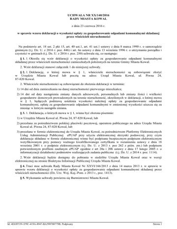 UCHWAŁA NR XX/140/2016 RADY MIASTA KOWAL z dnia 23 czerwca 2016 r. w sprawie wzoru deklaracji o wysokości opłaty za gospodarowanie odpadami komunalnymi składanej przez właścicieli nieruchomości Na podstawie art. 18 ust. 2 pkt 15, art. 40 ust.1, art. 41 ust.1 ustawy z dnia 8 marca 1990 r. o samorządzie gminnym (t.j. Dz. U. z 2016 r. poz. 446) i art. 6n ustawy z dnia 13 września 1996 r. o utrzymaniu porządku i czystości w gminach (t.j. Dz. U. z 2016 r. poz. 250) uchwala się, co następuje: § 1. 1. Określa się wzór deklaracji o wysokości opłaty za gospodarowanie odpadami komunalnymi składanej przez właścicieli nieruchomości zamieszkałych położonych na terenie Gminy Miasta Kowal. 2. Wzór deklaracji stanowi załącznik 1 do niniejszej uchwały. § 2. 1. Deklarację, o której mowa w § 1, właściciele nieruchomości są zobowiązani złożyć w Urzędzie Miasta Kowal lub pocztą na adres: Urząd Miasta Kowal, ul. Piwna 24, 87-820 Kowal. 2. Właściciele nieruchomości są zobowiązani do złożenia deklaracji w terminie: 1) 14 dni od dnia zamieszkania na danej nieruchomości pierwszego mieszkańca; 2) 14 dni od daty nastąpienia zmiany danych adresowych, personalnych lub zmiany ilości i wielkości gospodarstw domowych prowadzonych na terenie nieruchomość, określonych w deklaracji, o której mowa w § 1, będących podstawą ustalenia wysokości należnej opłaty za gospodarowanie odpadami komunalnymi, opłatę za gospodarowanie odpadami komunalnymi w zmienionej wysokości uiszcza się za miesiąc w którym nastąpiła zmiana. § 3. 1. Deklaracja, o których mowa w § 1, winna być złożona pisemnie: 1) w Urzędzie Miasta Kowal ul. Piwna 24, 87-820 Kowal, lub 2) przesłana za pośrednictwem polskiej placówki pocztowej, operatora publicznego na adres Urzędu Miasta Kowal ul. Piwna 24, 87-820 Kowal, lub 3) przesłana w formie elektronicznej do Urzędu Miasta Kowal, za pośrednictwem Platformy Elektronicznych Usług Administracji Publicznej ePUAP przy użyciu elektronicznej skrzynki podawczej, przy czym deklaracje składane w formie elektronicznej winne być podpisane bezpiecznym podpisem elektronicznym weryfikowanym przy pomocy ważnego kwalifikowanego certyfikatu w rozumieniu ustawy z dnia 18 września 2001 r. o podpisie elektronicznym (t.j. Dz. U. z 2013 r. poz 262 z późn. zm.) lub podpisem potwierdzonym profilem zaufanym ePUAP zgodnie z art 20a i 20b ustawy z dnia 17 lutego 2005 r. o informatyzacji działalności podmiotów realizujących zadania publiczne (t.j. Dz. U. z 2014 r. poz. 1114). 2. Wzór deklaracji będzie dostępny do pobrania w siedzibie Urzędu Miasta Kowal oraz w wersji elektronicznej na stronie Biuletynu Informacji Publicznej Urzędu Miasta Kowal. § 4. Traci moc uchwała Rady Miasta Kowal Nr XXVI/166/2013 z dnia 14 marca 2013 r. w sprawie w sprawie wzoru deklaracji o wysokości opłaty za gospodarowanie odpadami komunalnymi składanej przez właścicieli nieruchomości (Dz. Urz. Woj. Kuj.-Pom. z 2013 r., poz. 1413). § 5. Wykonanie uchwały powierza się Burmistrzowi Miasta Kowal. Id: 4E65F539-1F9C-419A-8947-BA590700779B. Podpisany Strona 1 § 6. Uchwała wchodzi w życie po upływie 14 dni od daty jej ogłoszenia w Dzienniku Urzędowym Województwa Kujawsko-Pomorskiego. Przewodniczący Rady Krzysztof Pasiecki Id: 4E65F539-1F9C-419A-8947-BA590700779B. Podpisany Strona 2 Pola jasne niniejszej deklaracji wypełnia właściciel lub jeden z współwłaścicieli nieruchomości, należy wypełniać komputerowo lub ręcznie, drukowanymi literami, czarnym lub niebieskim kolorem. Załącznik do UCHWAŁY Nr XX/140/2016 RADY MIASTA KOWAL z dnia 23 czerwca 2016 r. 1. Numer ewidencyjny DEKLARACJA O WYSOKOŚCI OPŁATY ZA GOSPODAROWANIE ODPADAMI KOMUNALNYMI DLA NIERUCHOMOŚCI NA KTÓREJ ZAMIESZKUJĄ MIESZKAŃCY Podstawa prawna: Formularz przeznaczony dla właścicieli, współwłaścicieli, użytkowników wieczystych, jednostek organizacyjnych, osób posiadających nieruchomości w zarządzie lub użytkowaniu a także innych podmiotów władających nieruchomościami zamieszkałymi położonymi na terenie Gminy Miasta Kowal. W przypadku współwłasności deklarację wypełnia tylko jeden z właścicieli. Składający: Termin składania: Miejsce składania: A. Ustawa z dnia 13 września 1996 r. o utrzymaniu czystości i porządku w gminach (t.j. Dz. U. z 2016 r. poz. 250) Termin składania w ciągu 14 dni od dnia zamieszkania lub 14 dni od dnia, w którym nastąpiły zmiany danych (np. liczby gospodarstw, liczby mieszkańców zamieszkałych na terenie nieruchomości) określonych w deklaracji. Urząd Miasta Kowal ul. Piwna 24 87 – 820 Kowal OBOWIĄZEK ZŁOŻENIA DEKLARACJI (proszę zaznaczyć odpowiedni kwadrat znakiem X) Pierwsza deklaracja Korekta wcześniej złożonej deklaracji Nowa deklaracja po zmianie danych - data wystąpienia zmian danych ................................................. B. DANE SKŁADAJĄCEGO DEKLARACJĘ osoba fizyczna osoba prawna jednostka organizacyjna nie posiadająca osobowości prawnej RODZAJ PODMIOTU (proszę zaznaczyć „x” właściwą formę) właściciel nieruchomości w zabudowie jednorodzinnej właściciel nieruchomości w zabudowie wielorodzinnej 1 2 IMIĘ I NAZWISKO (w przypadku osób fizycznych) / NAZWA (w przypadku pozostałych osób nie będących osobami fizycznymi) PESEL (w przypadku osób fizycznych) NIP/REGON (w przypadku pozostałych osób nie będących osobami fizycznymi) C. ADRES ZAMIESZKANIA Kraj: Województwo: Powiat: Gmina: Ulica: Nr domu: Miejscowość: Kod pocztowy/poczta: Numer telefonu: D. ADRES NIERUCHOMOŚCI, NA KTÓREJ POWSTAJĄ ODPADY KOMUNALNE Kraj: POLSKA Województwo: KUJAWSKO - POMORSKIE Powiat: WŁOCŁAWSKI Gmina: MIASTO KOWAL Ulica: Nr domu: Miejscowość: KOWAL Kod pocztowy/poczta: 87-820 Numer telefonu: E. F. Nr lokalu: Nr lokalu: FORMA WŁADANIA NIERUCHOMOŚCIĄ (proszę zaznaczyć odpowiedni kwadrat znakiem X) Własność Współwłasność Użytkowanie wieczyste Inna , jaka?...