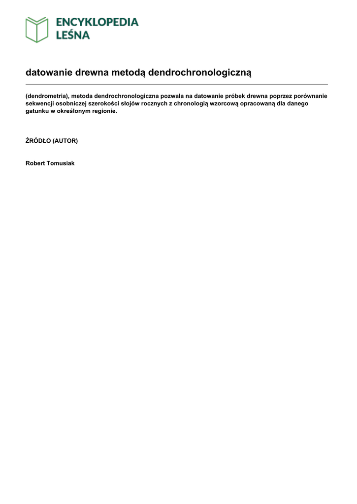 datowanie drewna metodą dendrochronologiczną (dendrometria), metoda dendrochronologiczna pozwala na datowanie próbek drewna poprzez porównanie sekwencji osobniczej szerokości słojów rocznych z chronologią wzorcową opracowaną dla danego gatunku w określonym regionie. ŹRÓDŁO (AUTOR) Robert Tomusiak