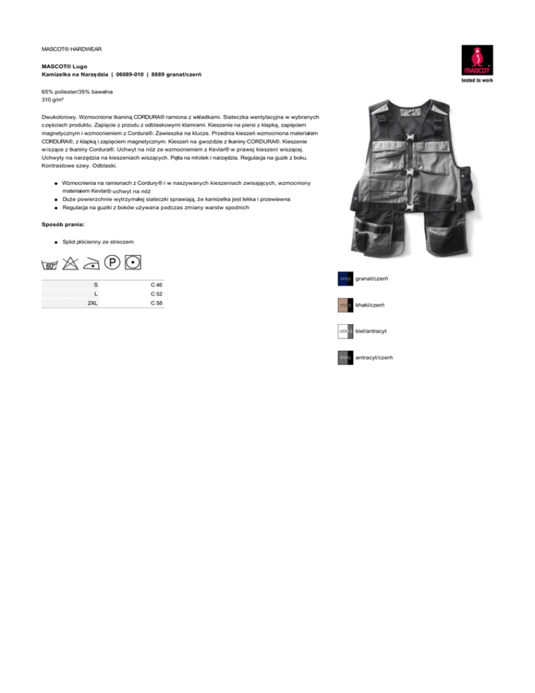 MASCOT® HARDWEAR MASCOT® Lugo Kamizelka na Narzędzia | 06089-010 | 8889 granat/czerń 65% poliester/35% bawełna 310 g/m² Dwukolorowy. Wzmocnione tkaniną CORDURA® ramiona z wkładkami. Siateczka wentylacyjna w wybranych częściach produktu. Zapięcie z przodu z odblaskowymi klamrami. Kieszenie na piersi z klapką, zapięciem magnetycznym i wzmocnieniem z Cordura®. Zawieszka na klucze. Przednia kieszeń wzmocniona materiałem CORDURA®, z klapką i zapięciem magnetycznym. Kieszeń na gwoździe z tkaniny CORDURA®. Kieszenie wiszące z tkaniny Cordura®. Uchwyt na nóż ze wzmocnieniem z Kevlar® w prawej kieszeni wiszącej. Uchwyty na narzędzia na kieszeniach wiszących. Pętla na młotek i narzędzia. Regulacja na guzik z boku. Kontrastowe szwy. Odblaski. l Wzmocnienia na ramionach z Cordury® i w naszywanych kieszeniach zwisających, wzmocniony materiałem Kevlar® uchwyt na nóż l Duże powierzchnie wytrzymałej siateczki sprawiają, że kamizelka jest lekka i przewiewna l Regulacja na guziki z boków używana podczas zmiany warstw spodnich Sposób prania: l Splot płócienny ze streczem granat/czerń S C 46 L C 52 2XL C 58 khaki/czerń biel/antracyt antracyt/czerń