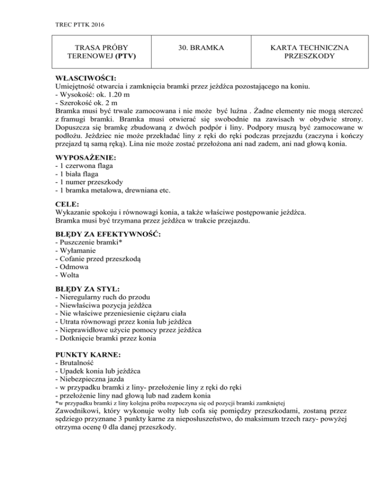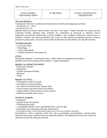 TREC PTTK 2016 TRASA PRÓBY TERENOWEJ (PTV) 30. BRAMKA KARTA TECHNICZNA PRZESZKODY WŁASCIWOŚCI: Umiejętność otwarcia i zamknięcia bramki przez jeźdźca pozostającego na koniu. - Wysokość: ok. 1.20 m - Szerokość ok. 2 m Bramka musi być trwale zamocowana i nie może być luźna . Żadne elementy nie mogą sterczeć z framugi bramki. Bramka musi otwierać się swobodnie na zawisach w obydwie strony. Dopuszcza się bramkę zbudowaną z dwóch podpór i liny. Podpory muszą być zamocowane w podłożu. Jeździec nie może przekładać liny z ręki do ręki podczas przejazdu (zaczyna i kończy przejazd tą samą ręką). Lina nie może zostać przełożona ani nad zadem, ani nad głową konia. WYPOSAŻENIE: - 1 czerwona flaga - 1 biała flaga - 1 numer przeszkody - 1 bramka metalowa, drewniana etc. CELE: Wykazanie spokoju i równowagi konia, a także właściwe postępowanie jeźdźca. Bramka musi być trzymana przez jeźdźca w trakcie przejazdu. BŁĘDY ZA EFEKTYWNOŚĆ: - Puszczenie bramki* - Wyłamanie - Cofanie przed przeszkodą - Odmowa - Wolta BŁĘDY ZA STYL: - Nieregularny ruch do przodu - Niewłaściwa pozycja jeźdźca - Nie właściwe przeniesienie ciężaru ciała - Utrata równowagi przez konia lub jeźdźca - Nieprawidłowe użycie pomocy przez jeźdźca - Dotknięcie bramki przez konia PUNKTY KARNE: - Brutalność - Upadek konia lub jeźdźca - Niebezpieczna jazda - w przypadku bramki z liny- przełożenie liny z ręki do ręki - przełożenie liny nad głową lub nad zadem konia *w przypadku bramki z liny kolejna próba rozpoczyna się od pozycji bramki zamkniętej Zawodnikowi, który wykonuje wolty lub cofa się pomiędzy przeszkodami, zostaną przez sędziego przyznane 3 punkty karne za nieposłuszeństwo, do maksimum trzech razy- powyżej otrzyma ocenę 0 dla danej przeszkody. TREC PTTK 2016 KARTA OCENY BRAMKA NR PRZESZKODY……………. SĘDZIA……………………… …. NR STAR T. E S P RAZEM + - = Uwagi: SCHEMAT OCENIANIA : E+S-P EFEKTYWNOŚĆ E STYL S PKT.KARNE P Poprawna 7 bardzo dobry +3 Brutalność -3 1 puszczenie bramki 4 dobry +2 Niebezpieczna jazda -3 2 puszczenie bramki 1 prawie dobry +1 3 puszczenie bramki 0 przeciętny 0 słaby -1 zły -2 Upadek i/lub Przełożenie liny z ręki do ręki (bramka z liną) 0 Przełożenie liny nad głową lub nad zadem konia 0 Punktacja 0 za efektywność lub za punkty karne oznacza całkowitą ocenę 0 za daną przeszkodę 7 = 0 błędów za efektywność: brak puszczenia bramki, brak wyłamania, brak cofania, brak odmowy, brak wolty 4 = 1 błąd: 1- puszczenie bramki, etc. 1 = 2 błąd: 2- puszczenie bramki, etc. 0 = 3 błąd: etc. Te oceny należy wpisać w kratkę E w karcie oceny
