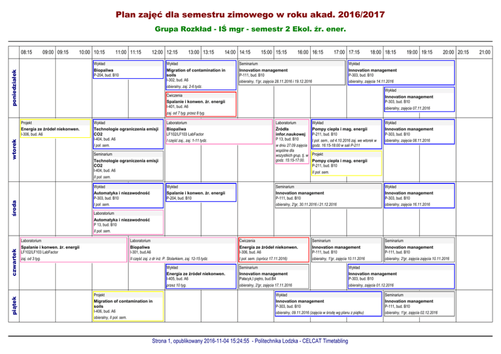 Plan zajęć dla semestru zimowego w roku akad. 2016/2017 Grupa Rozkład - IŚ mgr - semestr 2 Ekol. źr. ener. 09:00 09:15 10:00 10:15 poniedziałek 08:15 11:00 11:15 12:00 12:15 13:00 13:15 14:00 14:15 15:00 15:15 16:00 16:15 17:00 17:15 18:00 18:15 Wykład Wykład Seminarium Wykład Biopaliwa P-204, bud. B10 Migration of contamination in soils I-302, bud. A6 Innovation management P-111, bud. B10 Innovation management P-303, bud. B10 obieralny, 1'gr, zajęcia 28.11.2016 i 19.12.2016 obieralny, zajęcia 14.11.2016 obieralny, zaj. 2-6 tydz. 19:00 19:15 20:00 20:15 Wykład Ćwiczenia Innovation management P-303, bud. B10 Spalanie i konwen. źr. energii I-401, bud. A6 obieralny, zajęcia 07.11.2016 zaj. od 7 tyg. przez 8 tyg. Wykład Laboratorium Laboratorium Wykład Wykład Energia ze źródeł niekonwen. I-306, bud. A6 Technologie ograniczenia emisji CO2 I-404, bud. A6 Biopaliwa LF102/LF103 LabFactor Źródła infor.naukowej P 13, bud. B10 Pompy ciepła i mag. energii P-211, bud. B10 Innovation management P-303, bud. B10 wtorek Projekt I część zaj., zaj. 1-11 tydz. I poł. sem., od 4.10.2016 zaj. we wtorek w w dniu 27.09 zajęcia godz. 16:15-18:00 w sali P-211 wspólne dla wszystkich grup, tj. w Projekt godz. 15:15-17:00. Pompy ciepła i mag. energii P-211, bud. B10 I poł. sem. Seminarium Technologie ograniczenia emisji CO2 I-404, bud. A6 obieralny, zajęcia 08.11.2016 II poł. sem. środa II poł. sem. Wykład Wykład Seminarium Wykład Automatyka i niezawodność P-303, bud. B10 Spalanie i konwen. źr. energii P-204, bud. B10 Innovation management P-111, bud. B10 Innovation management P-303, bud. B10 obieralny, 2'gr, 30.11.2016 i 21.12.2016 obieralny, zajęcia 16.11.2016 I poł. sem. Laboratorium Automatyka i niezawodność P 13, bud. B10 piątek czwartek II poł. sem. Laboratorium Laboratorium Ćwiczenia Seminarium Seminarium Spalanie i konwen. źr. energii LF102/LF103 LabFactor Biopaliwa I-301, bud.A6 Energia ze źródeł niekonwen. I-306, bud. A6 Innovation management P-111, bud. B10 Innovation management P-111, bud. B10 zaj. od 3 tyg. II część zaj. z dr inż. P. Stolarkiem, zaj. 12-15 tydz. I poł. sem. (oprócz 17.11.2016) obieralny, 1'gr, zajęcia 10.11.2016 obieralny, 2'gr, zajęcia zajęcia 10.11.2016 Wykład Seminarium Wykład Energia ze źródeł niekonwen. I-405, bud. A6 Innovation management Pałacyk,I piętro, bud.B4 Innovation management P-303, bud. B10 przez 10 tyg. obieralny, 2'gr, zajęcia 17.11.2016 obieralny, zajęcia 01.12.2016 Projekt Wykład Seminarium Migration of contamination in soils I-406, bud. A6 Innovation management P-303, bud. B10 Innovation management P-111, bud. B10 obieralny, 09.11.2016 (zajęcia w środę wg planu z piątku) obieralny, 1'gr, zajęcia 02.12.2016 obieralny, II poł. sem. Strona 1, opublikowany 2016-11-04 15:24:55 - Politechnika Lodzka - CELCAT Timetabling 21:00