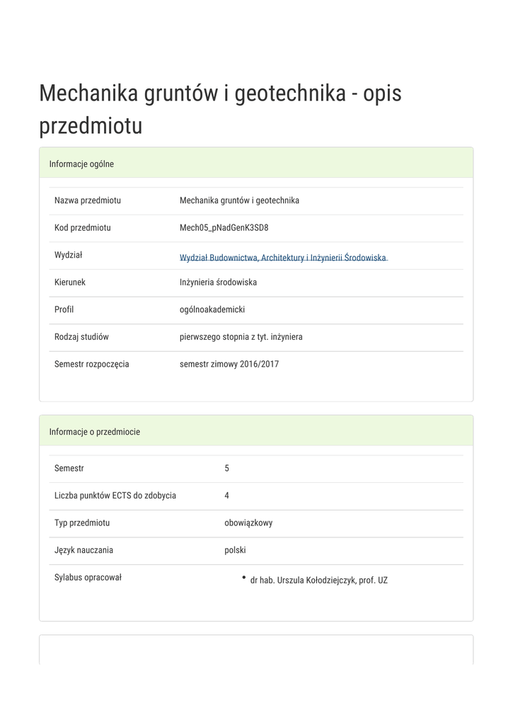 Mechanika gruntów i geotechnika - opis przedmiotu Informacje ogólne Nazwa przedmiotu Mechanika gruntów i geotechnika Kod przedmiotu Mech05_pNadGenK3SD8 Wydział Wydział Budownictwa, Architektury i Inżynierii Środowiska Kierunek Inżynieria środowiska Profil ogólnoakademicki Rodzaj studiów pierwszego stopnia z tyt. inżyniera Semestr rozpoczęcia semestr zimowy 2016/2017 Informacje o przedmiocie Semestr 5 Liczba punktów ECTS do zdobycia 4 Typ przedmiotu obowiązkowy Język nauczania polski Sylabus opracował dr hab. Urszula Kołodziejczyk, prof. UZ Formy zajęć Forma zajęć Wykład Liczba godzin Liczba godzin Liczba godzin w Liczba godzin w Forma w semestrze w tygodniu semestrze tygodniu zaliczenia (stacjonarne) (stacjonarne) (niestacjonarne) (niestacjonarne) 15 1 9 ,6 Zaliczenie na ocenę Projekt 15 1 9 ,6 Zaliczenie na ocenę Laboratorium 15 1 9 ,6 Zaliczenie na ocenę Cel przedmiotu Zapoznanie studentów z podstawami mechaniki gruntów i geotechniki, w tym: identyfikowaniem podłoża i jego oceną z punktu widzenia posadowienia budowli, ustalaniem charakterystyk geotechnicznych gruntu oraz rozwiązywaniem prostych zadań inżynierskich. Wymagania wstępne Formalne: zaliczenie przedmiotów – geologia, hydrologia, mechanika techniczna z wytrzymałością materiałów. Nieformalne: brak. Zakres tematyczny Program wykładów: Rodzaje gruntów. Parametry gruntów. Terenowe badania geologiczno-inżynierskie. Charakterystyka zjawisk geotechnicznych: kapilarność, tiksotropia, sufozja, osuwiska, glacitektonika i in. Rozkład naprężeń w gruntach. Wytrzymałość gruntów. Stateczność skarp i zboczy. Inżyniersko-geologiczna charakterystyka podłoża gruntowego. Katastrofy budowlane. Metody wzmacniania podłoża gruntowego. Geotechnika w inżynierii środowiska. Program ćwiczeń laboratoryjnych: 1. badania terenowe: wiercenie, sondowanie, makroskopowa analiza gruntu, 2. badania laboratoryjne: określenie właściwości fizyczno-mechanicznych gruntu: rodzaj, ciężar objętościowy, granice konsystencji, stopień zagęszczenia, wilgotność optymalna, stopień plastyczności oraz edometryczny moduł ściśliwości. Program ćwiczeń projektowych: Opracowanie dokumentacji geotechnicznej dla wybranego obiektu inżynierskiego. Metody kształcenia Metody podające: wykład informacyjno- problemowy. Metody ćwiczeniowo – praktyczne: metoda projektu, laboratoryjna. Efekty kształcenia i metody weryfikacji osiągania efektów kształcenia Opis efektu Symbole Metody weryfikacji Forma zajęć efektów Student ma uporządkowaną, podbudowaną K_W02 kolokwium Wykład K_W11 kolokwium Wykład K_U08 kolokwium Laboratorium gruntów i określać ich właściwości fizyczne przygotowanie Projekt i mechaniczne projektu teoretycznie szczegółowo wiedzę związaną z rodzajami gruntów, określania ich właściwości, a także sposobami wzmacniania gruntów Student zna typowe technologie inżynierskie w zakresie geotechniki Student potrafi badać i rozpoznać rodzaje wykonanie sprawozdań laboratoryjnych Opis efektu Symbole Metody weryfikacji Forma zajęć efektów Student potrafi – przy formułowaniu i K_U10 kolokwium Laboratorium rozwiązywaniu zadań inżynierskich – przygotowanie Projekt integrować wiedzę z zakresu hydrologii, projektu mechaniki płynów i mechaniki i wykonanie wytrzymałości materiałów oraz zastosować sprawozdań podejście systemowe, uwzględniające także laboratoryjnych aspekty pozatechniczne oraz potrafi dokonać identyfikacji i sformułować warunki geotechniczne gruntów Warunki zaliczenia Podstawą zaliczenia ćwiczeń laboratoryjnych jest: obecność na wszystkich zajęciach, przygotowanie się do każdych zajęć, wykonanie badań laboratoryjnych i opracowanie sprawozdań z przeprowadzonych badań. Podstawą do zaliczenia ćwiczeń projektowych jest obecność na wszystkich zajęciach, systematyczne przygotowanie się do każdych zajęć oraz opracowanie, a następnie - oddanie w terminie i zaliczenie projektu. Podstawą do zaliczenia wykładu są pozytywne wyniki kontroli wiadomości przeprowadzonej w formie ustalonej z prowadzącym zajęcia na początku wykładów (kolokwium zaliczeniowe, test, odpowiedź ustna). Podstawą ustalenia oceny łącznej jest średnia ważona uzyskana przez dodanie: 0,34 oceny z wykładu, 0,33 oceny z ćwiczeń laboratoryjnych oraz 0,33 oceny z ćwiczeń projektowych. Średnią ważoną zaokrągla się do dwóch miejsc po przecinku. Ocena łączna ustalona jest na podstawie średniej ważonej zgodnie z zasadą: poniżej 3,30 – dostateczny, od 3,30 do 3,69 – dostateczny plus, od 3,70 do 4,09 – dobry, od 4,10 do 4,49 – dobry plus, od 4,50 – bardzo dobry. Obciążenie pracą Obciążenie pracą Studia Studia niestacjonarne stacjonarne (w godz.) (w godz.) Godziny kontaktowe (udział w zajęciach; konsultacjach; egzaminie, itp.) 90 80 Samodzielna praca studenta (przygotowanie do: zajęć, kolokwium, 30 40 Łącznie 120 120 Punkty ECTS Studia Studia niestacjonarne egzaminu; studiowanie literatury przygotowanie: pracy pisemnej, projektu, prezentacji, raportu, wystąpienia; itp.) stacjonarne Zajęcia z udziałem nauczyciela akademickiego 3 3 Zajęcia bez udziału nauczyciela akademickiego 1 1 Łącznie 4 4 Literatura podstawowa 1. Bażyński J. i in., Zasady sporządzania dokumentacji geologiczno-inżynierskiej, Państwowy Instytut Geologiczny, Warszawa 1999 2. Kotowski J., Kraiński A., Geologia inżynierska, Wydawnictwo PZ, Zielona Góra 2000 3. Kowalski W.C., Geologia inżynierska, Wydawnictwo Geologiczne, Warszawa 1999 4. Myślińska E., Laboratoryjne badania gruntów, Wyd. Nauk. PWN, Warszawa 2001 5. Wiłun Z., Zarys geotechniki, Wydawnictwo Komunikacji i Łączności, Warszawa 2007 Literatura uzupełniająca 1. Pisarczyk S., Geoinżynieria. Metody modyfikacji podłoża gruntowego, WPW, Warszawa 2005 2. Obowiązujące akty prawne Uwagi brak Zmodyfikowane przez dr inż. Sylwia Myszograj (ostatnia modyfikacja: 05-09-