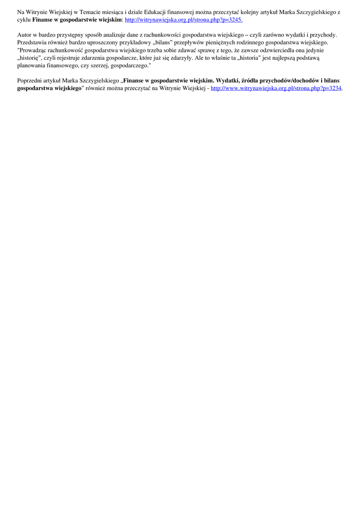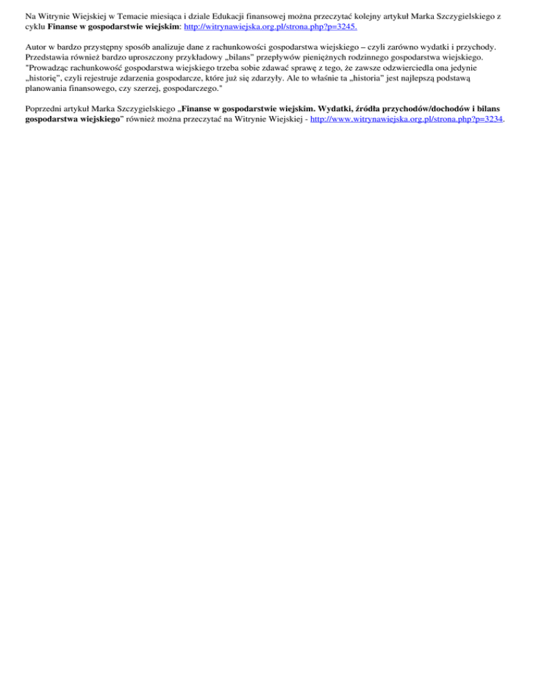 Na Witrynie Wiejskiej w Temacie miesiąca i dziale Edukacji finansowej można przeczytać kolejny artykuł Marka Szczygielskiego z cyklu Finanse w gospodarstwie wiejskim: http://witrynawiejska.org.pl/strona.php?p=3245. Autor w bardzo przystępny sposób analizuje dane z rachunkowości gospodarstwa wiejskiego – czyli zarówno wydatki i przychody. Przedstawia również bardzo uproszczony przykładowy „bilans” przepływów pieniężnych rodzinnego gospodarstwa wiejskiego. "Prowadząc rachunkowość gospodarstwa wiejskiego trzeba sobie zdawać sprawę z tego, że zawsze odzwierciedla ona jedynie „historię”, czyli rejestruje zdarzenia gospodarcze, które już się zdarzyły. Ale to właśnie ta „historia” jest najlepszą podstawą planowania finansowego, czy szerzej, gospodarczego." Poprzedni artykuł Marka Szczygielskiego „Finanse w gospodarstwie wiejskim. Wydatki, źródła przychodów/dochodów i bilans gospodarstwa wiejskiego” również można przeczytać na Witrynie Wiejskiej - http://www.witrynawiejska.org.pl/strona.php?p=3234. Powered by TCPDF (www.tcpdf.org)