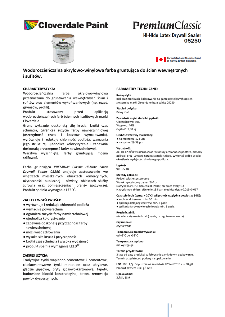 Wodorozcieńczalna akrylowo-winylowa farba gruntująca do ścian wewnętrznych i sufitów. CHARAKTERYSTYKA: Wodorozcieńczalna farba akrylowo-winylowa przeznaczona do gruntowania wewnętrznych ścian i sufitów oraz elementów wykończeniowych (np. rozet, gzymsów, profili). Produkt stosowany przed aplikacją wodorozcieńczalnych farb ściennych i sufitowych marki Cloverdale. Grunt wykazuje doskonałą siłę krycia, krótki czas schnięcia, ogranicza zużycie farby nawierzchniowej (oszczędność czasu i kosztów wymalowania), wyrównuje i redukuje chłonność podłoża, wzmacnia jego strukturę, ujednolica kolorystycznie i zapewnia doskonałą przyczepność farby nawierzchniowej. Warstwę wyschniętej farby gruntującej można szlifować. PARAMETRY TECHNICZNE: Farba gruntująca PREMIUM Classic Hi-Hide Latex Drywall Sealer 05250 znajduje zastosowanie we wnętrzach mieszkalnych, obiektach komercyjnych, użyteczności publicznej i oświaty, obiektach służby zdrowia oraz pomieszczeniach branży spożywczej. ® Produkt spełnia wymagania LEED . Lepkość: 90 - 95 KU ZALETY I WŁAŚCIWOŚCI: ● wyrównuje i redukuje chłonność podłoża ● wzmacnia powierzchnię ● ogranicza zużycie farby nawierzchniowej ● ujednolica kolorystycznie ● zapewnia doskonałą przyczepność farby nawierzchniowej ● możliwość szlifowania ● wysoka siła krycia i przyczepność ● krótki czas schnięcia i wysoka wydajność ● produkt spełnia wymagania LEED® ZAKRES UŻYCIA: Tradycyjne tynki wapienno-cementowe i cementowe, cienkowarstwowe tynki mineralne oraz akrylowe, gładzie gipsowe, płyty gipsowo-kartonowe, tapety, budowlane bloczki konstrukcyjne, beton, renowacja powłok dyspersyjnych. Kolorystyka: Biel oraz możliwość kolorowania na gamę pastelowych odcieni z wzornika marki Cloverdale (baza White 05250) Stopień połysku: Pełny mat Zawartość części stałych i gęstość: Objętościowo: 30% Wagowo: 44% Gęstość: 1,30 kg Grubość warstwy malarskiej: ● na mokro 91-124 μm ● na sucho: 28-38 μm Wydajność: ok. 10-12 m2/l w zależności od struktury i chłonności podłoża, metody aplikacji oraz użytego narzędzia malarskiego. Wykonać próbę w celu określenia wydajności dla danego podłoża. Metody aplikacji: Pędzel: włosie syntetyczne Wałek: syntetyczny o szer. 240 cm Natrysk: H.V.L.P.: ciśnienie 0,69 bar, średnica dyszy 1.3 Natrysk typu airless: ciśnienie 138 bar, średnica dyszy 0.013÷0.017 Czas schnięcia (temp. + 20°C i wilgotność względna powietrza 50%): ● suchość dotykowa: min. 30 min. ● aplikacja kolejnej warstwy: min. 3 godz. ● aplikacja farby nawierzchniowej: min. 3 godz. Rozcieńczalnik: nie zaleca się rozcieńczać (czysta, przegotowana woda) Czyszczenie: czysta woda Temperatura przechowywania: od +5°C do +32°C Temperatura zapłonu: nie występuje Termin przydatności: 3 lata od daty produkcji w fabrycznie zamkniętym opakowaniu. Termin przydatności podany na opakowaniu. LZO: Kat. A/g. Dopuszczalna zawartość LZO od 2010 r. – 30 g/l. Produkt zawiera < 30 g/l LZO. Opakowania: 3,78 l, 18,9 l 1 PRZYGOTOWANIE PODŁOŻA: APLIKACJA: ● surowe powierzchnie (niemalowane): Ściany i sufity: nowe tynki cementowo-wapienne, cementowe i podłoża betonowe malować po 4 tygodniach sezonowania, a gładzie gipsowe po całkowitym wyschnięciu i związaniu. Z powierzchni usunąć brud, kurz, tłuste plamy oraz luźne fragmenty podłoża. Nierówności i pęknięcia wyrównać materiałem zbliżonym składem i strukturą do pierwotnie użytego. Mikroorganizmy (pleśń i grzyby) usunąć odpowiednim preparatem. Przygotowane w ten sposób podłoże zagruntować PREMIUM Classic Hi-Hide Latex Drywall Sealer 05250. W przypadku podłoży gipsowych oraz osłabionych wypraw tynkarskich przed aplikacją wymienionego powyżej produktu zastosować preparat gruntujący Premium Interior/Exterior Clear Acrylic Priming Agent 007 marki Cloverdale lub Corotech® Clear Acrylic Sealer V027 marki Corotech. Farbę gruntującą PREMIUM Classic Hi-Hide Latex Drywall Sealer 05250 aplikować po min. 12 godzinach. Problematyczne podłoża z uciążliwymi plamami lub zaciekami zagruntować izolującą farbą gruntującą Interior/Exterior Latex Stain Blocking Primer 05130. Uwaga: w przypadku niemalowanych podłoży czynność gruntowania stanowi absolutny wymóg technologiczny. Podłoże musi być nośne, suche, czyste i odpylone. Produkt przeznaczony do stosowania w postaci handlowej, przed użyciem wymaga jedynie dokładnego wymieszania. Farbę gruntującą nanosić w 1-2 warstwach pędzlem, wałkiem malarskim lub natryskiem. Szczegółowe dane zamieszczono w zakładce „PARAMETRY TECHNICZNE”. Pracować metodą „mokre w mokre” unikając powstania śladów od narzędzia malarskiego. Kolejną warstwę aplikować po min. 3 godzinach. Przerwy technologiczne zaplanować na krawędziach ścian oraz w narożnikach pomieszczeń. Farby nawierzchniowe marki Cloverdale nanosić po min. 3 godzinach od gruntowania PREMIUM Classic Hi-Hide Latex Drywall Sealer 05250. Nie nanosić na powłoki farb wapiennych i klejowych. Zaleca się użycie narzędzi malarskich marki BENJAMIN MOORE lub RICHARD. ● powierzchnie malowane: Ściany i sufity: usunąć brud, kurz, tłuste plamy, łuszczące się powłoki malarskie oraz luźne fragmenty podłoża. Powierzchnie błyszczące zmatowić. Nierówności i pęknięcia podłoża wyrównać materiałem zbliżonym składem i strukturą do pierwotnie użytego. Mikroorganizmy (pleśń i grzyby) usunąć odpowiednim preparatem. W przypadku renowacji starych powłok malarskich wykonać wymalowanie próbne. Uzyskanie pozytywnego wyniku decyduje o ostatecznym zastosowaniu produktu. Czynność gruntowania może zostać pominięta jedynie pod warunkiem doskonałego zachowania istniejącej powłoki malarskiej. WARUNKI KLIMATYCZNE (W TRAKCIE I PO APLIKACJI): Prace malarskie prowadzić przy temperaturze powietrza 0 i podłoża nie niższej niż +10 C. Optyma
