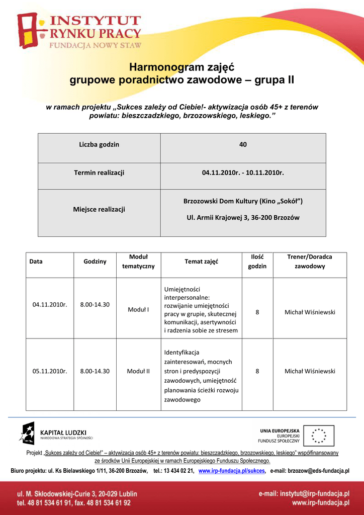 Harmonogram zajęć grupowe poradnictwo zawodowe – grupa II w ramach projektu „Sukces zależy od Ciebie!- aktywizacja osób 45+ z terenów powiatu: bieszczadzkiego, brzozowskiego, leskiego.” Liczba godzin 40 Termin realizacji 04.11.2010r. - 10.11.2010r. Brzozowski Dom Kultury (Kino „Sokół”) Miejsce realizacji Ul. Armii Krajowej 3, 36-200 Brzozów Data 04.11.2010r. 05.11.2010r. Godziny 8.00-14.30 8.00-14.30 Moduł tematyczny Temat zajęć Ilość godzin Trener/Doradca zawodowy Moduł I Umiejętności interpersonalne: rozwijanie umiejętności pracy w grupie, skutecznej komunikacji, asertywności i radzenia sobie ze stresem 8 Michał Wiśniewski 8 Michał Wiśniewski Moduł II Identyfikacja zainteresowań, mocnych stron i predyspozycji zawodowych, umiejętność planowania ścieżki rozwoju zawodowego Projekt „Sukces zależy od Ciebie!” – aktywizacja osób 45+ z terenów powiatu: bieszczadzkiego, brzozowskiego, leskiego” współfinansowany ze środków Unii Europejskiej w ramach Europejskiego Funduszu Społecznego. Biuro projektu: ul. Ks Bielawskiego 1/11, 36-200 Brzozów, tel.: 13 434 02 21, www.irp-fundacja.pl/sukces, e-mail: [email protected] 08.11.2010r. 09.11.2010r. 10.11.2010r. 8.00-14.30 8.00-14.30 8.00-14.30 Moduł III Moduł IV Moduł V Autoprezentacja i kreowanie wizerunku, przygotowanie do rozmowy kwalifikacyjnej Przygotowywanie dokumentów aplikacyjnych, metody aktywnego poszukiwania pracy i techniki rekrutacyjne Charakterystyka i możliwości lokalnego rynku pracy, prawa pracownicze i formy zatrudnienia w Polsce 8 Michał Wiśniewski 8 Michał Wiśniewski 8 Michał Wiśniewski Projekt „Sukces zależy od Ciebie!” – aktywizacja osób 45+ z terenów powiatu: bieszczadzkiego, brzozowskiego, leskiego” współfinansowany ze środków Unii Europejskiej w ramach Europejskiego Funduszu Społecznego. Biuro projektu: ul. Ks Bielawskiego 1/11, 36-200 Brzozów, tel.: 13 434 02 21, www.irp-fundacja.pl/sukces, e-mail: [email protected]