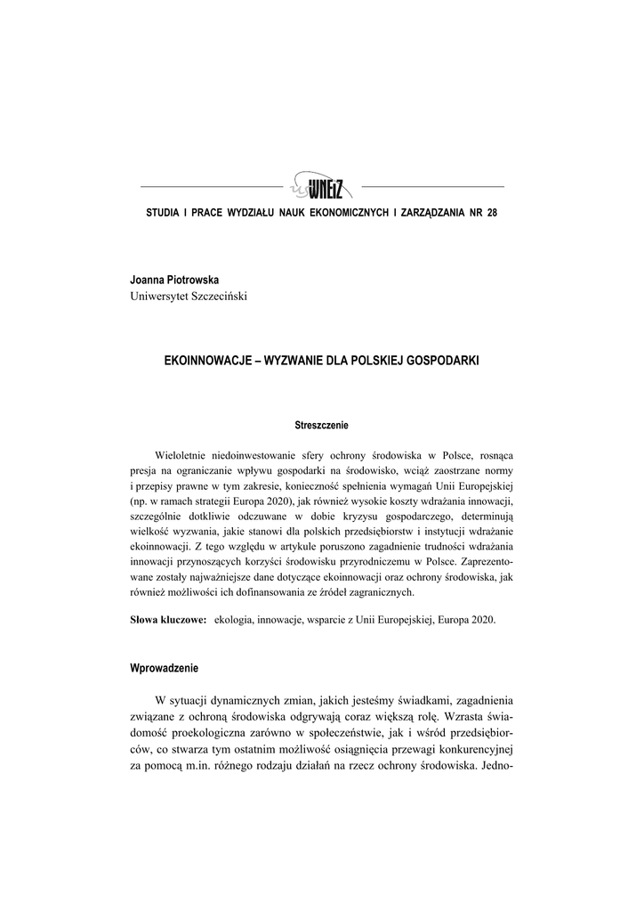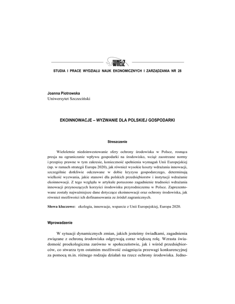 STUDIA I PRACE WYDZIAŁU NAUK EKONOMICZNYCH I ZARZĄDZANIA NR 28 Joanna Piotrowska Uniwersytet Szczeciński EKOINNOWACJE – WYZWANIE DLA POLSKIEJ GOSPODARKI Streszczenie Wieloletnie niedoinwestowanie sfery ochrony środowiska w Polsce, rosnąca presja na ograniczanie wpływu gospodarki na środowisko, wciąż zaostrzane normy i przepisy prawne w tym zakresie, konieczność spełnienia wymagań Unii Europejskiej (np. w ramach strategii Europa 2020), jak również wysokie koszty wdrażania innowacji, szczególnie dotkliwie odczuwane w dobie kryzysu gospodarczego, determinują wielkość wyzwania, jakie stanowi dla polskich przedsiębiorstw i instytucji wdrażanie ekoinnowacji. Z tego względu w artykule poruszono zagadnienie trudności wdrażania innowacji przynoszących korzyści środowisku przyrodniczemu w Polsce. Zaprezentowane zostały najważniejsze dane dotyczące ekoinnowacji oraz ochrony środowiska, jak również możliwości ich dofinansowania ze źródeł zagranicznych. Słowa kluczowe: ekologia, innowacje, wsparcie z Unii Europejskiej, Europa 2020. Wprowadzenie W sytuacji dynamicznych zmian, jakich jesteśmy świadkami, zagadnienia związane z ochroną środowiska odgrywają coraz większą rolę. Wzrasta świadomość proekologiczna zarówno w społeczeństwie, jak i wśród przedsiębiorców, co stwarza tym ostatnim możliwość osiągnięcia przewagi konkurencyjnej za pomocą m.in. różnego rodzaju działań na rzecz ochrony środowiska. Jedno- 174 WSPÓŁCZESNE WYZWANIA GOSPODAROWANIA I ZARZĄDZANIA cześnie następuje ciągłe zaostrzanie norm i przepisów w zakresie ochrony środowiska. Wszystko to wymusza nadrabianie wieloletnich zaległości w tej niedocenianej niegdyś w Polsce, a przez to niedofinansowanej dziedzinie. Polska, jako kraj członkowski Unii Europejskiej, jest również wykonawcą strategii Europa 2020, której jednym z głównych celów jest zrównoważony rozwój, a więc wspieranie gospodarki efektywniej korzystającej z zasobów, bardziej przyjaznej środowisku i bardziej konkurencyjnej1. W związku z tym wprowadzanie ekoinnowacji, czyli innowacji przynoszących korzyści środowisku przyrodniczemu, jest wielkim przedsięwzięciem. Polska musi dorównać poziomem ochrony środowiska krajom Unii Europejskiej, co w dobie kryzysu gospodarczego wiąże się z dodatkowymi trudnościami. Jest to więc wielkie wyzwanie, które stoi przed przedsiębiorstwami i całą polską gospodarką. Celem artykułu jest prezentacja skali podejmowanych w Polsce ekoinnowacji oraz wyzwania, jakie stanowią one współcześnie dla gospodarki. Aby zrealizować ten cel, przeanalizowano: – najważniejsze dane z zakresu ekoinnowacji w Polsce, – nakłady ponoszone na ochronę środowiska, – skalę pomocy zagranicznej w sferze ochrony środowiska. 1. Analiza stanu ekoinnowacji w Polsce Rozważania na temat ekoinnowacji należy rozpocząć od przytoczenia ich definicji. Ekoinnowacje są jakąkolwiek formą innowacji powodującą lub osiągającą znaczący lub widoczny postęp w osiągnięciu celu zrównoważonego rozwoju poprzez zredukowanie oddziaływania na środowisko, wzmocnienie odporności na presję środowiska lub osiągnięcie bardziej efektywnego i odpowiedzialnego wykorzystania surowców naturalnych2. Stan innowacji środowiskowych w Polsce określa m.in. dokument Polityka ekologiczna państwa w latach 2009–2012 z perspektywą do roku 2016. Przyznaje się w nim, że w Polsce występuje chroniczne niedoinwestowanie badań naukowych, a w dziedzinie ochrony środowiska liczba rozwiązań nowatorskich jest bardzo niewielka, 1 Komisja Europejska, Komunikat Komisji Europa 2020. Strategia na rzecz inteligentnego i zrównoważonego rozwoju sprzyjającego włączeniu społecznemu, Bruksela 2010, s. 11. 2 European Commission, Communication from the Commission. Innovation for a sustainable future – The Eco-innovation Action Plan (Eco-AP), Bruksela 2011, s. 2. EKOINNOWACJE – JOANNA PIOTROWSKA WYZWANIE DLA POLSKIEJ GOSPODARKI mimo posiadania znacznej liczby placówek naukowych i dobrze wykształconych naukowców. Winne tego stanu są słabe wyposażenie laboratoriów badawczych oraz ich zbyt słabo rozwinięte kontakty zarówno z polskim przemysłem, jak i z zagranicznymi placówkami naukowymi. Z kolei polski przemysł nie jest nastawiony na wdrażanie rozwiązań będących efektem polskiej myśli technicznej, lecz chętniej korzysta ze sprawdzonych technologii renomowanych firm zagranicznych3. Zauważa się ponadto, że nie rozwinął się w Polsce przemysł urządzeń ochrony środowiska, pomimo istnienia rynku inwestycyjnego o wolumenie 1,5–2 miliardów euro rocznie. Jako stanowczo niewystarczająca oceniona została współpraca przemysłu z placówkami naukowo-badawczymi, które są w stanie opracować ekoinnowacje w postaci nowych technologii dla tego rynku. Przyznaje się, że brakuje narzędzi stymulujących wdrożenie najciekawszych projektów do praktyki ze strony państwa4. W dokumencie określa się także zadania do wykonania oraz niezbędne do tego szacunkowe nakłady: na lata 2009–2012 – 66,2 mld zł (w cenach z 2007 roku), a na lata 2013–2016 – 63,5 mld zł (w cenach z 2007 roku)5. Przytoczone w Polityce… fakty i powzięte na ich podstawie opinie wyraźnie określają słabą pozycję Polski w sferze ekoinnowacji. Niski poziom innowacyjności w zakresie korzyści dla środowiska w połączeniu z brakiem odpowiednich zachęt ze strony państwa (co organy państwa same przyznają w wyżej wymienionym dokumencie) jest sytuacją bardzo złą, ale także źle rokującą, zwłaszcza że zjawisko innowacyjności jest bardzo złożonym, jakościowym czynnikiem rozwoju gospodarki. Trudno ocenić ten proces, ale także go wywołać – innowacyjność o odpowiedniej intensywności i jakości nie pojawia się samorzutnie i spontanicznie. Wymaga nie tylko sprzyjających warunków, ale również racjonalnej stymulacji6. Nie ulega wątpliwości, że inno