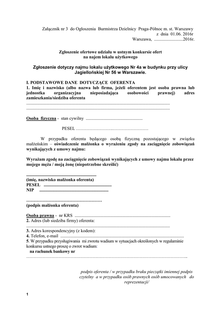 Załącznik nr 3 do Ogłoszenia Burmistrza Dzielnicy Praga-Północ m. st. Warszawy z dnia 01.06. 2016r Warszawa, ..........................2016r. Zgłoszenie ofertowe udziału w ustnym konkursie ofert na najem lokalu użytkowego Zgłoszenie dotyczy najmu lokalu użytkowego Nr 4a w budynku przy ulicy Jagiellońskiej Nr 56 w Warszawie. I. PODSTAWOWE DANE DOTYCZĄCE OFERENTA 1. Imię i nazwisko (albo nazwa lub firma, jeżeli oferentem jest osoba prawna lub jednostka organizacyjna nieposiadająca osobowości prawnej) adres zamieszkania/siedziba oferenta ................................................................................................................................. ................................................................................................................................. Osoba fizyczna - stan cywilny ................................................... PESEL …………………….…………………… W przypadku oferenta będącego osobą fizyczną pozostającego w związku małżeńskim – oświadczenie małżonka o wyrażeniu zgody na zaciągnięcie zobowiązań wynikających z umowy najmu: Wyrażam zgodę na zaciągnięcie zobowiązań wynikających z umowy najmu lokalu przez mojego męża / moją żonę (niepotrzebne skreślić) ............................................................... (imię, nazwisko małżonka oferenta) PESEL ............................................................. NIP .............................................................. …………………………………………… (podpis małżonka oferenta) Osoba prawna - nr KRS ...................................................................................... 2. Adres (lub siedziba firmy) oferenta: ................................................................................................................................. 3. Adres korespondencyjny (z kodem): 4. Telefon, e-mail ............................................................................................................... 5. W przypadku przysługiwania mi zwrotu wadium w sytuacjach określonych w regulaminie konkursu ustnego proszę o zwrot wadium: na rachunek bankowy nr ……………………………………………………………………………………………….. podpis oferenta / w przypadku braku pieczątki imiennej podpis czytelny a w przypadku osób prawnych osób umocowanych do reprezentacji/ 1 6. Na ile lat najemca chce podpisać umowę najmu: ................... (do 3 lat) 7.Lokal będzie wykorzystywany na prowadzenie działalności w branży handlowej – sprzedaż artykułów cukierniczych. typu: ...............…………………………………………………………………………… (kawiarnia, cukiernia, lodziarnia itp ) 8. Adresy innych lokali będących własnością m. st. Warszawy wynajmowanych przez Oferenta * .............................................................................................................................. 9. Oświadczenie o braku zaległości w lokalach wymienionych w pkt 8* ................................................................................................................................. 10. Przewidywany okres konieczny na rozpoczęcie działalności gospodarczej po protokolarnym przekazaniu lokalu ……………………………………………………… II.DOKUMENTYOBOWIĄZKOWE, KTÓRE NALEŻY DOŁĄCZYĆ DO ZGŁOSZENIA: Do zgłoszenia należy dołączyć: 1. Kserokopia wpłacenia wadium przez oferenta. 2. W przypadku, gdy umowa ma być zawierana przez pełnomocnika- pełnomocnictwo udzielone w formie pisemnej. 3. W przypadku osób fizycznych rozliczających się w formie spółki cywilnej – aktualna umowa spółki cywilnej. 4. Oświadczenie o posiadanych środkach finansowych na remont i modernizację lokalu. 5. Wizualizacja zagospodarowania lokalu. Oświadczam, iż : 1. działalność gospodarczą: (zaznaczyć „X”) o prowadzę o nie prowadzę i zobowiązuję się w przypadku wygrania przetargu do rozpoczęcia prowadzenia działalności gospodarczej przed podpisaniem umowy najmu. …………………………………………………………………………… podpis oferenta / w przypadku braku pieczątki imiennej podpis czytelny a w przypadku osób prawnych osób umocowanych do reprezentacji/ 2 OŚWIADCZNIE Ja niżej podpisany świadomy odpowiedzialności karnej za składanie fałszywych zeznań, oświadczam: 1) Oświadczam że wyrażam zgodę na przetwarzanie moich danych osobowych w zakresie niezbędnym do przeprowadzenia konkursu przy zachowaniu zasady jawności postępowania konkursowego i wyniku konkursu na najem lokali użytkowych; 2) że zapoznałem się z warunkami regulaminu ustnego konkursu ofert i przyjmuje go bez zastrzeżeń. 3) zapoznałem się ze stanem technicznym lokalu poprzez dokonanie oględzin lub projektem protokołu zdawczo-odbiorczego oraz przykładowym wzorem umowy najmu i je akceptuje, 4) zobowiązuję się do zawarcia załącznika do umowy w formie aktu notarialnego, w którym poddam się egzekucji z art. 777 § 1 pkt. 4 i 5 k.p.c.; 5) zobowiązuję się przed podpisaniem umowy najmu dostarczyć dokumenty: NIP i REGON. 6) Oświadczam, że nie figuruję w rejestrze dłużników prowadzonym przez biura informacji gospodarczych, o których mowa w przepisach o udostępnieniu informacji gospodarczych. 7) Oświadczam, iż nie jestem w stanie likwidacji lub upadłości i że nie zalegam w opłatach wobec Skarbu Państwa i ZUS, a stosowne zaświadczenia to potwierdzające dostarczę przed podpisaniem umowy najmu do ZGN*. 8) Oświadczam, że moja aktualna sytuacja finansowa: a) umożliwia rozpoczęcie działalności w lokalu objętym niniejszą procedurą w deklarowanym terminie o którym mowa w pkt.10 oferty; b) umożliwia terminowe wywiązywanie się z zobowiązań wobec Wynajmującego, wynikających z warunków umowy najmu. 9) Oświadczam ponadto, że 