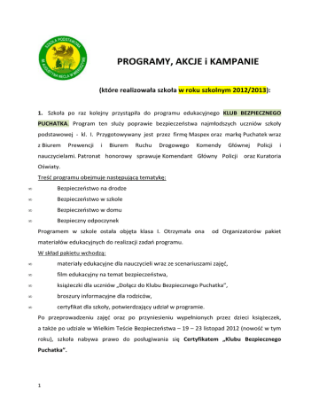 PROGRAMY, AKCJE i KAMPANIE (które realizowała szkoła w roku szkolnym 2012/2013): 1. Szkoła po raz kolejny przystąpiła do programu edukacyjnego KLUB BEZPIECZNEGO PUCHATKA. Program ten służy poprawie bezpieczeństwa najmłodszych uczniów szkoły podstawowej - kl. I. Przygotowywany jest przez firmę Maspex oraz markę Puchatek wraz z Biurem Prewencji i Biurem Ruchu Drogowego Komendy Głównej Policji i nauczycielami. Patronat honorowy sprawuje Komendant Główny Policji oraz Kuratoria Oświaty. Treść programu obejmuje następującą tematykę: • Bezpieczeństwo na drodze • Bezpieczeństwo w szkole • Bezpieczeństwo w domu • Bezpieczny odpoczynek Programem w szkole ostała objęta klasa I. Otrzymała ona od Organizatorów pakiet materiałów edukacyjnych do realizacji zadań programu. W skład pakietu wchodzą: • materiały edukacyjne dla nauczycieli wraz ze scenariuszami zajęć, • film edukacyjny na temat bezpieczeństwa, • książeczki dla uczniów „Dołącz do Klubu Bezpiecznego Puchatka”, • broszury informacyjne dla rodziców, • certyfikat dla szkoły, potwierdzający udział w programie. Po przeprowadzeniu zajęć oraz po przyniesieniu wypełnionych przez dzieci książeczek, a także po udziale w Wielkim Teście Bezpieczeństwa – 19 – 23 listopad 2012 (nowość w tym roku), szkoła nabywa prawo do posługiwania się Certyfikatem „Klubu Bezpiecznego Puchatka”. 1 2. Szkoła bierze udział w programie „Owoce w szkole” finansowanym przez Unię Europejską oraz ARR. W programie uczestniczy 40 uczniów z klas I – III. W ciągu roku szkolnego uczniowie otrzymywali przez 3 dni w tygodniu bezpłatne owoce i warzywa oraz soki owocowe. Codzienna porcja witamin i soli mineralnych wzbogaciła codzienny jadłospis naszych uczniów. Wychowawczynie klas I – III podjęły dodatkowe działania towarzyszące realizacji w/w programu (w I semestrze roku szkolnego 2012/2013): • odbyły się 3 zintegrowane zajęcia edukacyjne, mające na celu poszerzenie wiedzy uczniów na temat zdrowego odżywiania, znaczenia spożywania owoców, utrwalenie zdrowych nawyków żywieniowych wśród uczniów, • we wszystkich klasach odbyły się zajęcia plastyczne dotyczące ulubionych przez dzieci owoców i warzyw oraz konkurs plastyczny „Aby zdrowym być”, • uczniowie przygotowali z pomocą rodziców i nauczycieli sałatki owocowo – warzywne oraz wzięli udział w konkursie ogólnopolskim „Śniadaniowa klasa”, • uczniowie klasy III wykorzystując różne źródła informacji zgromadzili wiadomości na temat roli witamin w diecie dziecka i wykonali gazetkę „Witaminowe ABC w warzywach i owocach”. 3. W roku szkolnym 2012/2013 realizowany jest w szkole program edukacji środowiskowej: „CZYM SKORUPKA ZA MŁODU NASIĄKNIE… CZYLI JAK POKOCHAĆ PRZYRODĘ, ŻEBY ONA POKOCHAŁA NAS” (program przeznaczony jest dla uczniów klas I – III, opracowany przez Zespół Edukacji i Udostępniania Gorczańskiego Parku Narodowego). Cykl 10 zajęć do zrealizowania w ciągu roku szkolnego nosi tytuł: „Chrońmy przyrodę we własnym otoczeniu”. Program ten ma na celu zmobilizowanie dzieci do działań na rzecz ochrony środowiska. W I semestrze roku szkolnego 2012/2013 zrealizowano następujące zajęcia: • „Jesienne podróże. Poznajemy wędrówki zwierząt” – dzieci samodzielnie prowadziły obserwacje wędrówek zwierząt w najbliższym otoczeniu, opisywały ich trasy i sposoby „, • „Poznajemy naszą rzekę” – dzieci poznały wybrane bezkręgowce wodne, poruszały też problemy zanieczyszczeń wody oraz konieczności ochrony i oszczędzania zasobów wodnych, • „Jesienne i zimowe kłopoty zwierząt leśnych i polnych” – podczas tych zajęć dzieci zrozumiały rolę człowieka w środowisku przyrodniczym, 2 • „Czy zasypią nas śmieci” – cz. 1 i 2 – uczniowie uświadomili sobie własną odpowiedzialność za stan otoczenia, utrwalili zasady segregowania śmieci wg kategorii. 4. Szkoła prowadzi działania w ramach programu „SZKOŁA Z KLASĄ 2.0”. W I semestrze roku szkolnego 2012/2013 osiągnięcia, jakie udało się dokonać można podzielić na dwie grupy: „nauczyciel”, „koordynator”. „Nauczyciel” – przeprowadzono zadanie TIK – zorganizowano wycieczkę po Australii (Sydney) za pomocą mapy Google, odbyły się w klasie IV lekcje języka angielskiego z wykorzystaniem komputerów. „Koordynator” – odbyły się w szkole spotkania organizacyjne, podczas których ustalono plan działania (systematyczne zwiększanie poziomu wykorzystywania TIK w uczeniu się i nauczaniu, utrwalenie zasad korzystania z nowych technologii w edukacji – Kodeks 2.0, kształtowanie u uczniów umiejętności odpowiedzialnego korzystania z Internetu, kształcenie umiejętności współpracy w grupie). W dniu 12.12.2012r. odbyła się debata szkolna, w której wzięli udział uczniowie pod opieką koordynatora programu. Ustalono jasne i przejrzyste zasady Kodeksu Szkoły z klasą 2.0. (główne hasła: „Bądź bezpieczny w sieci”, „Nie kradnij z Internetu”, „Ucz się TIK”, „używaj Internetu do komunikacji z innymi”). 5. Szkoła kontynuuje udział w programach profilaktycznych: • „ZNAJDŹ WŁAŚCIWE ROZWIĄZANIE” (DLA KLASY IV), • „TRZYMAJ FORMĘ” (DLA KLAS IV – VI), • „ NIE PAL PRZY MNIE, PROSZĘ” (DLA KLASY I), oraz przystąpiła do nowego programu dla klasy „0” – „CZYSTE POWIETRZE WOKÓŁ NAS”. Celem programu „Znajdź właściwe rozwiązanie” (organizator: Państwowa Inspekcja Sanitarna w Pucku) jest: • wzmocnienie postaw zobowiązujących do nie palenia, • ukazanie funkcjonowania ludzkiego organizmu i jego potrzeb, a przede wszystkim konieczności odpowiedniego odżywiania się i czystego powietrza, • przekazanie wiadomości o zachowaniach asertywnych, uczenie się rozpoznawania swych zachowań, radzenia sobie z problemami, 3 • uświadomienie nacisku grupowego wraz z na