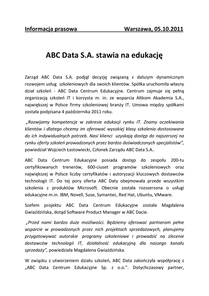 Informacja prasowa Warszawa, 05.10.2011 ABC Data S.A. stawia na edukację Zarząd ABC Data S.A. podjął decyzję związaną z dalszym dynamicznym rozwojem usług szkoleniowych dla swoich klientów. Spółka uruchomiła własny dział szkoleo - ABC Data Centrum Edukacyjne. Centrum zajmuje się pełną organizacją szkoleo IT i korzysta m. in. ze wsparcia Altkom Akademia S.A., największej w Polsce firmy szkoleniowej branży IT. Umowa między spółkami została podpisana 4 października 2011 roku. „Rozwijamy kompetencje w zakresie edukacji rynku IT. Znamy oczekiwania klientów i dlatego chcemy im oferowad wysokiej klasy szkolenia dostosowane do ich indywidualnych potrzeb. Nasi klienci uzyskają dostęp do najszerszej na rynku oferty szkoleo prowadzonych przez bardzo doświadczonych specjalistów”, powiedział Wojciech Łastowiecki, Członek Zarządu ABC Data S.A.. ABC Data Centrum Edukacyjne posiada dostęp do zespołu 200-tu certyfikowanych trenerów, 600-ciuset programów szkoleniowych oraz największej w Polsce liczby certyfikatów i autoryzacji kluczowych dostawców technologii IT. Do tej pory oferta ABC Daty obejmowała przede wszystkim szkolenia z produktów Microsoft. Obecnie została rozszerzona o usługi edukacyjne m.in. IBM, Novell, Suse, Symantec, Red Hat, Ubuntu, VMware. Szefem projektu ABC Data Centrum Edukacyjne została Magdalena Gwiaździoska, dotąd Software Product Manager w ABC Dacie. „Przed nami bardzo duże możliwości. Będziemy oferowad partnerom pełne wsparcie w prowadzonych przez nich projektach sprzedażowych, planujemy przygotowywad autorskie programy szkoleniowe i prowadzid na zlecenie dostawców technologii IT, działalnośd edukacyjną dla naszego kanału sprzedaży”, powiedziała Magdalena Gwiaździoska. W związku z utworzeniem działu szkoleo, ABC Data zakooczyła współpracę z „ABC Data Centrum Edukacyjne Sp. z o.o.”. Dotychczasowy partner, nie powiązany kapitałowo z Grupą ABC Data, w czasie trwania umowy mógł stosowad w nazwie swojej spółki określenie „ABC Data” - od 5 października 2011 roku to prawo wygasa. ABC Data wzmacnia również dział ABC Data IT Consulting, który świadczy usługi doradcze i wdrożeniowe dla klientów spółki. „Oprócz działalności szkoleniowej, ważną wartośd dodaną dla naszych klientów stanowi także doradztwo, dlatego stawiamy na intensywny rozwój konsultingu. Dostarczamy klientom najszerszą na rynku ofertę produktów IT i chcemy byd też dla nich profesjonalnymi doradcami w zakresie wyboru najlepszych rozwiązao” – dodał Wojciech Łastowiecki. Plany ABC Daty zakładają rozwój usług doradztwa, wdrażania oraz realizacji profesjonalnych projektów IT dla klientów spółki oraz poszerzanie zespołu ABC Data IT Consulting o kolejnych doświadczonych specjalistów. ABC Data S.A. jest liderem na rynku dystrybucji sprzętu IT, oprogramowania i elektroniki użytkowej. Spółka jest obecna w Polsce od 20 lat, od 2005 roku także w Czechach, od 2007 roku na Słowacji, a od 2010 roku na Litwie. W 2010 roku spółka przejęła 51% udziałów czołowego dystrybutora IT w Rumunii, Scop Computers SA. ABC Data zadebiutowała na Giełdzie Papierów Wartościowych w Warszawie 17 czerwca 2010 roku. Spółka posiada największą ofertę produktów wśród dystrybutorów IT w Europie Środkowo-Wschodniej. Wprowadziła na rynek własną markę Colorovo. Spółka jest także liderem sprzedaży internetowej, posiada najlepszą i najbardziej efektywną platformę internetową w branży IT – system InterLink. Pozycję ABC Daty jako lidera potwierdzają liczne nagrody, tytuły i uczestnictwo w pracach największych organizacji branżowych na świecie. W tym roku głosami największych światowych producentów IT, spółka została po raz trzeci z rzędu wybrana „Dystrybutorem roku Europy Środkowej i Wschodniej” (Monte Carlo; 2009, 2010, 2011). Od 2008 roku ABC Data jest członkiem GTDC (The Global Technology Distribution Council) – firma wstąpiła do tej prestiżowej organizacji, zrzeszającej największych światowych dystrybutorów IT, jako pierwsza polska spółka. Więcej informacji o ABC Data S.A. udziela Kancelaria PR. Kontakt dla mediów: Damian Kuraś tel. kom. +48 518 930 103 Kancelaria PR Sp. z o.o. Ul. Krasioskiego 2A/20 01-601 Warszawa Tel.: +48 22 869 77 84, Fax: +48 22 869 77 88