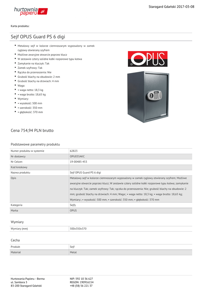 Starogard Gdański 2017-03-08 Karta produktu: Sejf OPUS Guard PS 6 digi Metalowy sejf w kolorze ciemnoszarym wyposażony w zamek ryglowy otwierany szyfrem Możliwe awaryjne otwarcie poprzez klucz W zestawie cztery solidne kołki rozporowe typu kotwa Zamykanie na kluczyk: Tak Zamek szyfrowy: Tak Rączka do przenoszenia: Nie Grubość blachy na obudowie: 2 mm Grubość blachy na drzwiach: 4 mm Waga: • waga netto: 18,3 kg • waga brutto: 18,65 kg Wymiary: • wysokość: 500 mm • szerokość: 350 mm • głębokość: 370 mm Cena 754,94 PLN brutto Podstawowe parametry produktu Numer produktu w systemie 62823 Nr dostawcy OPU035AKC Nr Celcen 19-00485-453 Kod kreskowy Nazwa produktu Sejf OPUS Guard PS 6 digi Opis Metalowy sejf w kolorze ciemnoszarym wyposażony w zamek ryglowy otwierany szyfrem; Możliwe awaryjne otwarcie poprzez klucz; W zestawie cztery solidne kołki rozporowe typu kotwa; zamykanie na kluczyk: Tak; zamek szyfrowy: Tak; rączka do przenoszenia: Nie; grubość blachy na obudowie: 2 mm; grubość blachy na drzwiach: 4 mm; Waga:; • waga netto: 18,3 kg; • waga brutto: 18,65 kg; Wymiary:; • wysokość: 500 mm; • szerokość: 350 mm; • głębokość: 370 mm Kategoria Sejfy Marka OPUS Wymiary Wymiary (mm) 500x350x370 Cecha Produkt Sejf Materiał Metal Hurtowania Papieru - Borma ul. Sambora 3 83-200 Starogard Gdański NIP: 592 10 36 627 REGON: 190916154 +48 (58) 56 221 37 Starogard Gdański 2017-03-08 Karta katalogowa produktu cd. Sejf OPUS Guard PS 6 digi Kolor Kolor Ciemnoszary Certyfikaty Nowy produkt w ofercie Standard Hit Standard Pozostałe zdjęcia produktu Serdecznie zapraszamy do współpracy Hurtowania Papieru - Borma zespół. Hurtowania Papieru - Borma ul. Sambora 3 83-200 Starogard Gdański NIP: 592 10 36 627 REGON: 190916154 +48 (58) 56 221 37