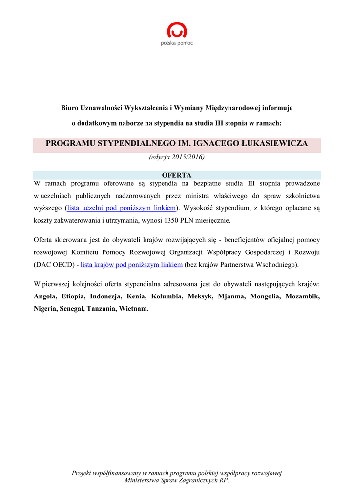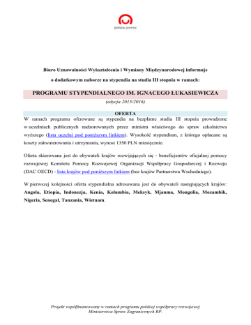 Biuro Uznawalności Wykształcenia i Wymiany Międzynarodowej informuje o dodatkowym naborze na stypendia na studia III stopnia w ramach: PROGRAMU STYPENDIALNEGO IM. IGNACEGO ŁUKASIEWICZA (edycja 2015/2016) OFERTA W ramach programu oferowane są stypendia na bezpłatne studia III stopnia prowadzone w uczelniach publicznych nadzorowanych przez ministra właściwego do spraw szkolnictwa wyższego (lista uczelni pod poniższym linkiem). Wysokość stypendium, z którego opłacane są koszty zakwaterowania i utrzymania, wynosi 1350 PLN miesięcznie. Oferta skierowana jest do obywateli krajów rozwijających się - beneficjentów oficjalnej pomocy rozwojowej Komitetu Pomocy Rozwojowej Organizacji Współpracy Gospodarczej i Rozwoju (DAC OECD) - lista krajów pod poniższym linkiem (bez krajów Partnerstwa Wschodniego). W pierwszej kolejności oferta stypendialna adresowana jest do obywateli następujących krajów: Angola, Etiopia, Indonezja, Kenia, Kolumbia, Meksyk, Mjanma, Mongolia, Mozambik, Nigeria, Senegal, Tanzania, Wietnam. Projekt współfinansowany w ramach programu polskiej współpracy rozwojowej Ministerstwa Spraw Zagranicznych RP. STUDIA III STOPNIA Stypendia oferowane na studia III stopnia w następujących dziedzinach nauk: matematycznych, fizycznych, chemicznych, biologicznych, nauk o Ziemi, technicznych, rolniczych, leśnych i weterynaryjnych1. Profil kandydata: absolwent studiów magisterskich lub równoważnych ukończonych nie dawniej niż 3 lata temu (nie dotyczy osób już studiujących w Polsce na studiach III stopnia);; preferowani będą absolwenci studiów magisterskich lub równoważnych ukończonych w kraju pochodzenia kandydatów (nie wyklucza to jednak możliwości ubiegania się o stypendium przez osoby posiadające dyplom ukończenia polskiej uczelni); O stypendium mogą ubiegać się osoby, które już kształcą się na studiach III stopnia w Polsce. W tym przypadku wymagane jest, aby kandydaci na stypendia odbywali studia na warunkach przewidzianych dla cudzoziemców, nie ponosząc jednocześnie kosztów kształcenia. Rekrutacja: Kandydaci samodzielnie dokonują wyboru uczelni i kierunku studiów, na których chcą podjąć naukę spośród oferty edukacyjnej polskich uczelni publicznych nadzorowanych przez ministra właściwego do spraw szkolnictwa wyższego. Kandydat zobowiązany jest zarejestrować się na studia oraz spełnić wymagania uczelni dotyczące rekrutacji na wybrany przez siebie kierunek studiów – pozytywne przejście procesu rekrutacji na uczelni nie jest jednoznaczne z przyznaniem stypendium. Ewentualna zmiana dotychczasowego kierunku studiów jest dopuszczalna w ramach tej samej dziedziny nauk. Kwestionariusz kandydata należy pobrać ze strony Biura Uznawalności Wykształcenia i Wymiany Międzynarodowej (do pobrania pod adresem www.buwiwm.home.pl/wym/kwest.docx www.buwiwm.home.pl/wym/kwest.pdf ). Kandydaci zobowiązani są dostarczyć, za pośrednictwem uczelni przyjmującej cudzoziemca na studia III stopnia, do Biura Uznawalności Wykształcenia i Wymiany Międzynarodowej wypełniony i podpisany kwestionariusz wraz z następującymi załącznikami: konspektem pracy doktorskiej sporządzonym według następującej specyfikacji: 4-5 stron formatu a4, czcionka 12, odstęp 1,5; wymagane elementy opisu to: propozycja tematu, 1 Informacje na temat dziedzin nauk – załącznik nr 1 do ogłoszenia. Projekt współfinansowany w ramach programu polskiej współpracy rozwojowej Ministerstwa Spraw Zagranicznych RP. problemu badawczego, hipotezy głównej i metody badawczej pracy, szczegółowy opis rozdziałów); kopią dyplomu (wraz z suplementem) ukończenia studiów magisterskich uprawniającego do podjęcia studiów doktoranckich w państwie jego wydania (nie dotyczy osób już studiujących w Polsce na studiach III stopnia); dokumentem potwierdzającym przyjęcie przez uczelnię (lub promesę przyjęcia), w trybie przewidzianym dla cudzoziemców, na studia III stopnia ze stypendium ministra nauki i szkolnictwa wyższego z zaznaczeniem, iż warunki finansowe ulegną zmianie w przypadku gdy cudzoziemiec nie uzyska stypendium (nie dotyczy osób już studiujących w Polsce na studiach III stopnia); opiniami dwóch samodzielnych pracowników naukowych (prof. lub dr hab.), w tym co najmniej jednego z Polski); życiorysem wraz z listem motywacyjnym; kopią zaświadczenia o stanie zdrowia; kopią paszportu; kopią dokumentu uprawniającego do pobytu na terytorium RP (dotyczy osób już studiujących w Polsce lub posiadających ważną wizę). Dokumenty wydane w innym języku niż język polski muszą zostać przetłumaczone na język polski lub angielski. TERMIN SKŁADANIA APLIKACJI UPŁYWA Z DNIEM 7 WRZEŚNIA 2015 R. Wnioski niekompletne nie będą rozpatrywane. Procedura naboru: Weryfikacja kandydatur pod względem spełniania wymogów formalnych programu i wyłonienie stypendystów przeprowadzone zostanie na podstawie dokumentów złożonych przez kandydatów. Informacje o wyniku naboru zostaną przekazane kandydatom za pośrednictwem uczelni przyjmujących do dnia 30 WRZEŚNIA 2015 r. Dodatkowe informacje: Językiem studiów jest zasadniczo język polski, ale za zgodą uczelni przyjmującej możliwe są studia w innym języku. Po pierwszym roku stypendyści będą mogli wziąć udział w wymianie studenckiej w ramach programu Erasmus (dotyczy uczelni, które zawarły stosowne umowy z uczelniami zagranicznymi). Projekt współfinansowany w ramach programu polskiej współpracy rozwojowej Ministerstwa Spraw Zagranicznych RP. OBOWIĄZKI UCZESTNIKA PROGRAMU IM. I. ŁUKASIEWICZA. 1. Stypendia są realizowane na warunkach ogólnych, określonych w rozporządzeniu Ministra Nauki i Szkolnictwa Wyższego z dnia 12 października 2006 roku w sprawie podejmowania i odbywania przez cudzoziemców studiów i szkoleń oraz ich uczestniczenia w badaniach naukowych i pracach rozwojowych (Dz.U. z 2006r. Nr 190, poz.1406 z późn. zm). 2. Realizację stypendiów 