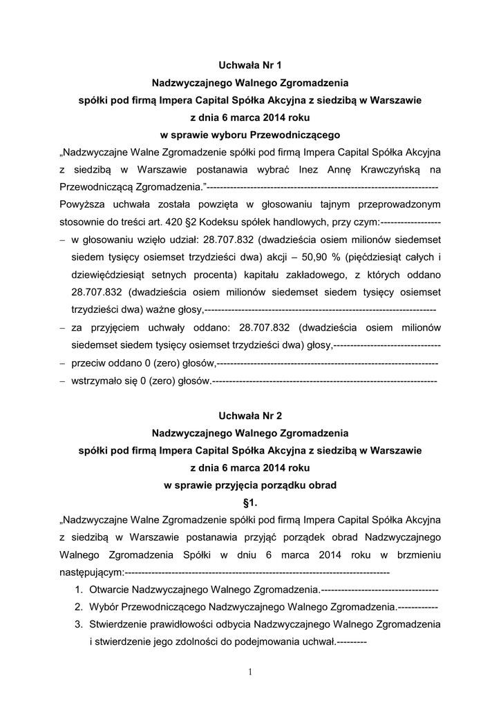 Uchwała Nr 1 Nadzwyczajnego Walnego Zgromadzenia spółki pod firmą Impera Capital Spółka Akcyjna z siedzibą w Warszawie z dnia 6 marca 2014 roku w sprawie wyboru Przewodniczącego „Nadzwyczajne Walne Zgromadzenie spółki pod firmą Impera Capital Spółka Akcyjna z siedzibą w Warszawie postanawia wybrać Inez Annę Krawczyńską na Przewodniczącą Zgromadzenia.”--------------------------------------------------------------------Powyższa uchwała została powzięta w głosowaniu tajnym przeprowadzonym stosownie do treści art. 420 §2 Kodeksu spółek handlowych, przy czym:----------------- w głosowaniu wzięło udział: 28.707.832 (dwadzieścia osiem milionów siedemset siedem tysięcy osiemset trzydzieści dwa) akcji – 50,90 % (pięćdziesiąt całych i dziewięćdziesiąt setnych procenta) kapitału zakładowego, z których oddano 28.707.832 (dwadzieścia osiem milionów siedemset siedem tysięcy osiemset trzydzieści dwa) ważne głosy,-------------------------------------------------------------------- za przyjęciem uchwały oddano: 28.707.832 (dwadzieścia osiem milionów siedemset siedem tysięcy osiemset trzydzieści dwa) głosy,------------------------------- przeciw oddano 0 (zero) głosów,----------------------------------------------------------------- wstrzymało się 0 (zero) głosów.------------------------------------------------------------------Uchwała Nr 2 Nadzwyczajnego Walnego Zgromadzenia spółki pod firmą Impera Capital Spółka Akcyjna z siedzibą w Warszawie z dnia 6 marca 2014 roku w sprawie przyjęcia porządku obrad §1. „Nadzwyczajne Walne Zgromadzenie spółki pod firmą Impera Capital Spółka Akcyjna z siedzibą w Warszawie postanawia przyjąć porządek obrad Nadzwyczajnego Walnego Zgromadzenia Spółki w dniu 6 marca 2014 roku w brzmieniu następującym:------------------------------------------------------------------------------1. Otwarcie Nadzwyczajnego Walnego Zgromadzenia.----------------------------------2. Wybór Przewodniczącego Nadzwyczajnego Walnego Zgromadzenia.-----------3. Stwierdzenie prawidłowości odbycia Nadzwyczajnego Walnego Zgromadzenia i stwierdzenie jego zdolności do podejmowania uchwał.--------1 4. Sporządzenie listy obecności.----------------------------------------------------------------5. Przyjęcie porządku obrad Nadzwyczajnego Walnego Zgromadzenia.-----------6. Powzięcie uchwały w sprawie wyrażenia zgody na nabycie akcji własnych, umorzenia akcji własnych, obniżenia kapitału zakładowego oraz zmiany Statutu Spółki.-----------------------------------------------------------------------------------7. Powzięcie uchwały w sprawie scalenia (połączenia) akcji Spółki oraz zmiany Statutu Spółki.-----------------------------------------------------------------------------------8. Powzięcie uchwały w sprawie wyrażenia przez Nadzwyczajne Walne Zgromadzenie Spółki zgody i potwierdzenie czynności prawnych dokonanych przez Spółkę z Członkiem Zarządu i Prokurentem, których skutkiem było objęcie przez wskazane osoby obligacji Spółki.----------------------9. Zmiany w składzie Rady Nadzorczej.-----------------------------------------------------10. Powzięcie uchwały w sprawie upoważnienia Rady Nadzorczej do ustalenia jednolitego tekstu zmienionego Statutu Spółki.-----------------------------------------11. Zamknięcie obrad Nadzwyczajnego Walnego Zgromadzenia.----------------------§2. Uchwała wchodzi w życie z dniem podjęcia.” ---------------------------------------------------Po głosowaniu Przewodnicząca ogłosiła wyniki: ----------------------------------------------- w głosowaniu wzięło udział: 28.707.832 (dwadzieścia osiem milionów siedemset siedem tysięcy osiemset trzydzieści dwa) akcji – 50,90 % (pięćdziesiąt całych i dziewięćdziesiąt setnych procenta) kapitału zakładowego, z których oddano 28.707.832 (dwadzieścia osiem milionów siedemset siedem tysięcy osiemset trzydzieści dwa) ważne głosy,-------------------------------------------------------------------- za przyjęciem uchwały oddano: 28.707.832 (dwadzieścia osiem milionów siedemset siedem tysięcy osiemset trzydzieści dwa) głosy,------------------------------- przeciw oddano 0 (zero) głosów,----------------------------------------------------------------- wstrzymało się 0 (zero) głosów.------------------------------------------------------------------Uchwała Nr 3 Nadzwyczajnego Walnego Zgromadzenia spółki pod firmą Impera Capital Spółka Akcyjna z siedzibą w Warszawie z dnia 6 marca 2014 roku w sprawie wyrażenia zgody na nabycie akcji własnych, umorzenia akcji własnych, obniżenia kapitału zakładowego 2 oraz zmiany Statutu Spółki §1. Nadzwyczajne Walne Zgromadzenie spółki pod firmą Impera Capital Spółka Akcyjna z siedzibą w Warszawie działając na podstawie art. 359 § 1, 360 oraz 430 Kodeksu spółek postanawia co następuje:--------------------------------------------------------I. 1. W związku z planowanym scaleniem akcji Spółki w celu dostosowania liczby akcji do parytetu scalenia wyraża się zgodę na nieodpłatne nabycie przez Spółkę akcji własnych Spółki w celu ich umorzenia oraz upoważnia się Zarząd Spółki do podjęcia wszelkich czynności niezbędnych do nabycia akcji własnych Spółki.--------------------------------------------------------------------------------2. Umorzenie, o którym mowa w zdaniu poprzednim stanowi umorzenie dobrowolne w rozumieniu art. 359 § 1 zd. 2 Kodeksu spółek handlowych tj. jest realizowane za zgodą akcjonariusza w drodze nabycia akcji przez Spółkę. Uzasadnieniem nieodpłatnego umorzenia akcji, obniżenia kapitału i związanej z tym zmiany Statutu jest potrzeba dostosowania liczby akcji do parytetu wymiany (scalenia) akcji w celu umożliwienia skutecznego scalenia. Nieodpłatnemu umorzeniu podlegać będzie 731 akcji o wartości nominalnej 0,10 zł (dziesięć groszy) każda i aktualnej w
