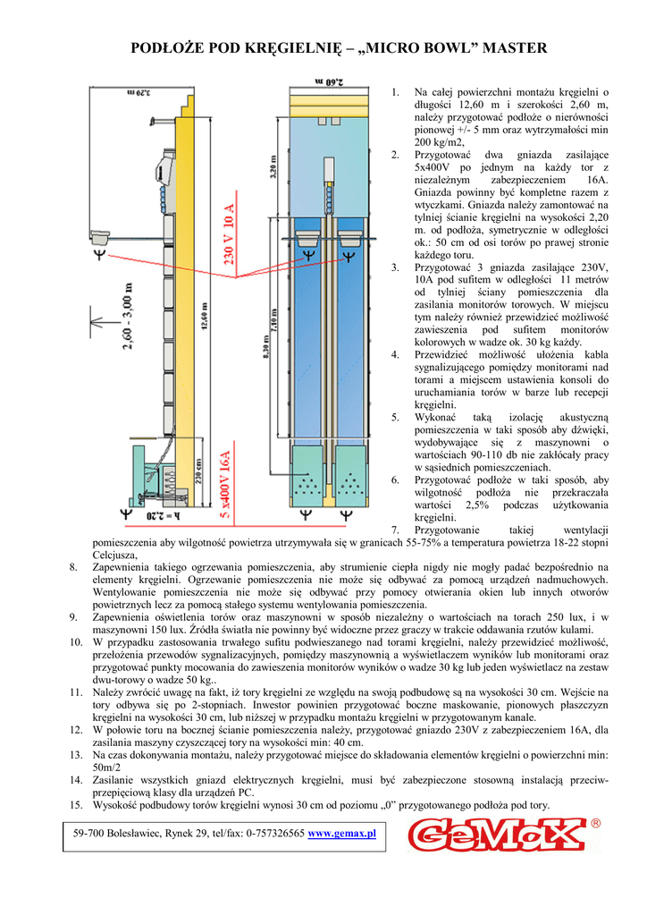 PODŁOŻE POD KRĘGIELNIĘ – „MICRO BOWL” MASTER 1. 8. 9. 10. 11. 12. 13. 14. 15. Na całej powierzchni montażu kręgielni o długości 12,60 m i szerokości 2,60 m, należy przygotować podłoże o nierówności pionowej +/- 5 mm oraz wytrzymałości min 200 kg/m2, 2. Przygotować dwa gniazda zasilające 5x400V po jednym na każdy tor z niezależnym zabezpieczeniem 16A. Gniazda powinny być kompletne razem z wtyczkami. Gniazda należy zamontować na tylniej ścianie kręgielni na wysokości 2,20 m. od podłoża, symetrycznie w odległości ok.: 50 cm od osi torów po prawej stronie każdego toru. 3. Przygotować 3 gniazda zasilające 230V, 10A pod sufitem w odległości 11 metrów od tylniej ściany pomieszczenia dla zasilania monitorów torowych. W miejscu tym należy również przewidzieć możliwość zawieszenia pod sufitem monitorów kolorowych w wadze ok. 30 kg każdy. 4. Przewidzieć możliwość ułożenia kabla sygnalizującego pomiędzy monitorami nad torami a miejscem ustawienia konsoli do uruchamiania torów w barze lub recepcji kręgielni. 5. Wykonać taką izolację akustyczną pomieszczenia w taki sposób aby dźwięki, wydobywające się z maszynowni o wartościach 90-110 db nie zakłócały pracy w sąsiednich pomieszczeniach. 6. Przygotować podłoże w taki sposób, aby wilgotność podłoża nie przekraczała wartości 2,5% podczas użytkowania kręgielni. 7. Przygotowanie takiej wentylacji pomieszczenia aby wilgotność powietrza utrzymywała się w granicach 55-75% a temperatura powietrza 18-22 stopni Celcjusza, Zapewnienia takiego ogrzewania pomieszczenia, aby strumienie ciepła nigdy nie mogły padać bezpośrednio na elementy kręgielni. Ogrzewanie pomieszczenia nie może się odbywać za pomocą urządzeń nadmuchowych. Wentylowanie pomieszczenia nie może się odbywać przy pomocy otwierania okien lub innych otworów powietrznych lecz za pomocą stałego systemu wentylowania pomieszczenia. Zapewnienia oświetlenia torów oraz maszynowni w sposób niezależny o wartościach na torach 250 lux, i w maszynowni 150 lux. Źródła światła nie powinny być widoczne przez graczy w trakcie oddawania rzutów kulami. W przypadku zastosowania trwałego sufitu podwieszanego nad torami kręgielni, należy przewidzieć możliwość, przełożenia przewodów sygnalizacyjnych, pomiędzy maszynownią a wyświetlaczem wyników lub monitorami oraz przygotować punkty mocowania do zawieszenia monitorów wyników o wadze 30 kg lub jeden wyświetlacz na zestaw dwu-torowy o wadze 50 kg.. Należy zwrócić uwagę na fakt, iż tory kręgielni ze względu na swoją podbudowę są na wysokości 30 cm. Wejście na tory odbywa się po 2-stopniach. Inwestor powinien przygotować boczne maskowanie, pionowych płaszczyzn kręgielni na wysokości 30 cm, lub niższej w przypadku montażu kręgielni w przygotowanym kanale. W połowie toru na bocznej ścianie pomieszczenia należy, przygotować gniazdo 230V z zabezpieczeniem 16A, dla zasilania maszyny czyszczącej tory na wysokości min: 40 cm. Na czas dokonywania montażu, należy przygotować miejsce do składowania elementów kręgielni o powierzchni min: 50m/2 Zasilanie wszystkich gniazd elektrycznych kręgielni, musi być zabezpieczone stosowną instalacją przeciwprzepięciową klasy dla urządzeń PC. Wysokość podbudowy torów kręgielni wynosi 30 cm od poziomu „0” przygotowanego podłoża pod tory. 59-700 Bolesławiec, Rynek 29, tel/fax: 0-757326565 www.gemax.pl